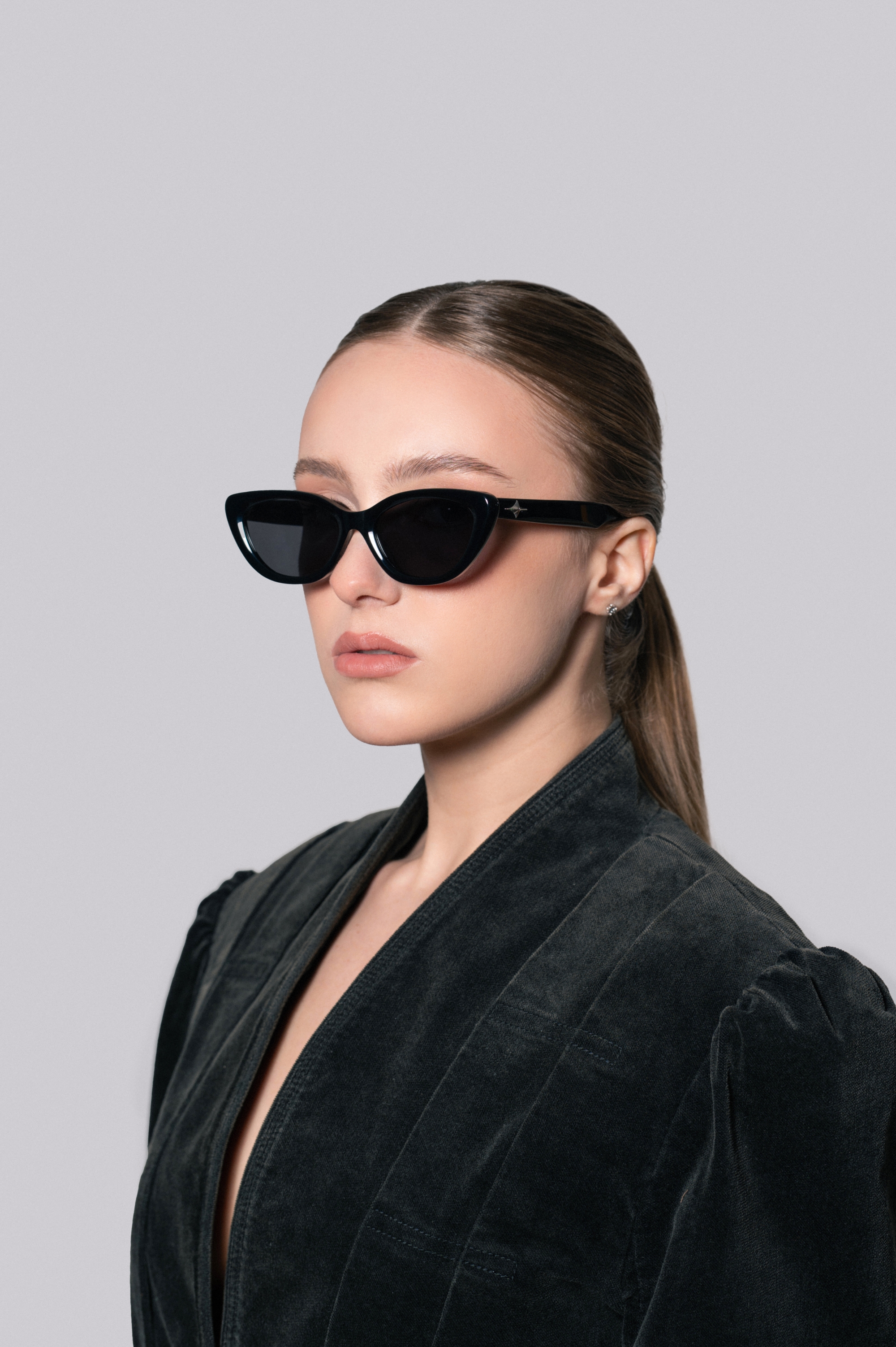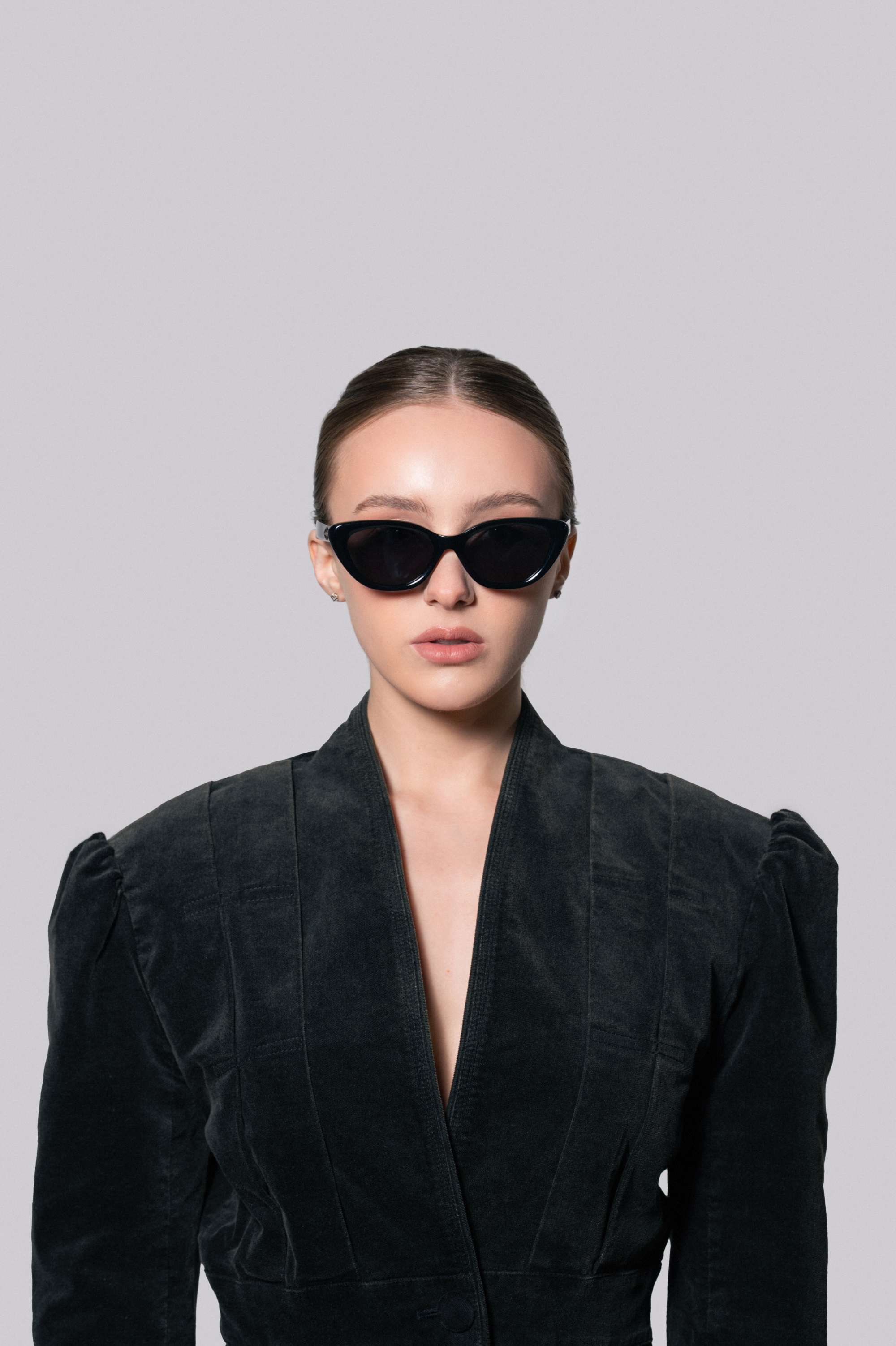 Очки-кошки с черной оправой и черными стеклами. Идеальный выбор для этого лета.