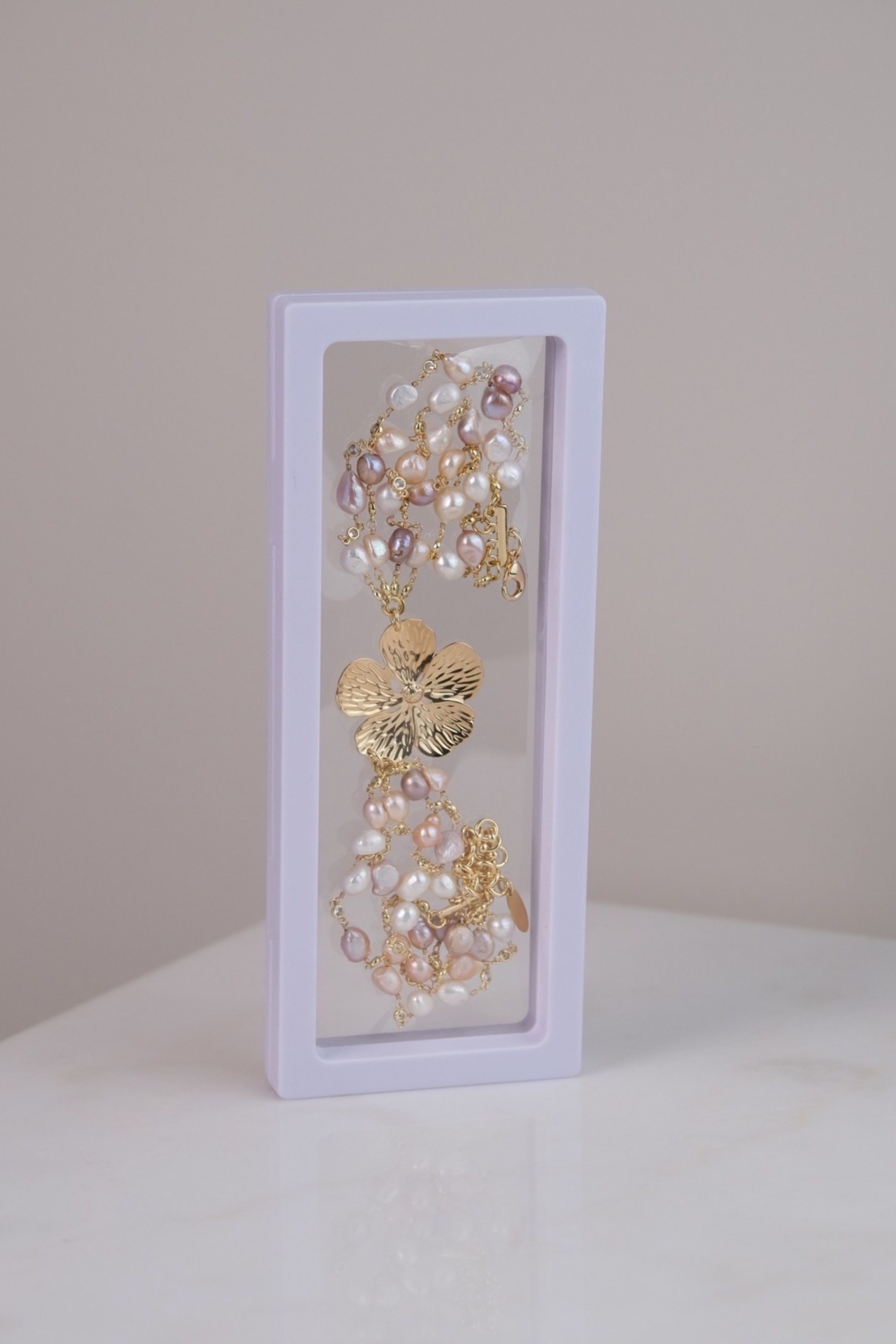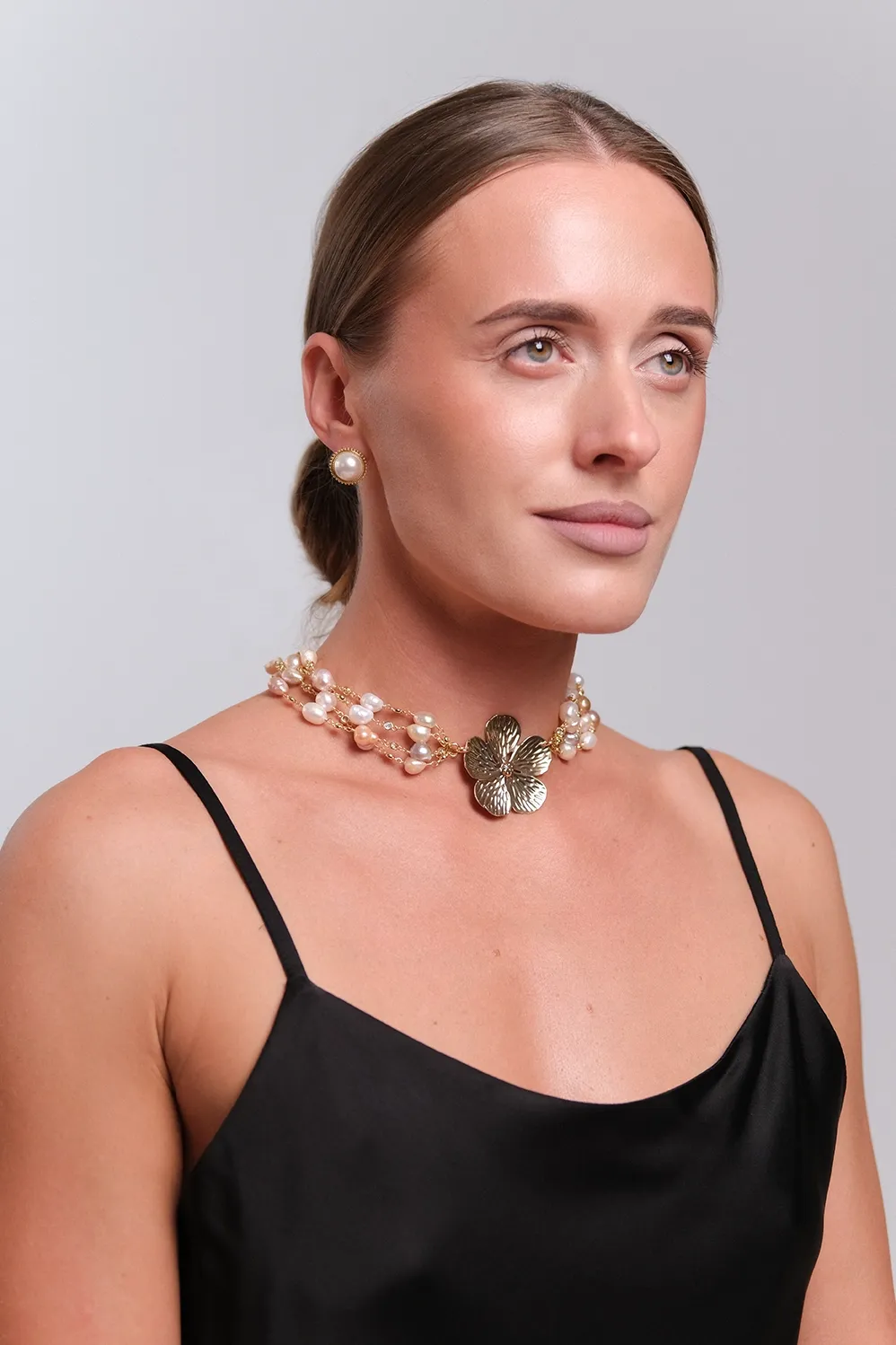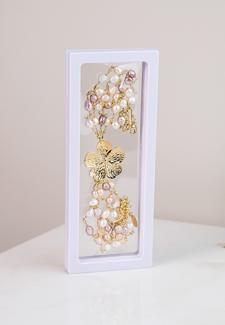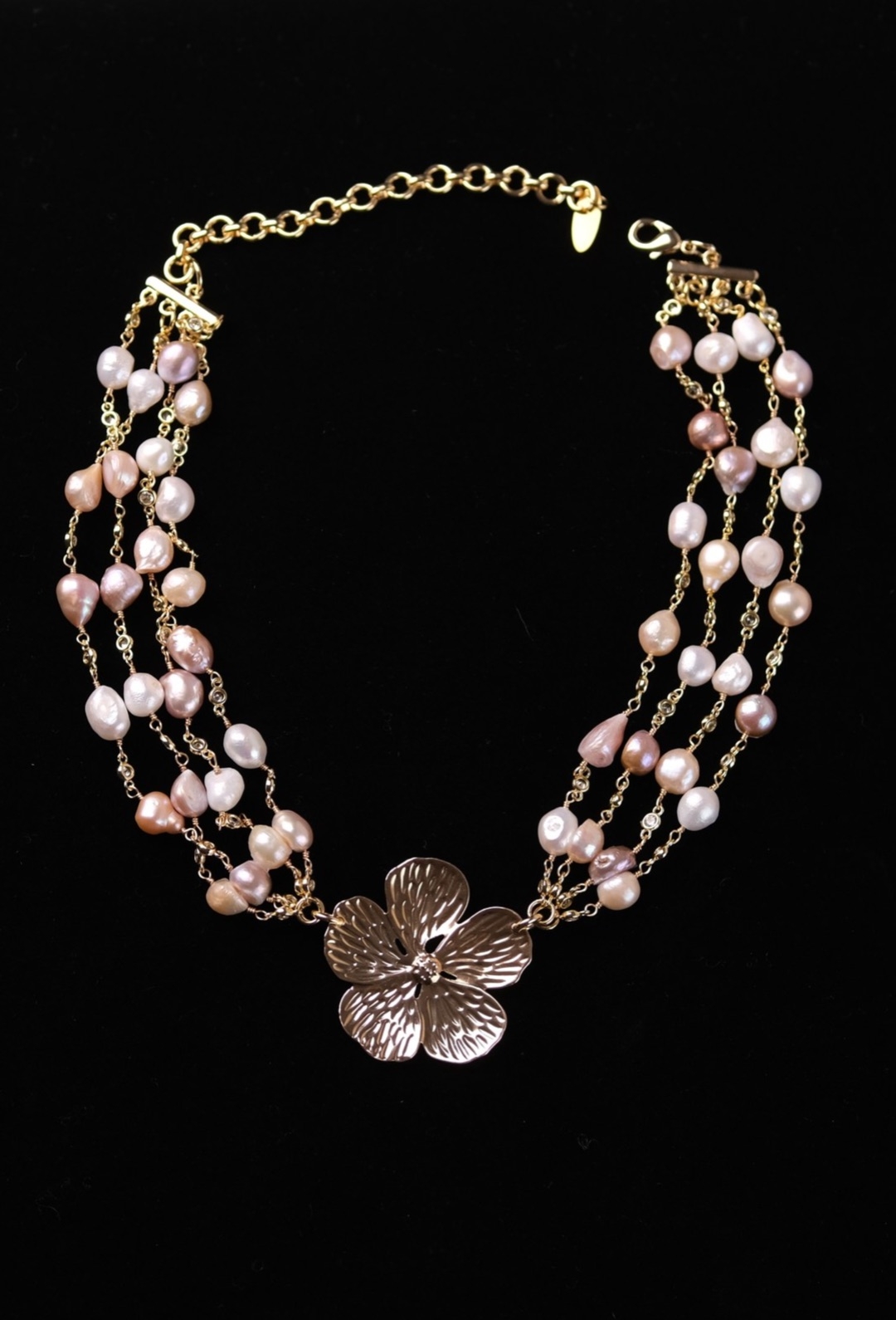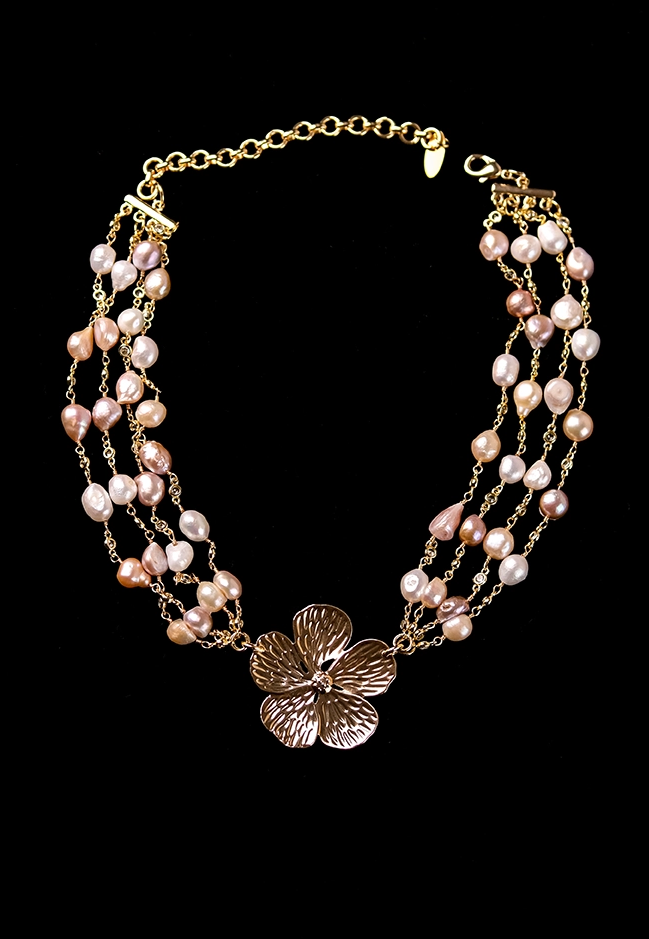 Романтичное колье "Цветок" из культивированного жемчуга розового и белого цвета идеально подойдет к любому костюму, платью или топу.