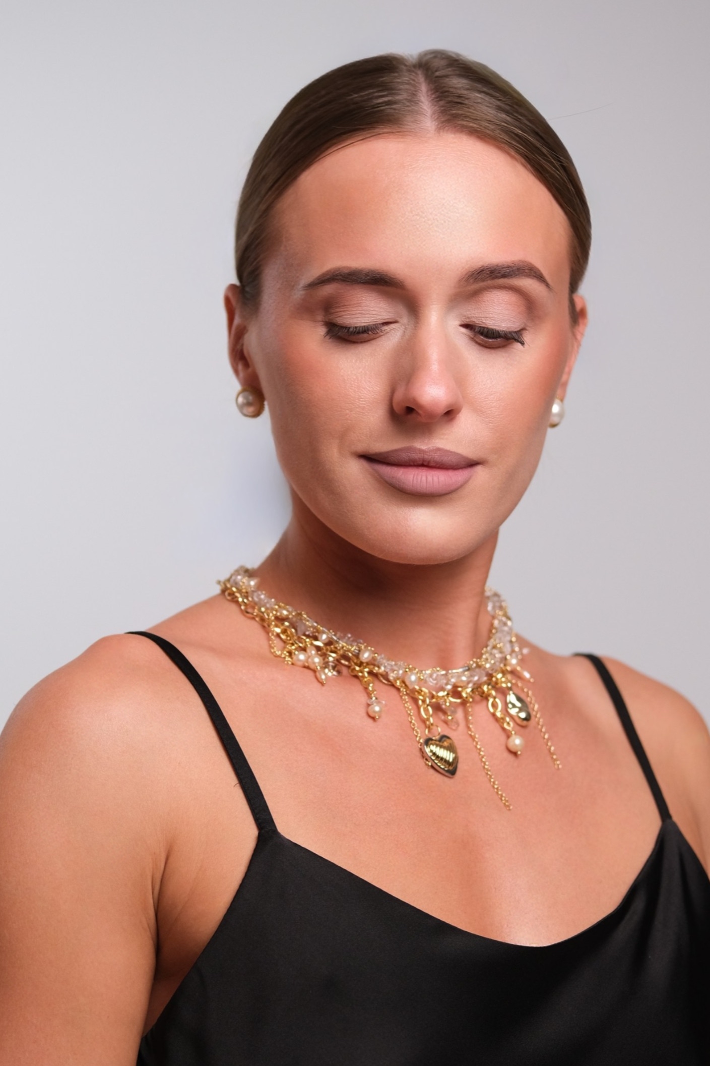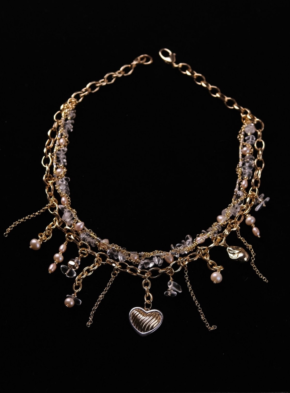 Колье "Сердечко" комбинированное, состоящее из культивированного жемчуга, кристаллов кварца и очаровательных золотых и серебрянных деталей, дополнит ваш вечерний или повседневный гардероб и добавит трогательный акцент вашему образу.
