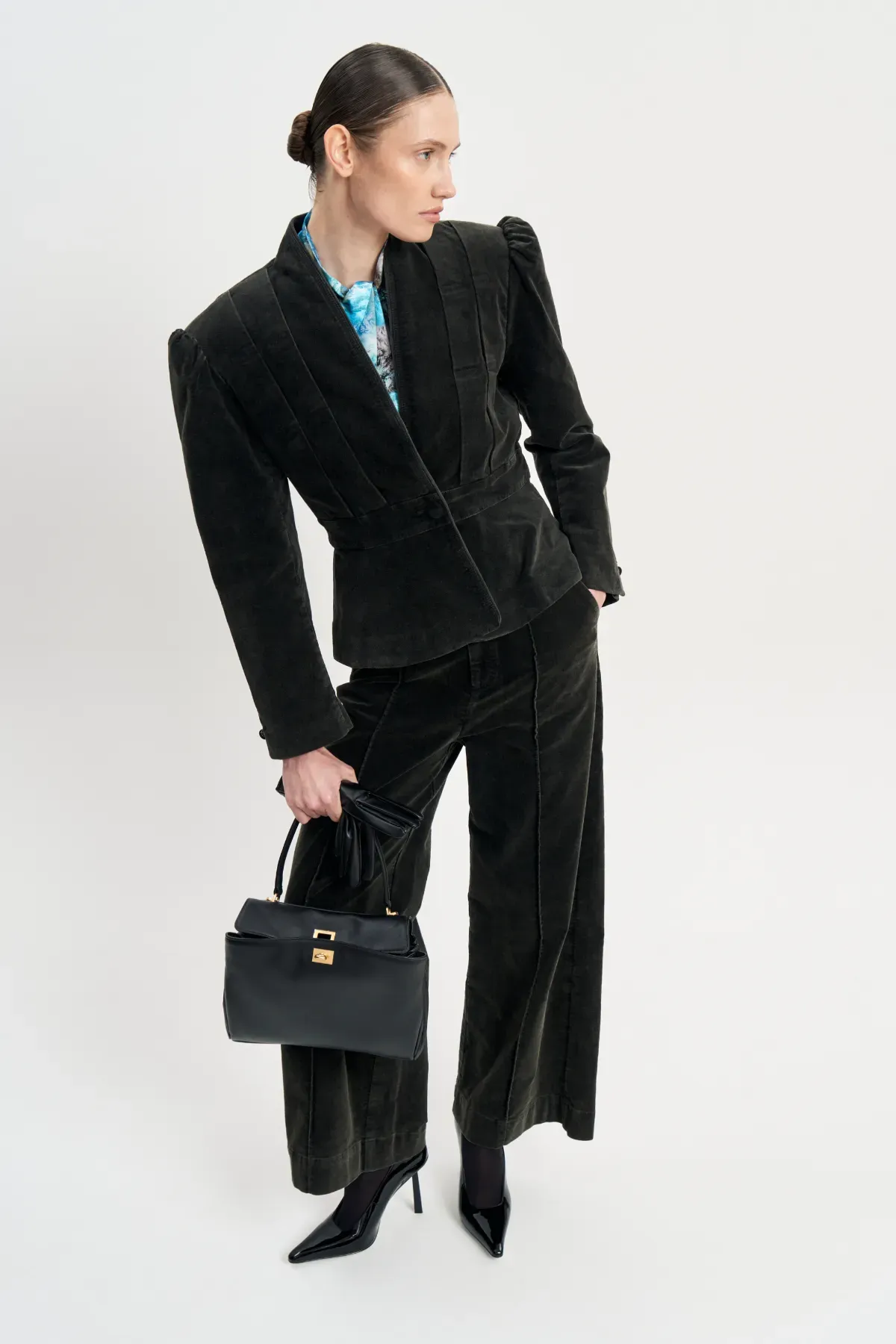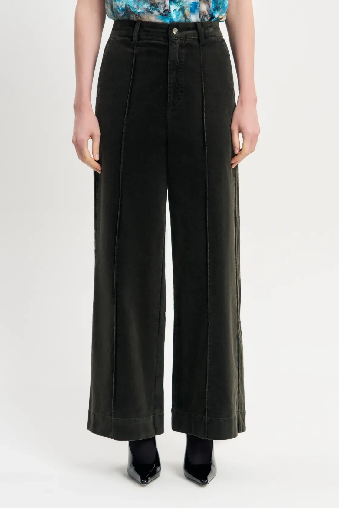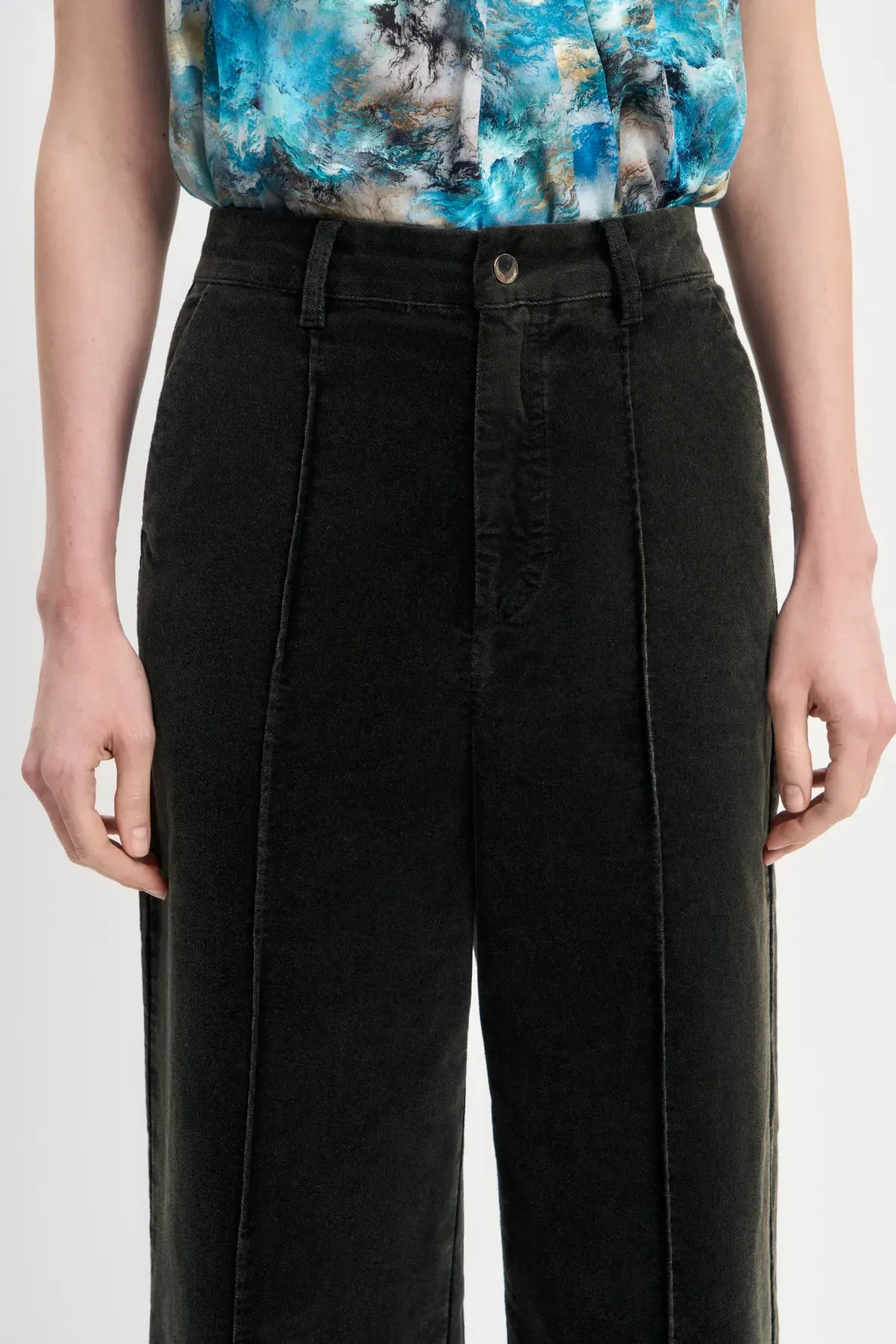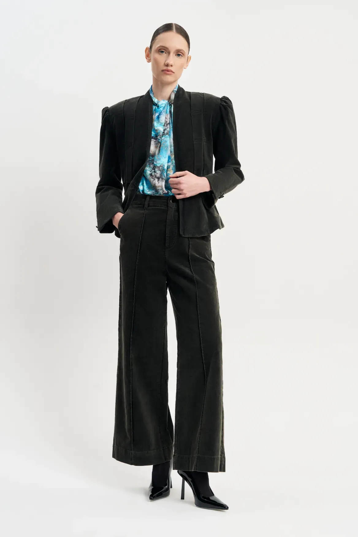 Необычная текстура ткани, бархат на джинсовой хлопковой основе, не только делает брюки шикарными и запоминающимися, но также комфортными и дышащими. Прекрасная посадка на талии. Брюки идеально сочетаются с бархатным жакетом Нуар.