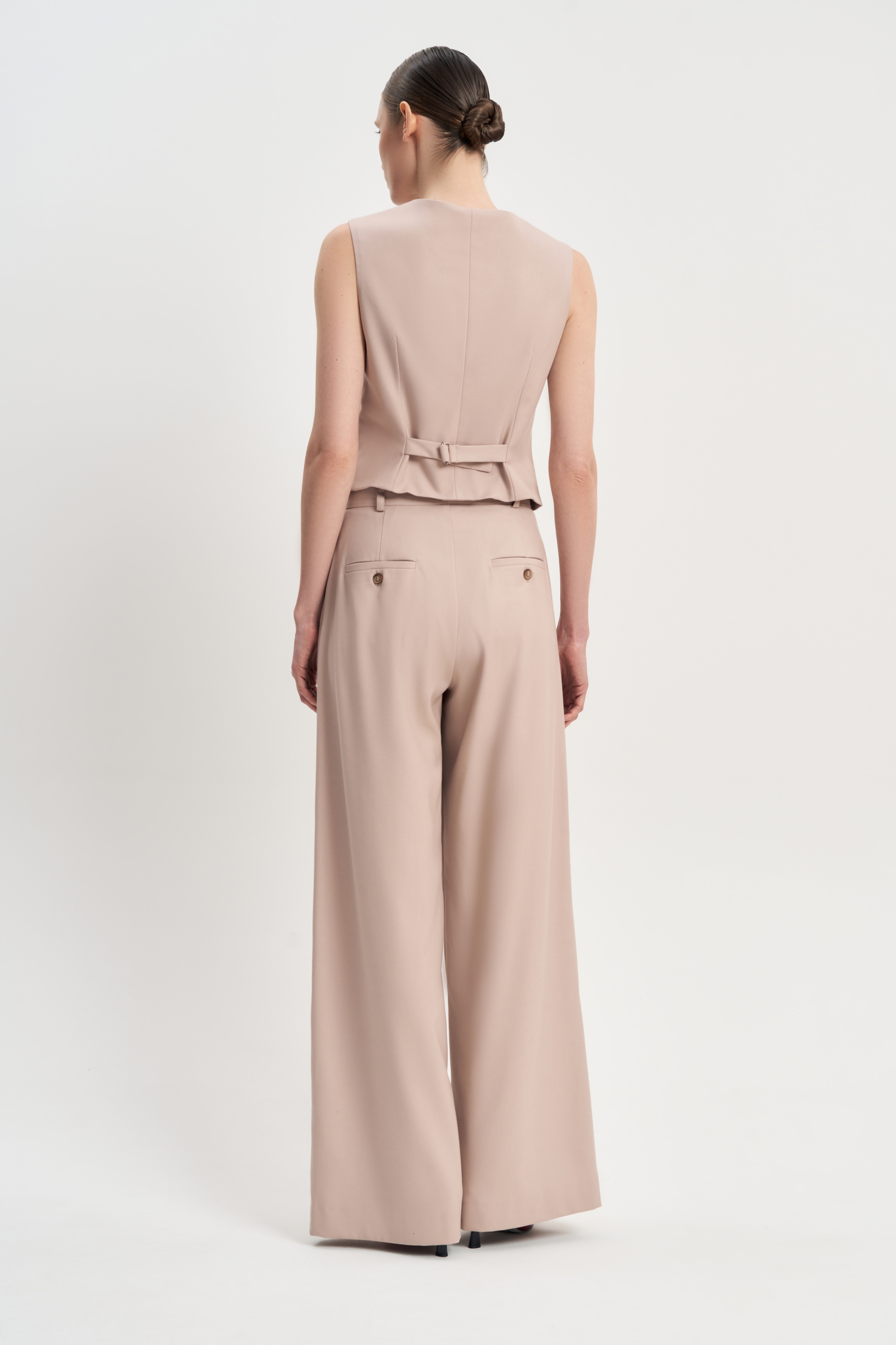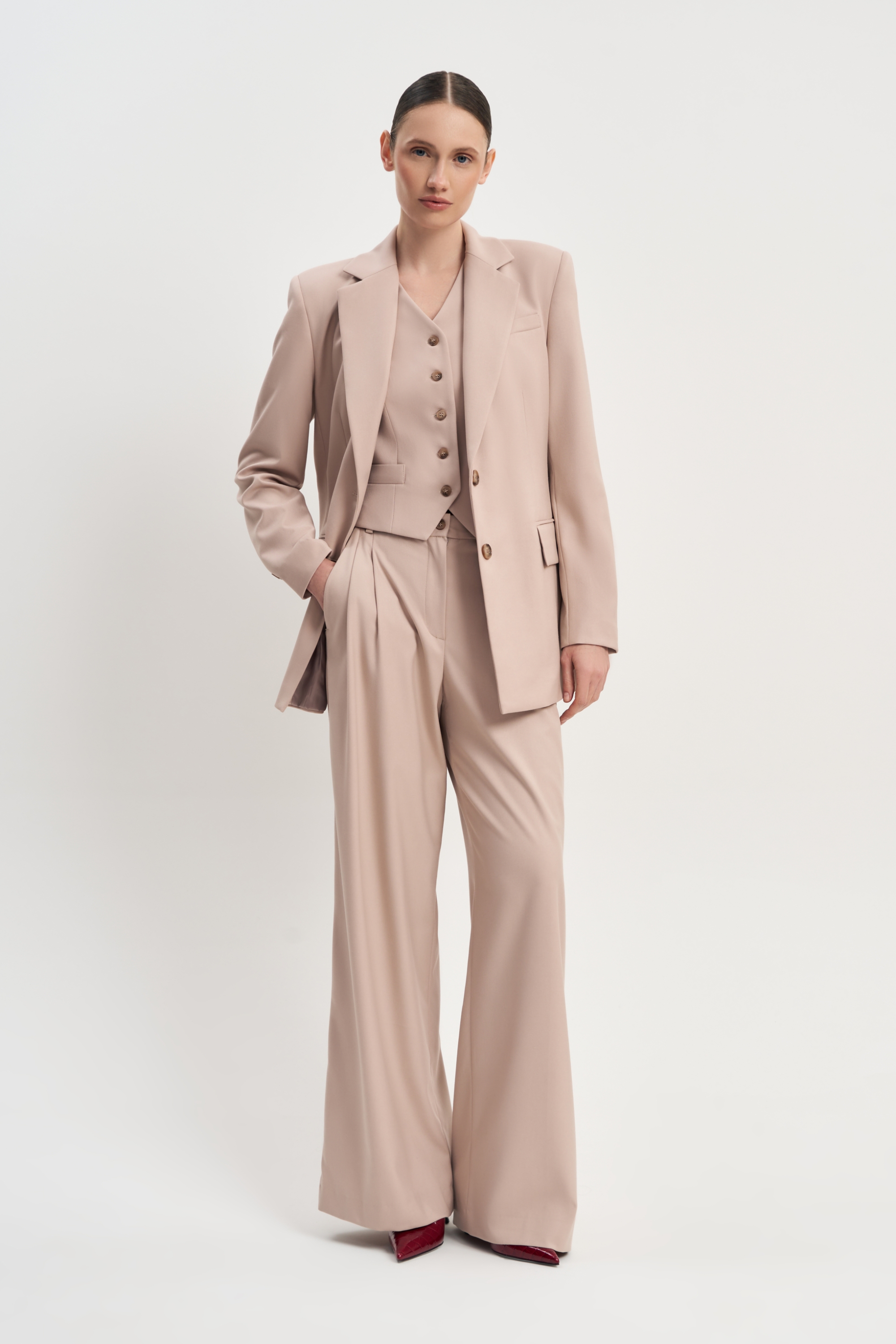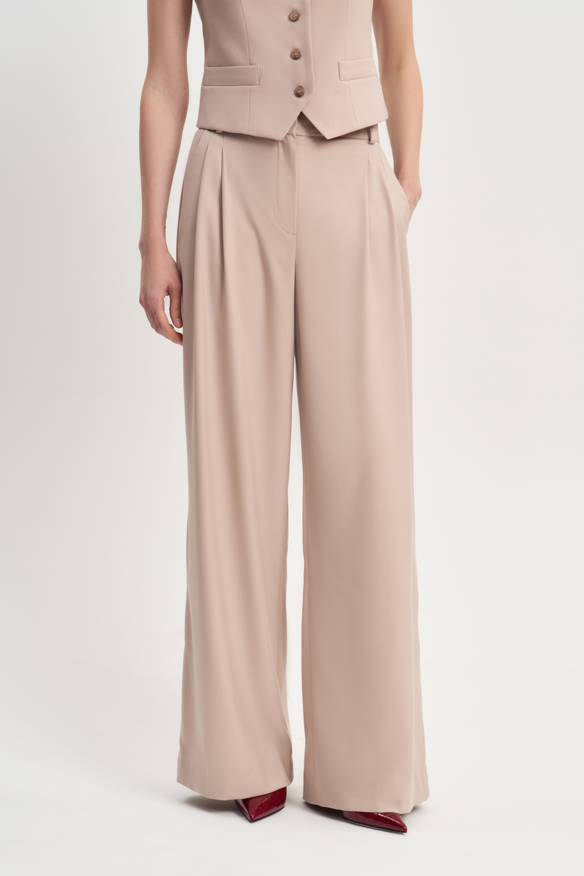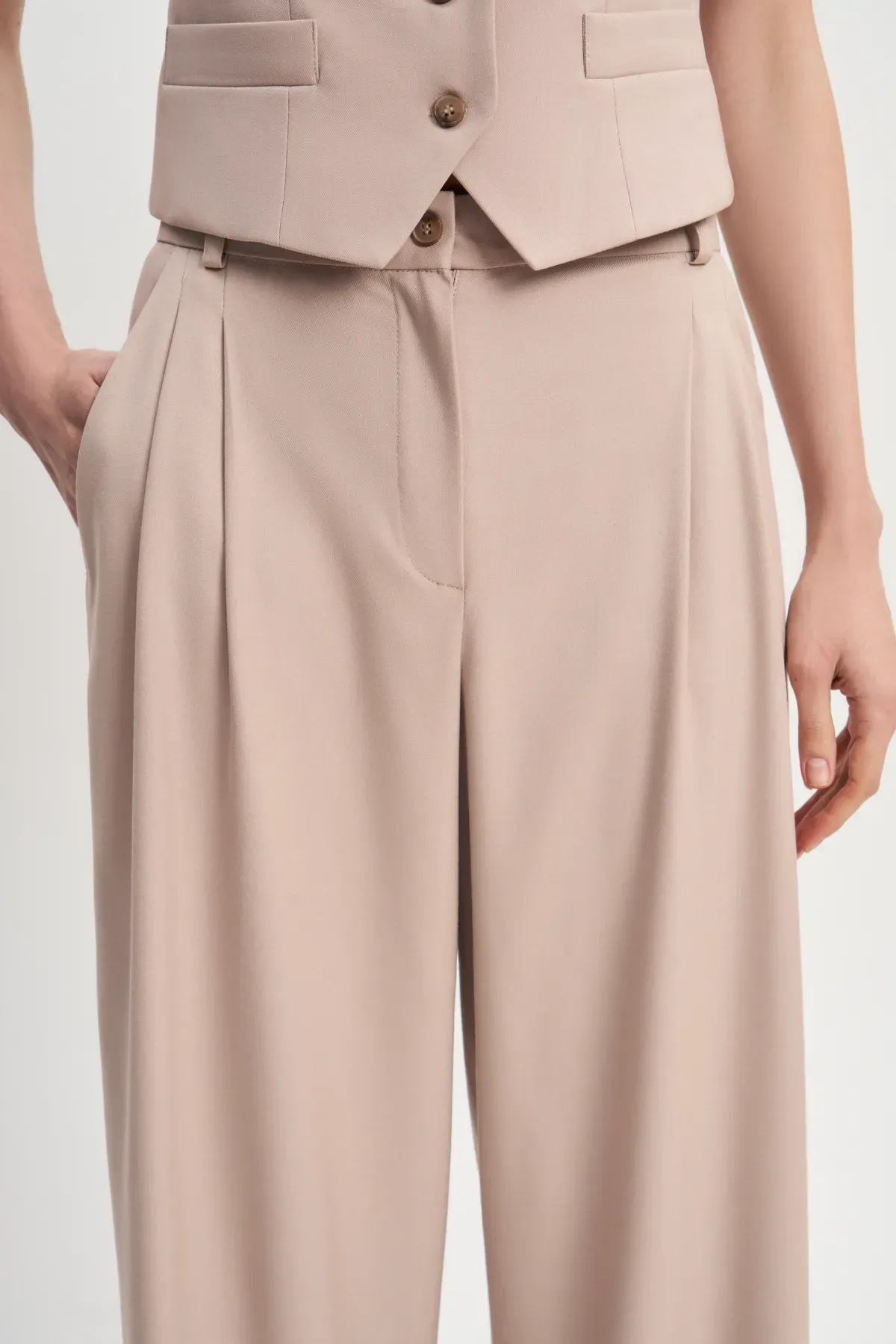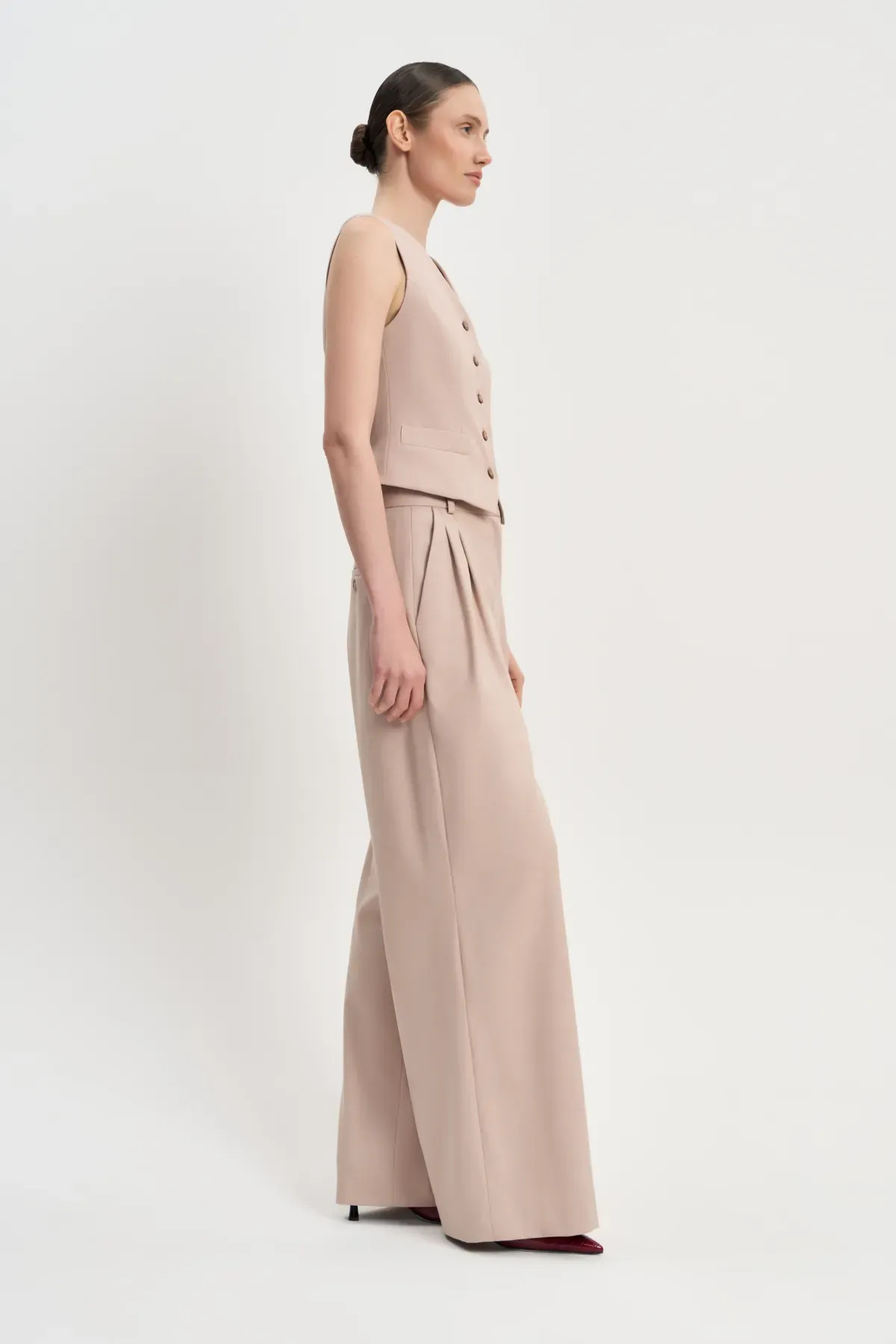 Широкие струящиеся брюки Макси/Макси идеально посажены на талию и вместе с необычным пиджаком Макси/Макси создают роскошный городской образ.