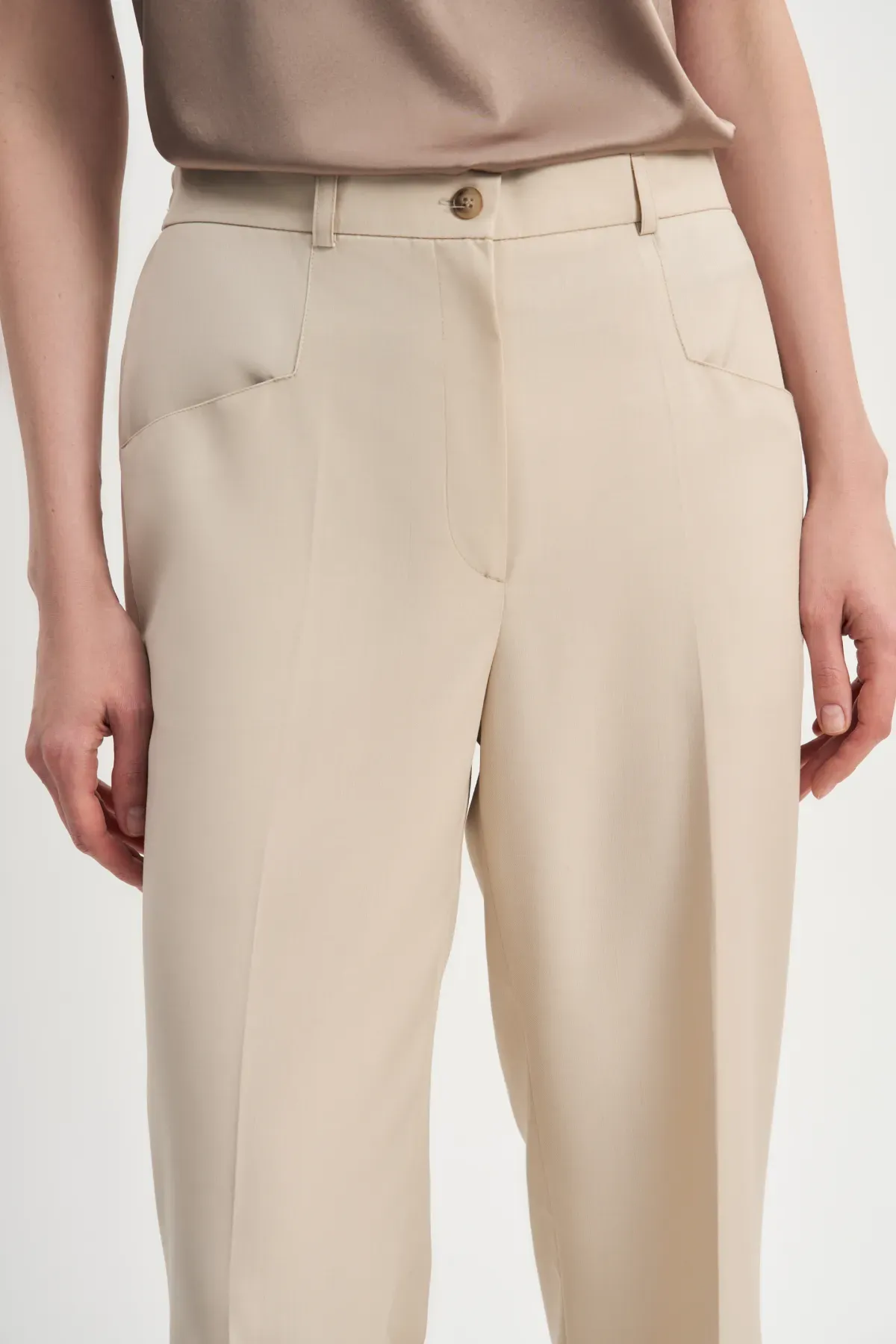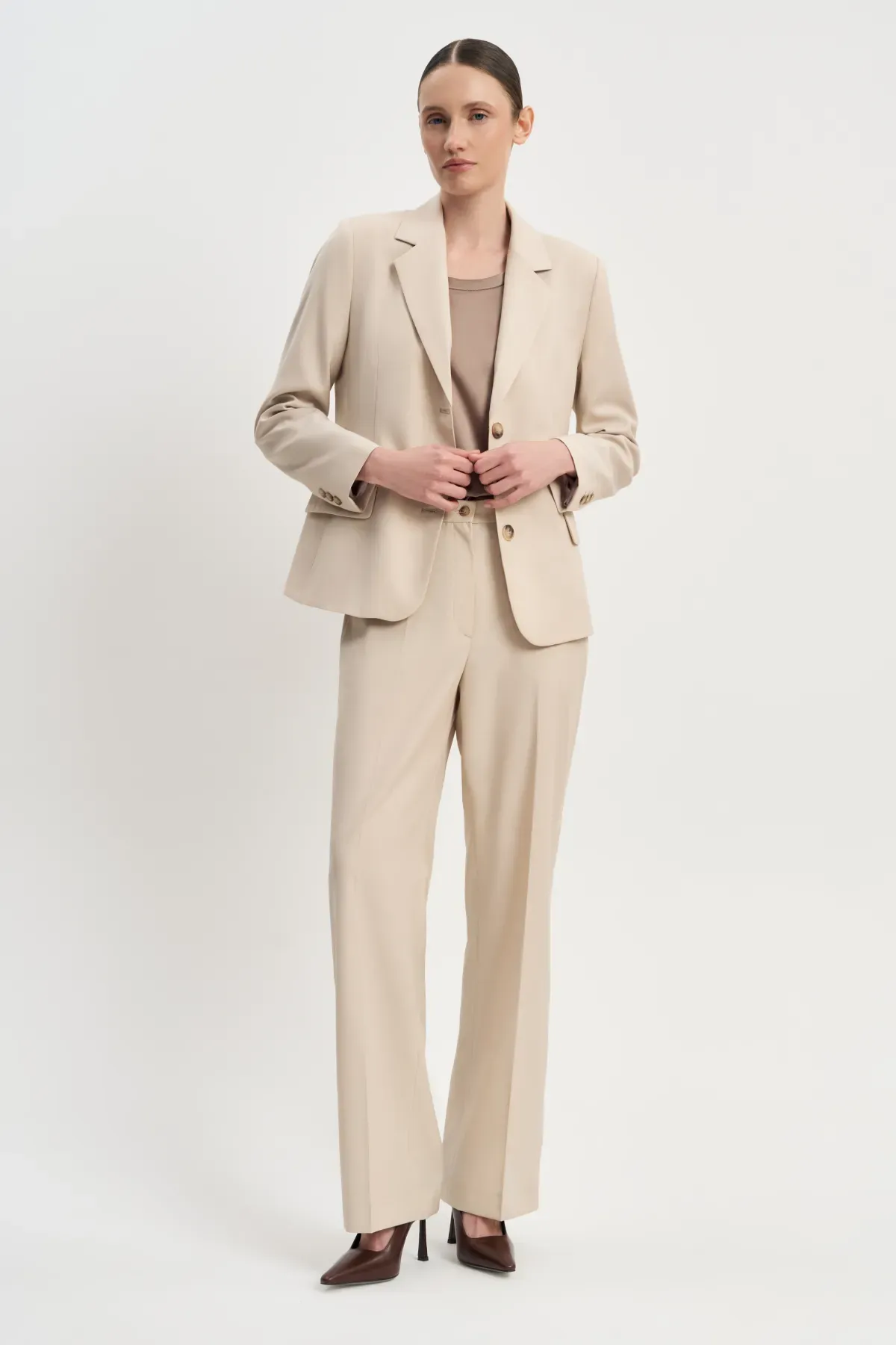 Стильные зауженные к низу брюки Топленое молоко вместе с изящным жакетом Топленое молоко создают нежный весенне-летний городской образ.