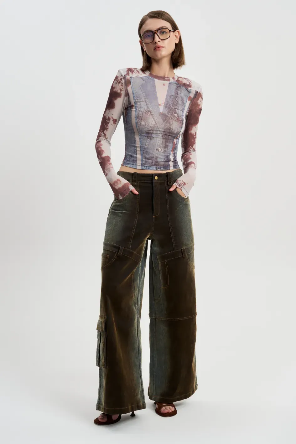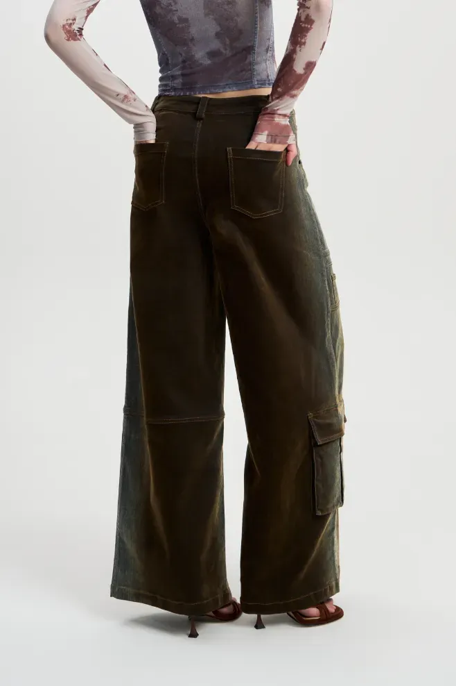 Необычные широкие брюки, в которых серо-синяя джинса переходит в коричневый бархат.