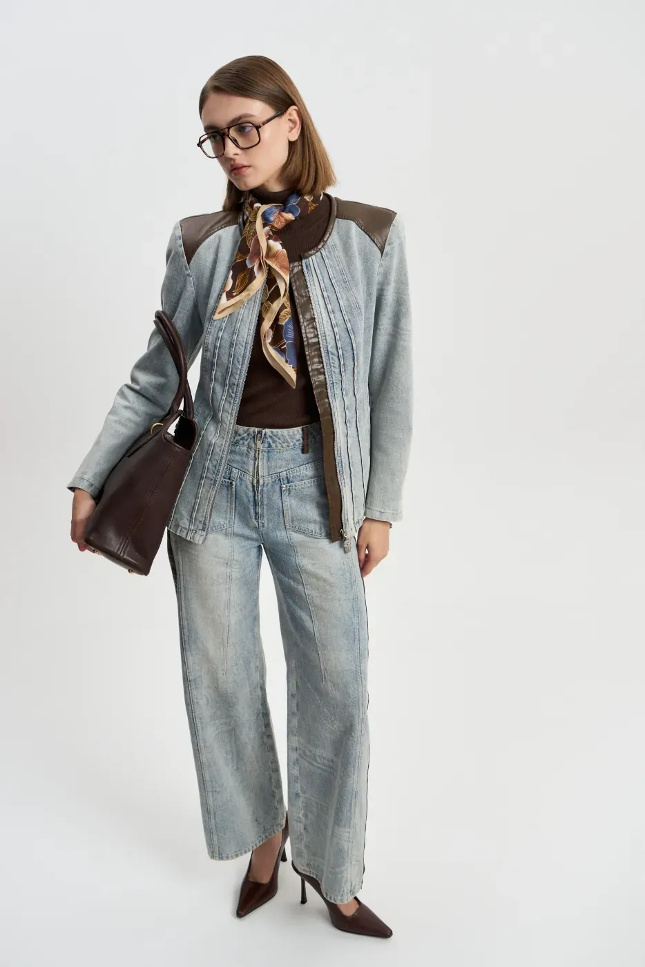 Джинсы City Life пример того насколько элегантной может выглядеть вареная джинса в сочетании с темно-коричневой кожей. Застроченные рельефы и кожаные лампасы добавляют изюминку в образ.