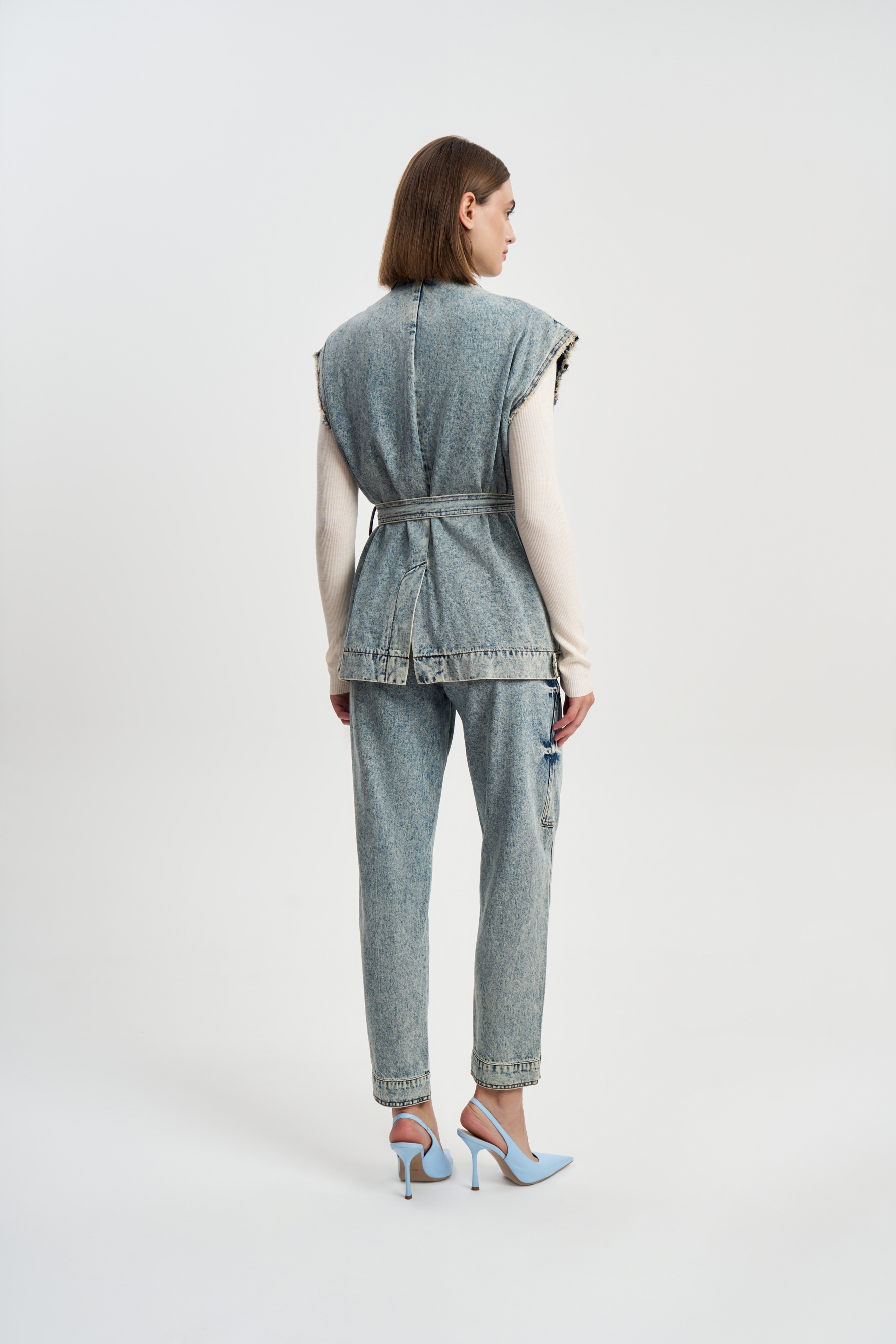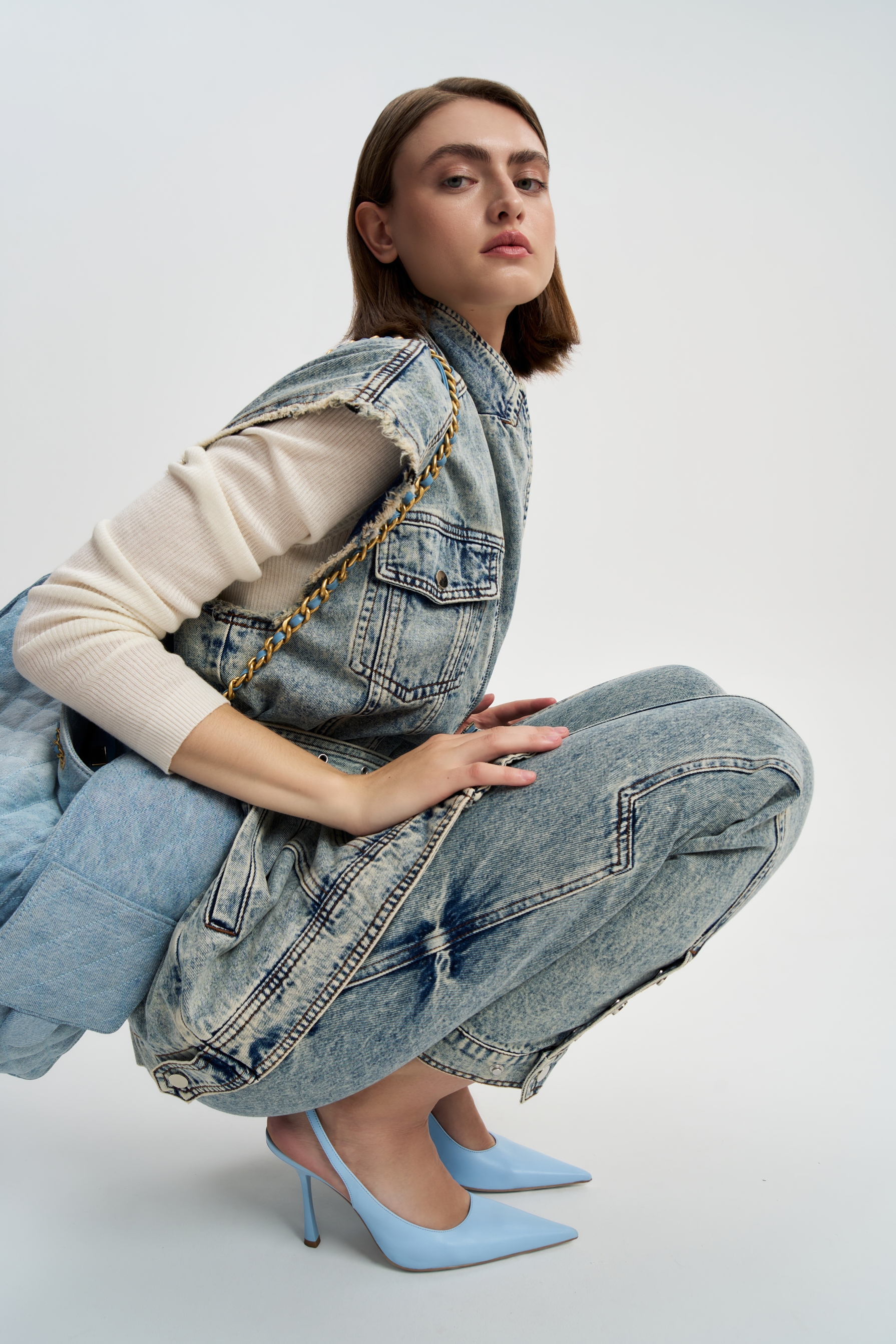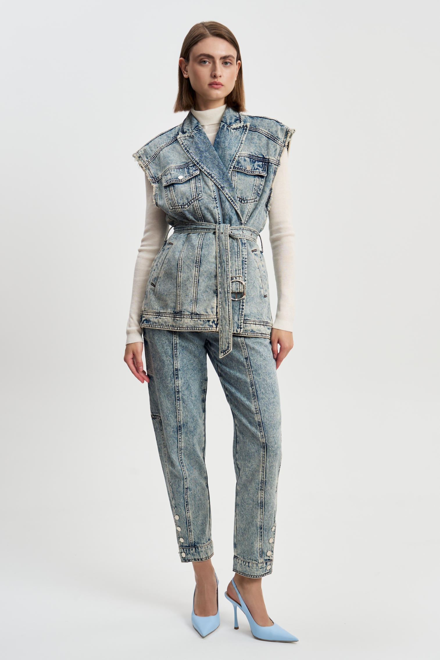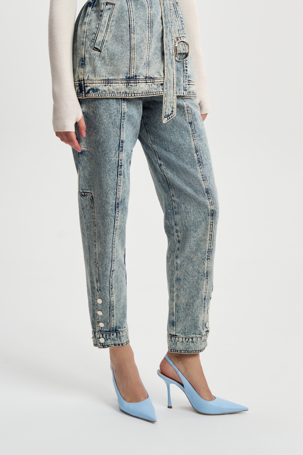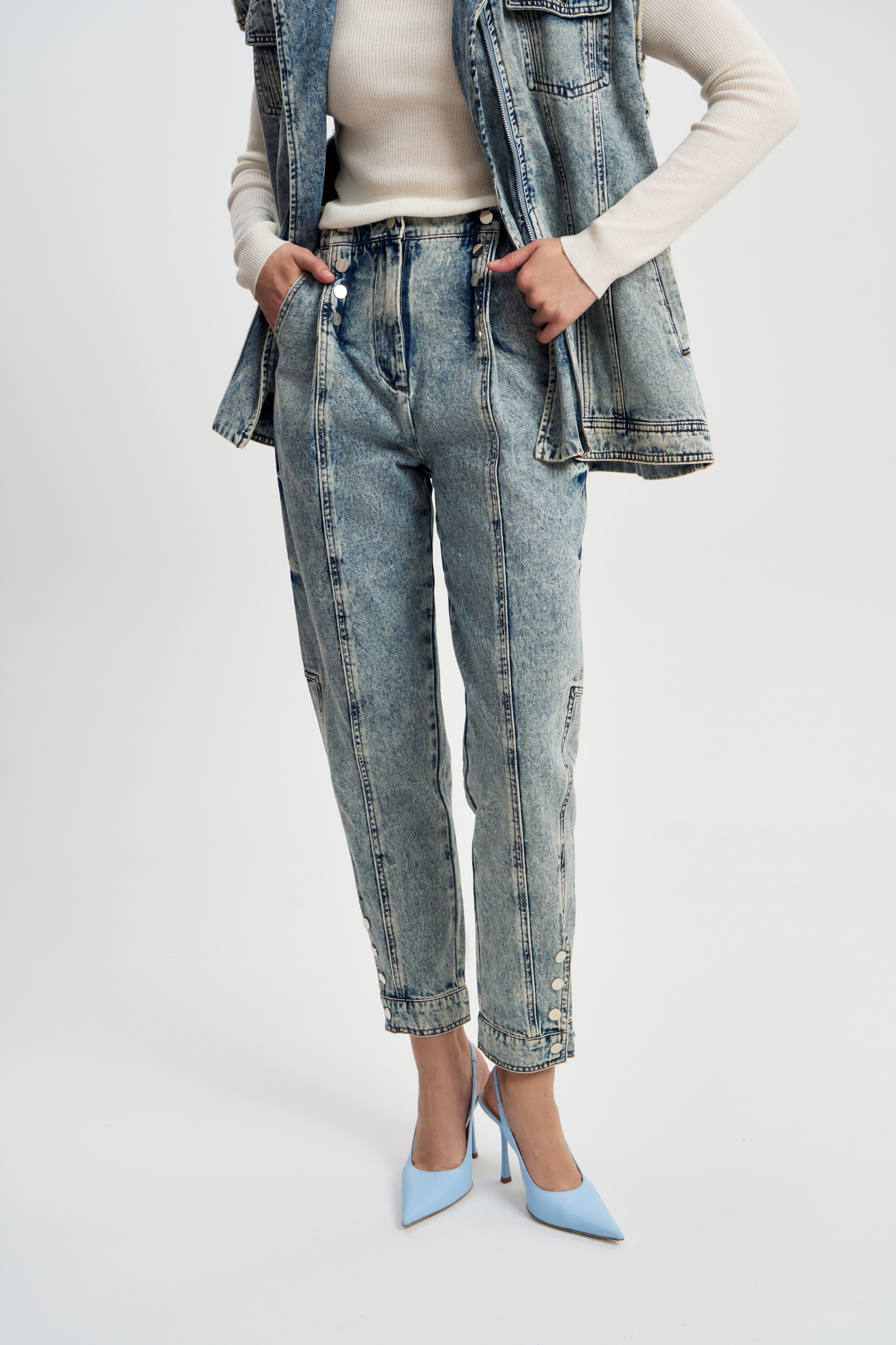 Джинсы Пуговицы это классические джинсы бананы из варенки. Изюминку джинсам придают блестящие круглые пуговицы на защипах и на манжетах, а также защипы на коленках, вертикальные строчки по всей длине штанины и подкройные детали.