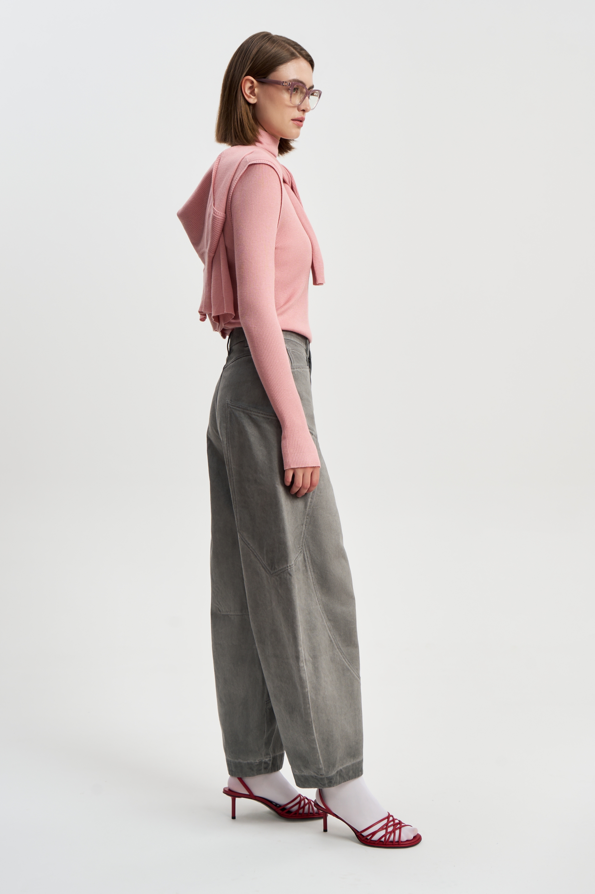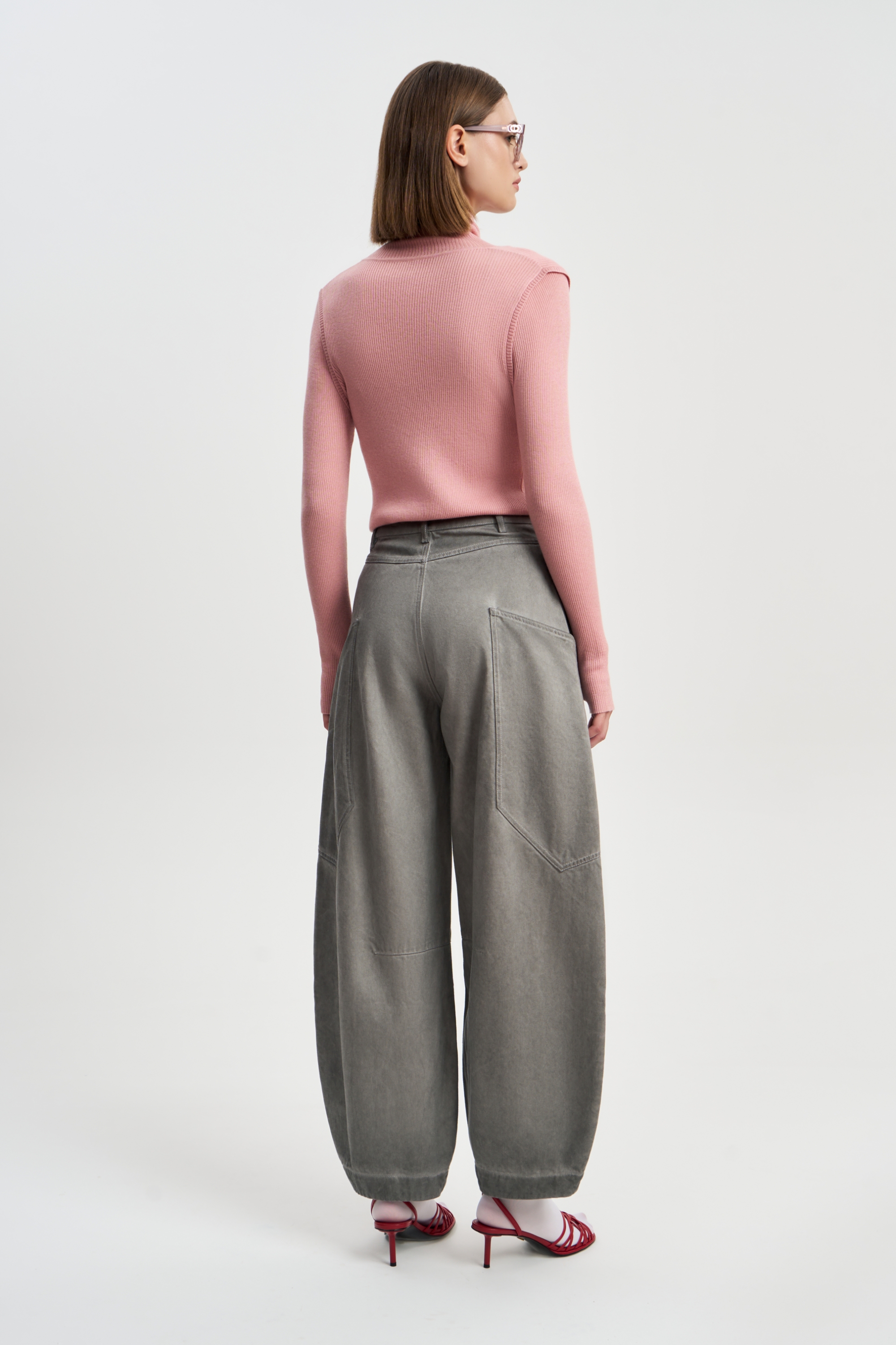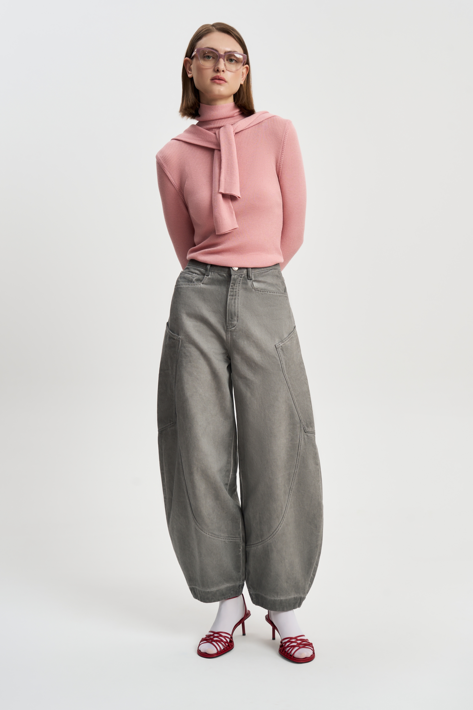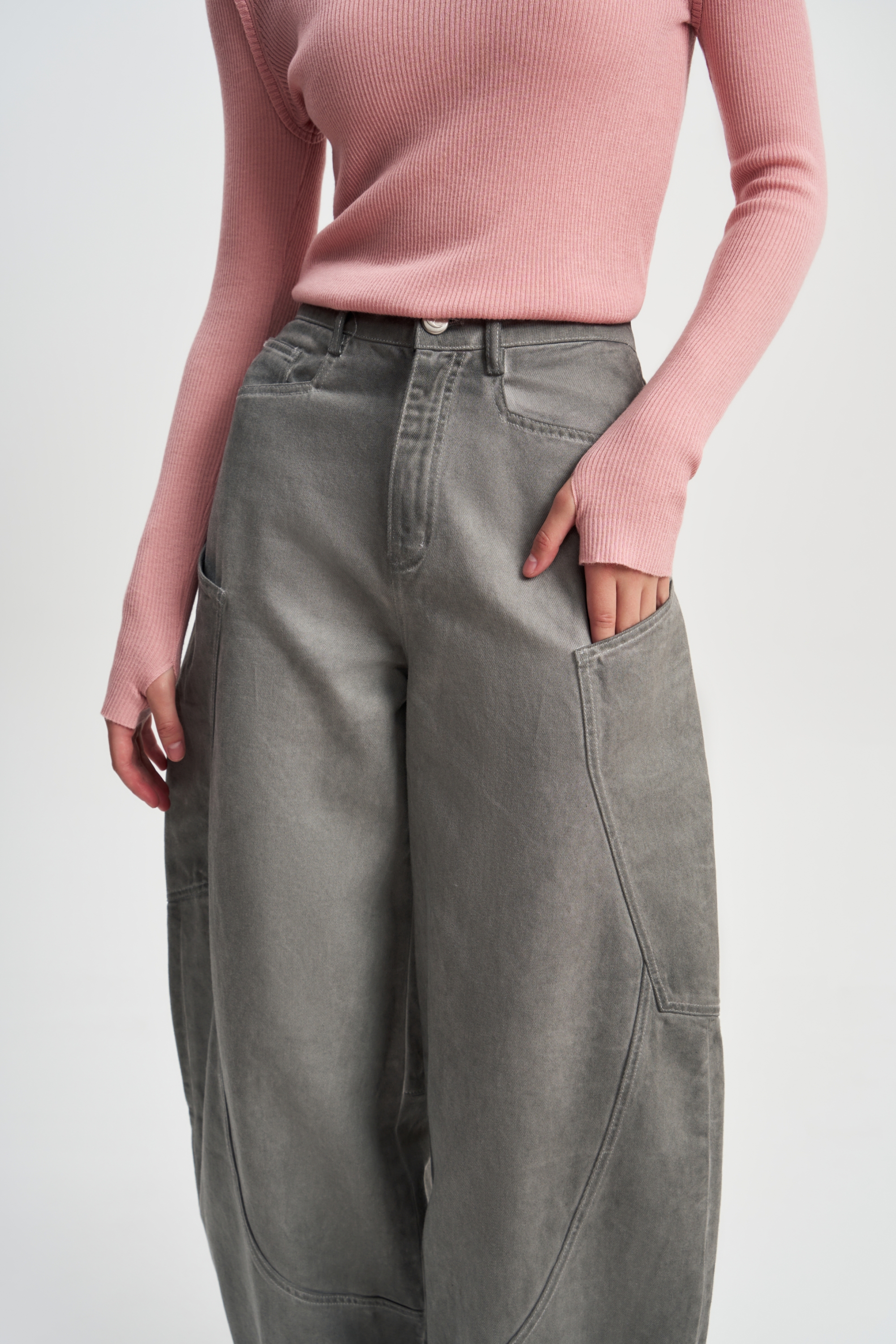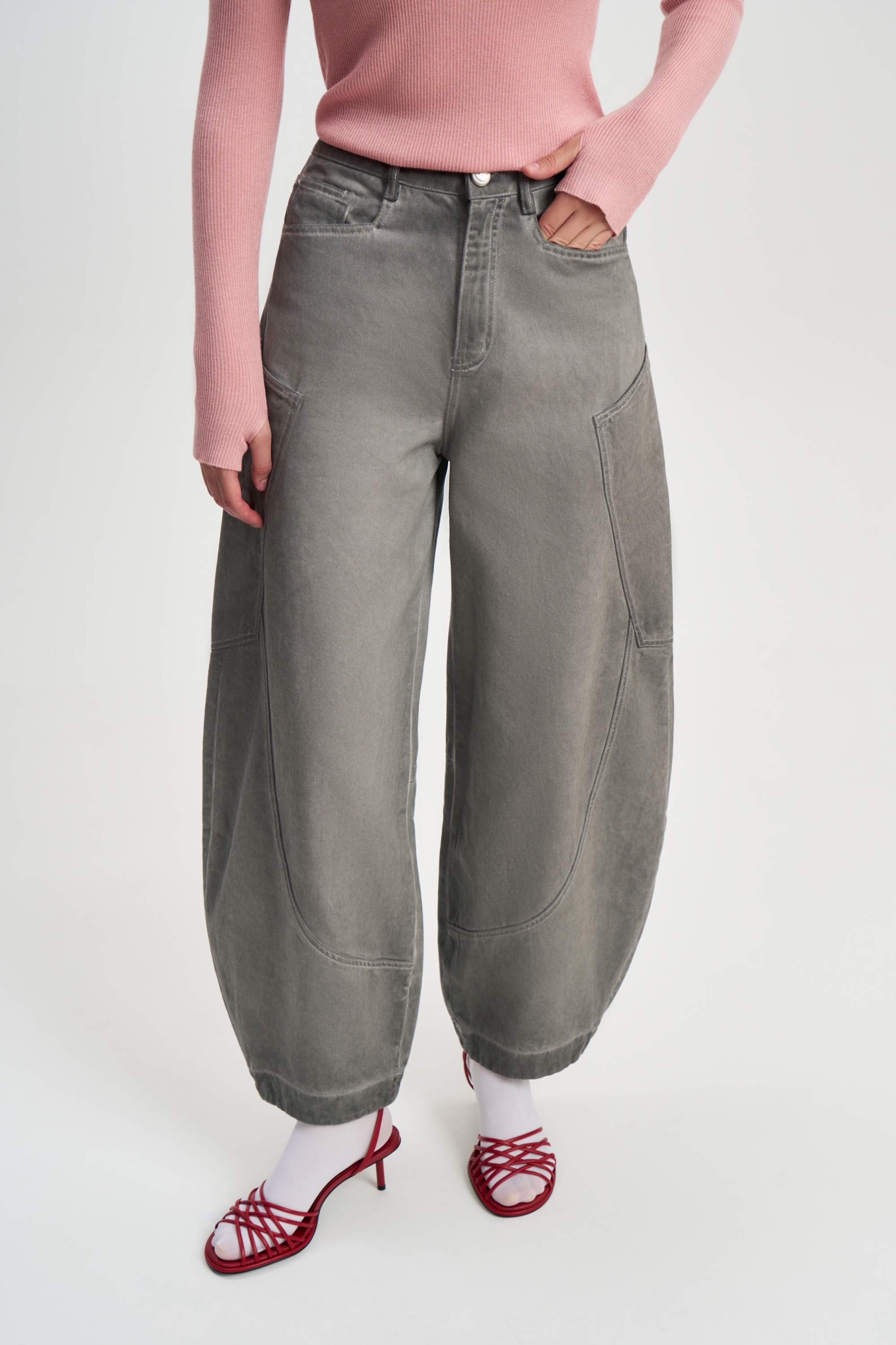 Джинсы бананы из серебристо-серой джинсы с накладными карманами. Составляют прекрасный ансамбль с курткой Серебро.