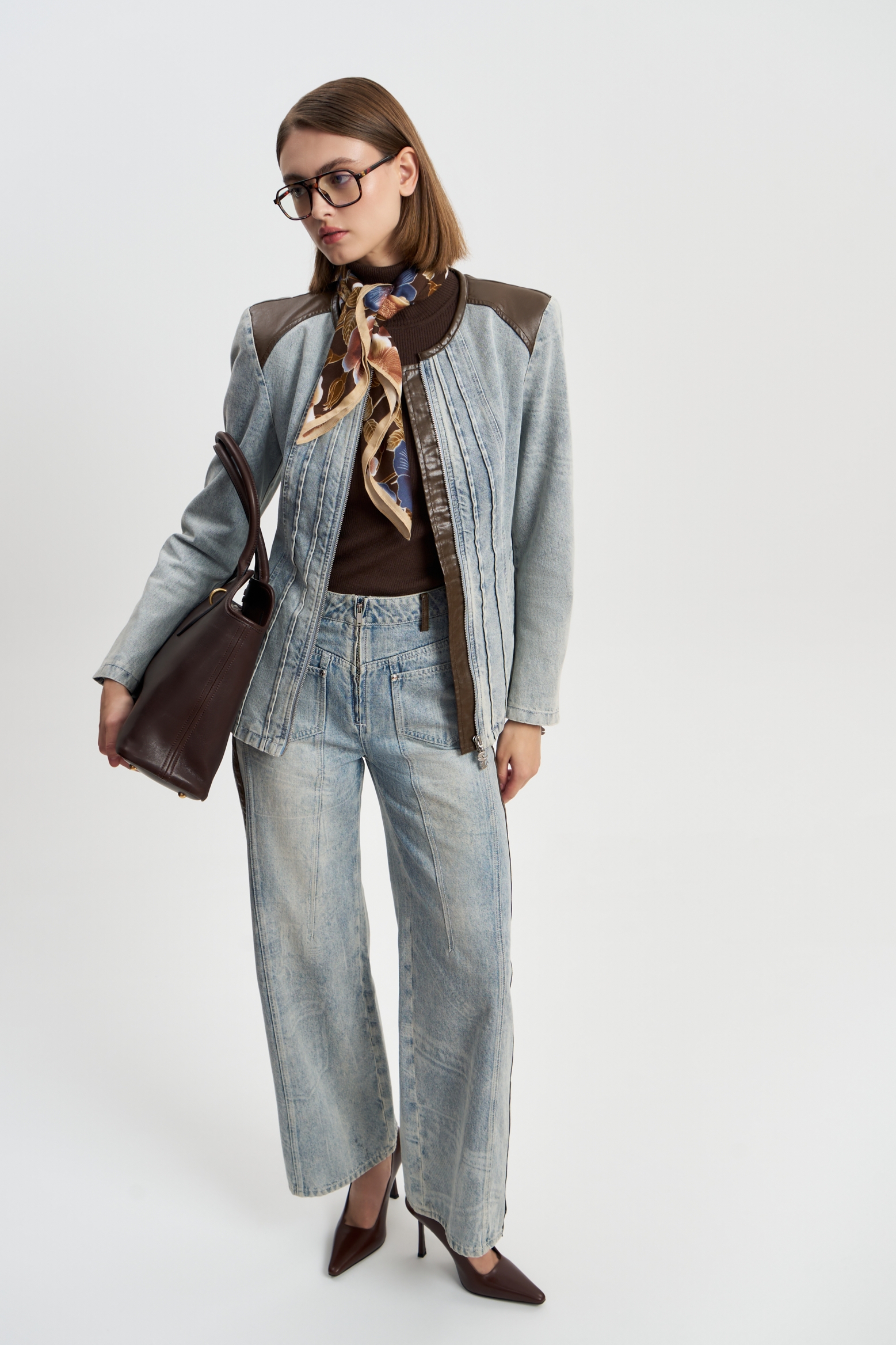 Жакет City Life пример того насколько элегантной может выглядеть вареная джинса в сочетании с темно-коричневой кожей. Застроченные рельефы способствуют созданию прилегающего силуэта, лаконичная кожаная отделка добавляет изюминку в образ.
