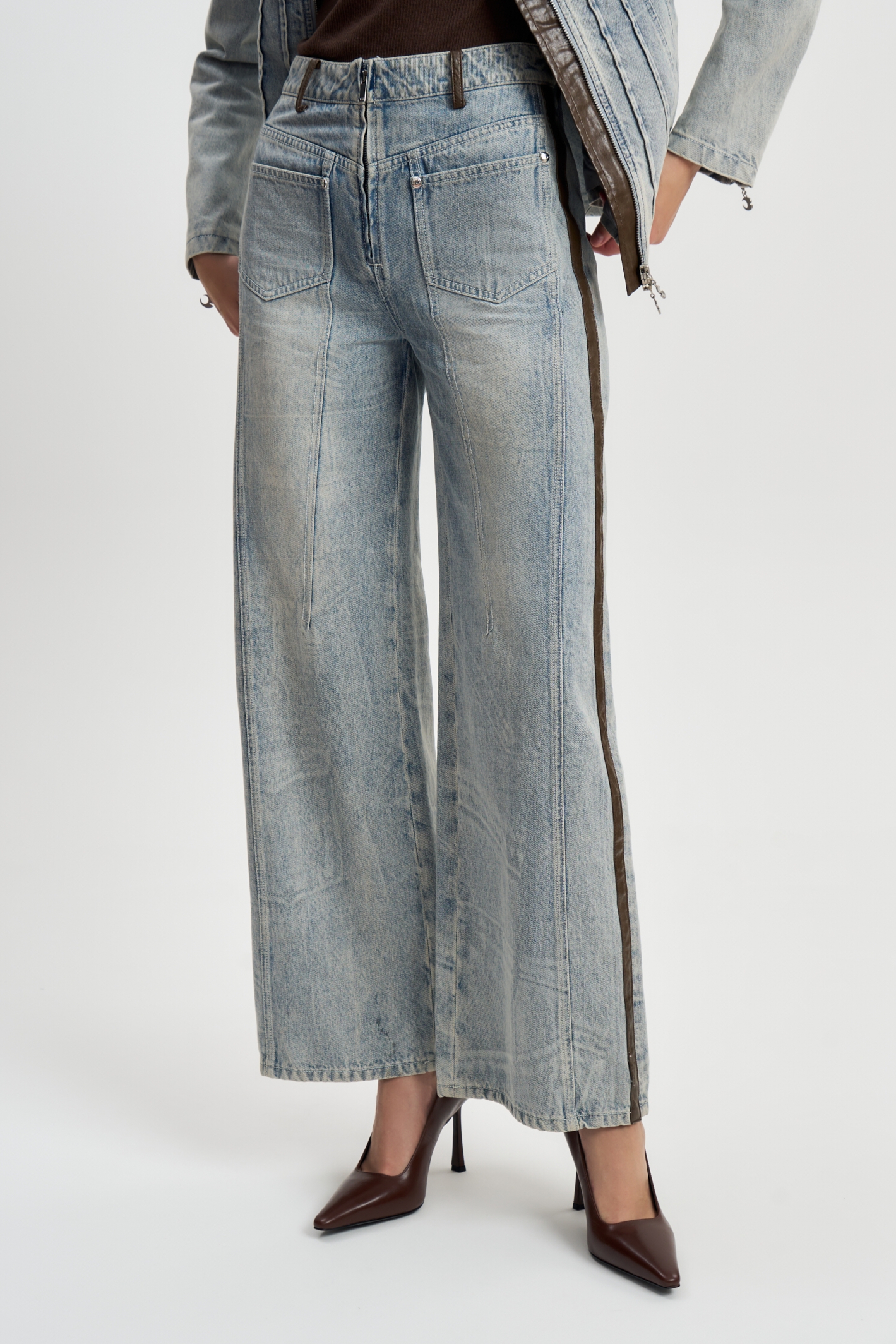 Джинсы City Life пример того насколько элегантной может выглядеть вареная джинса в сочетании с темно-коричневой кожей. Застроченные рельефы и кожаные лампасы добавляют изюминку в образ.