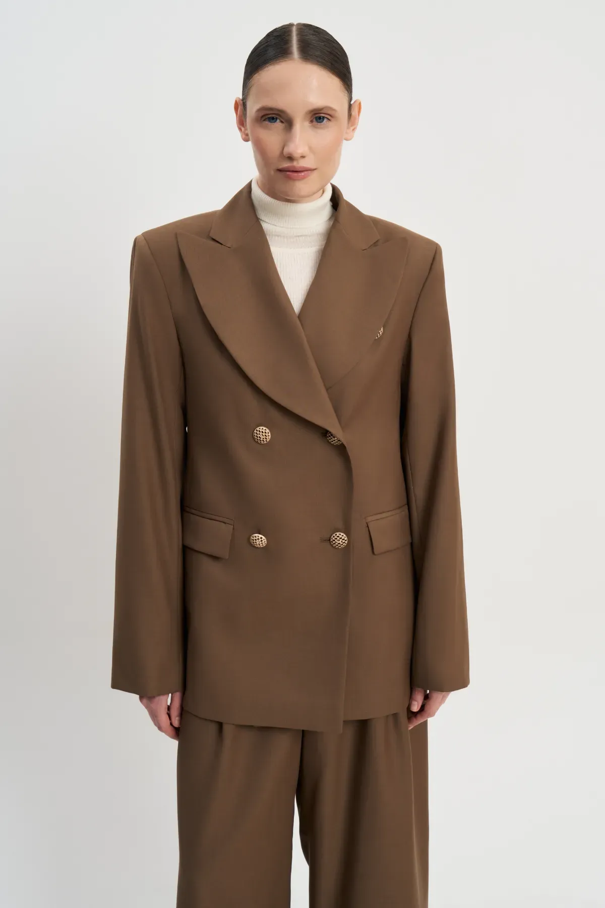 Необычный весенне-летний костюм Макси/Макси состоит из широких струящихся брюк и свободного оверсайз жакета с фигурно вырезанными лацканами и роскошными фигурными золотыми пуговицами. Для еще более элегантного образа можно добавить шелковый топ.
