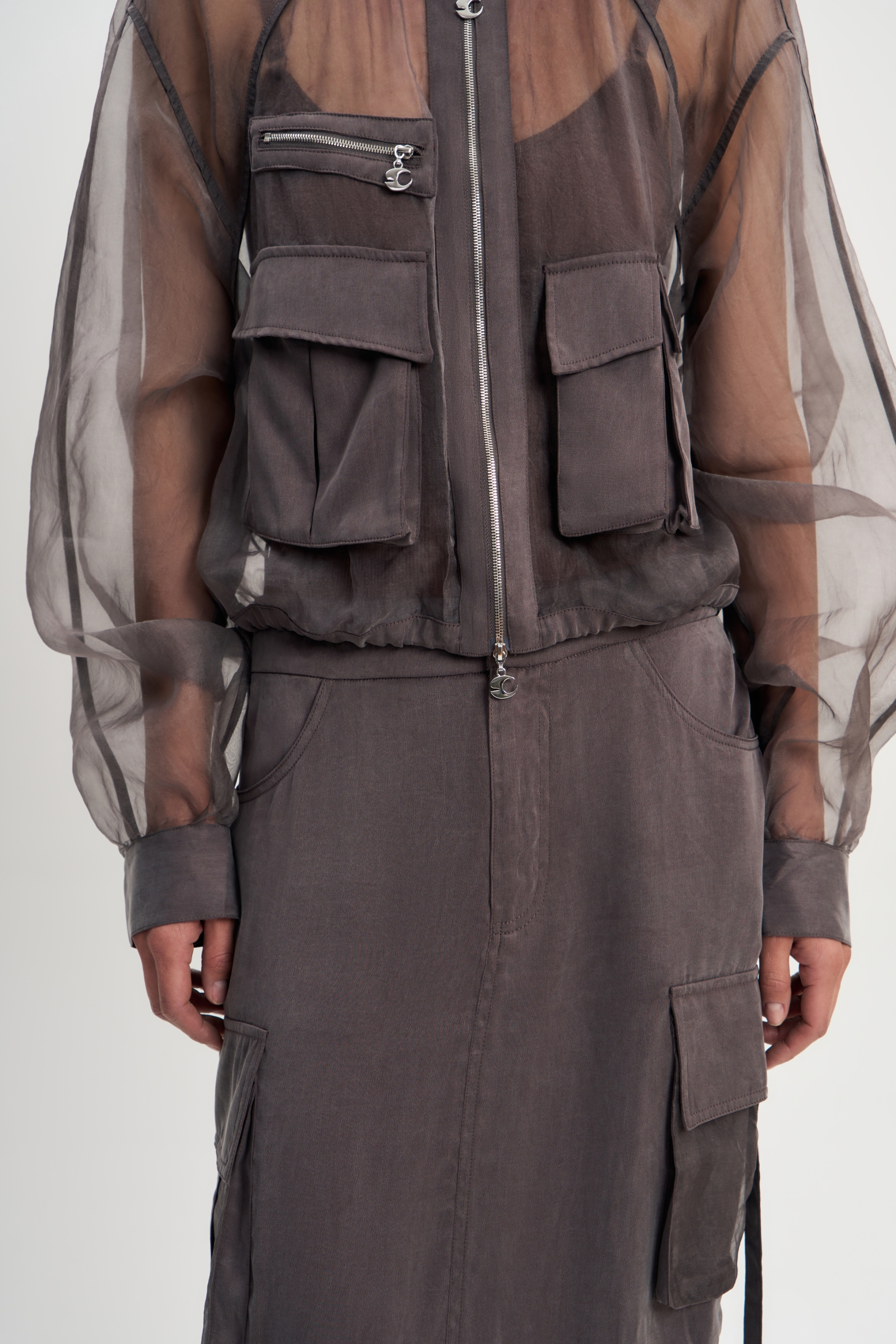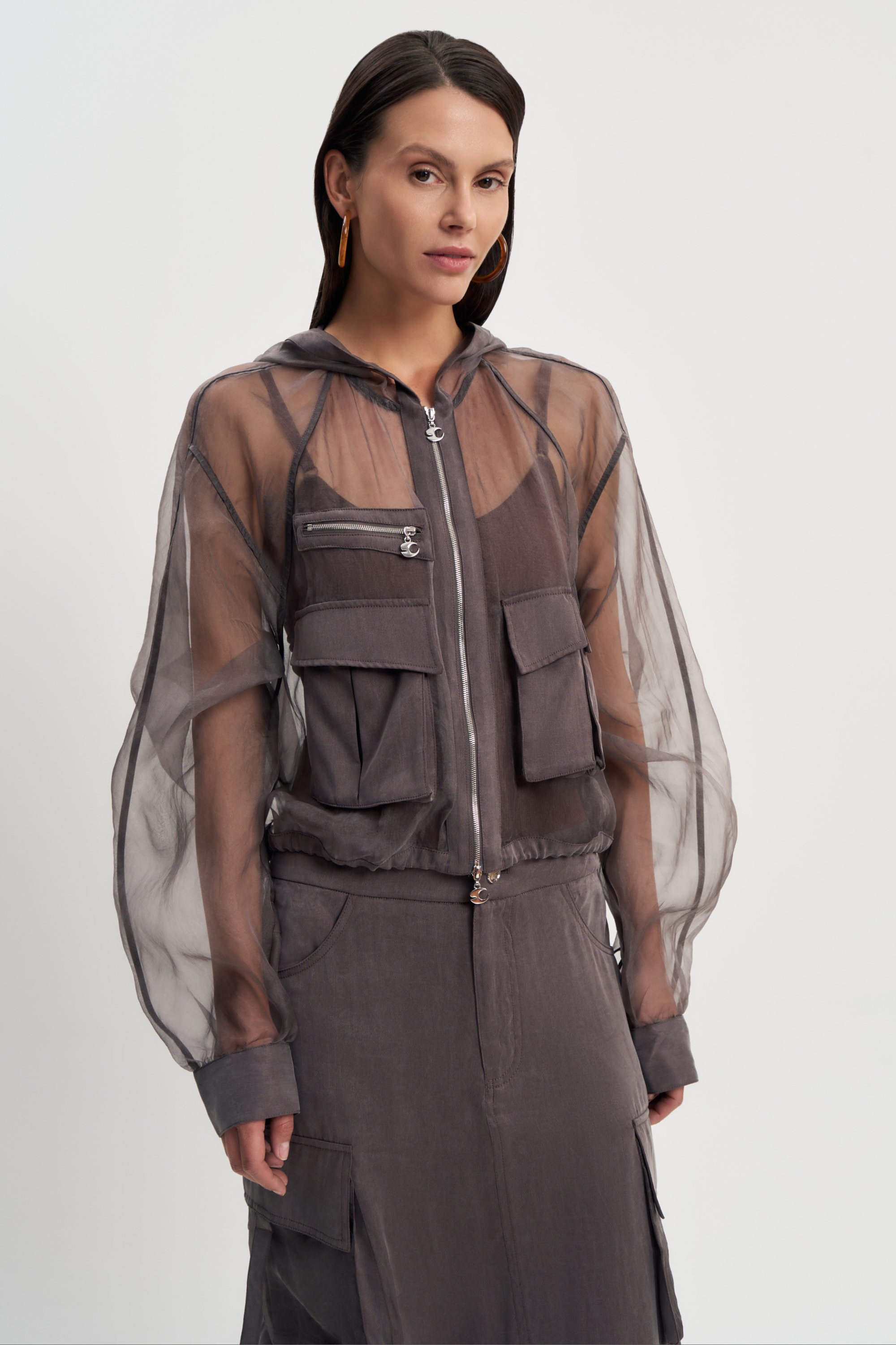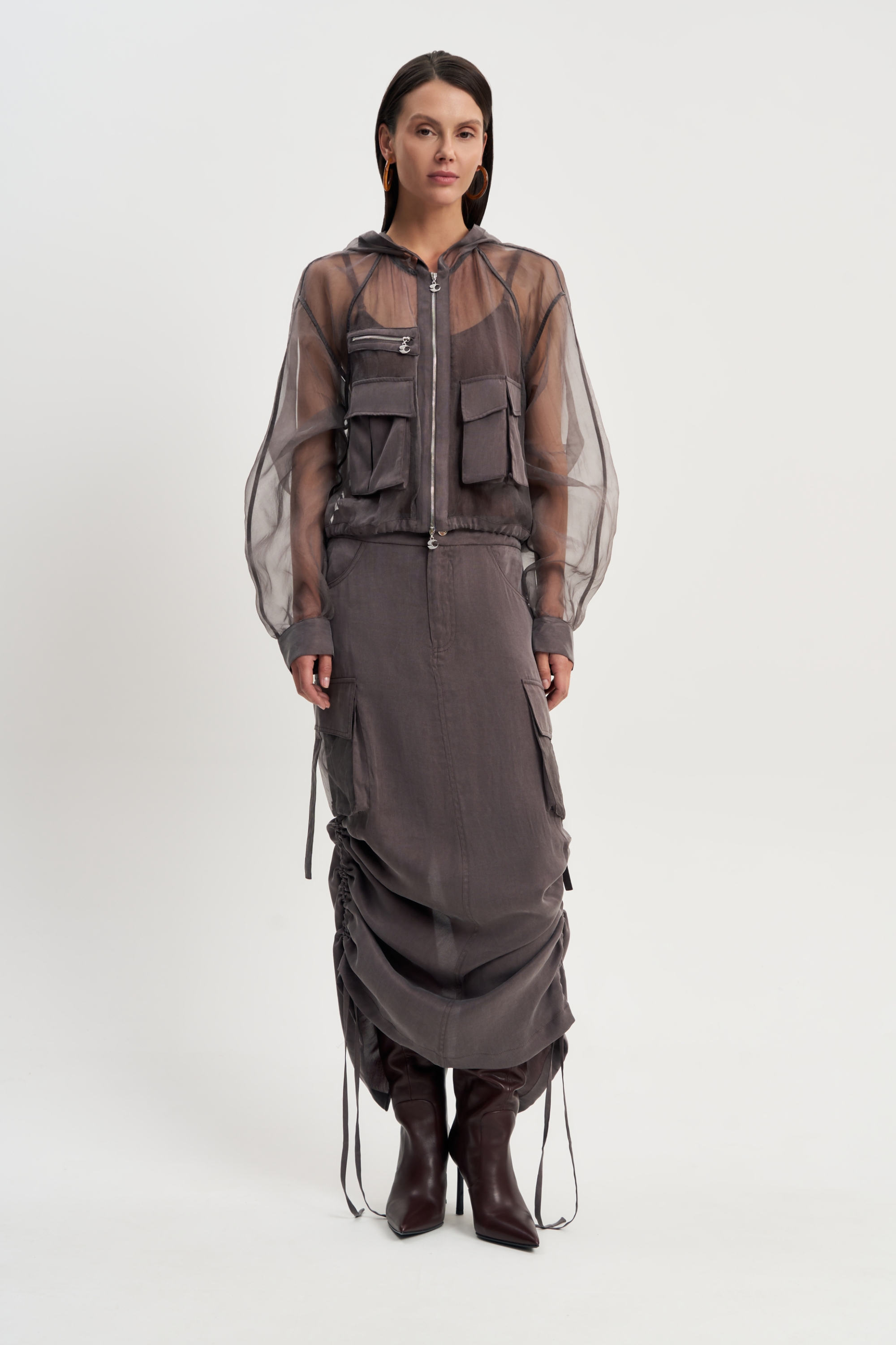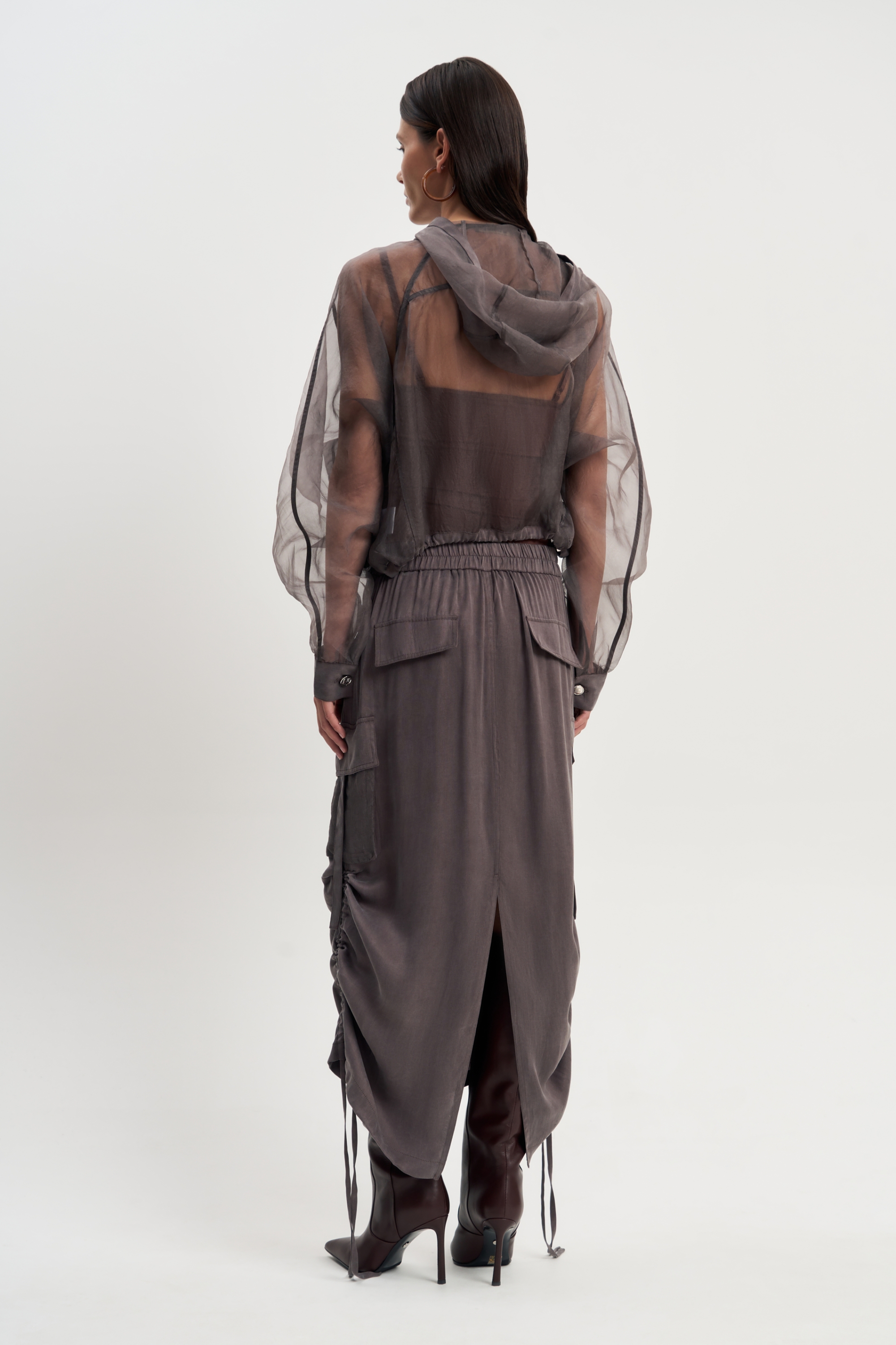 "Принцесса Амидала" - полупрозрачный костюм сложного кроя, сочетающий в себе нестандартные детали: крупные карманы, прозрачный капюшон, симметричный разрез сзади на юбке.