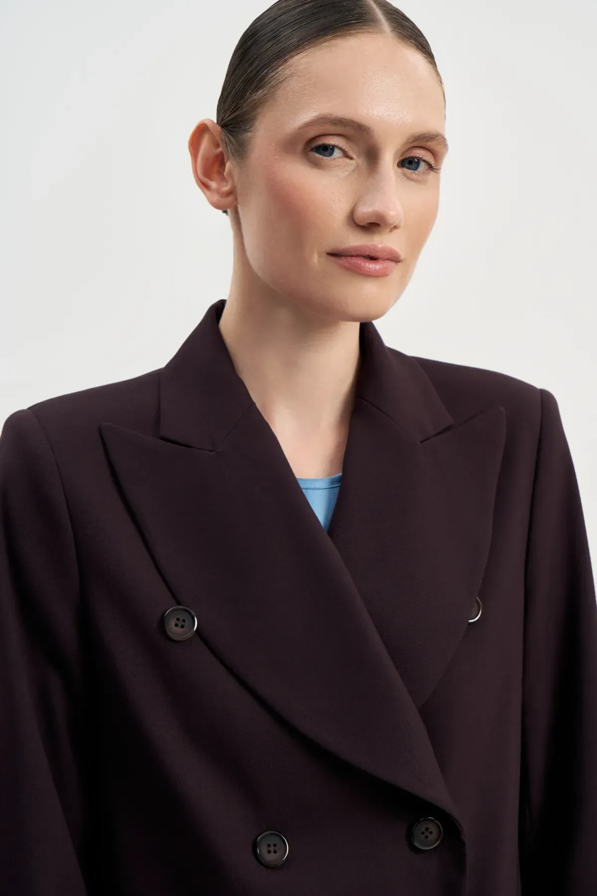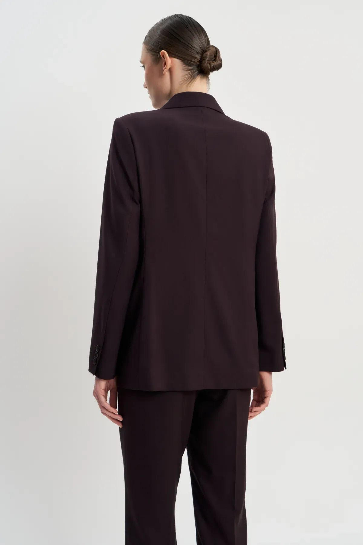 Костюм Шоколад состоит из узких брюк по щиколотку и двубортного пиджака с необычно вырезанными лацканами. Глубокий шоколадный цвет делает этот комплект совершенно неотразимым, подходящим и для совещания у начальства и для вечернего досуга.