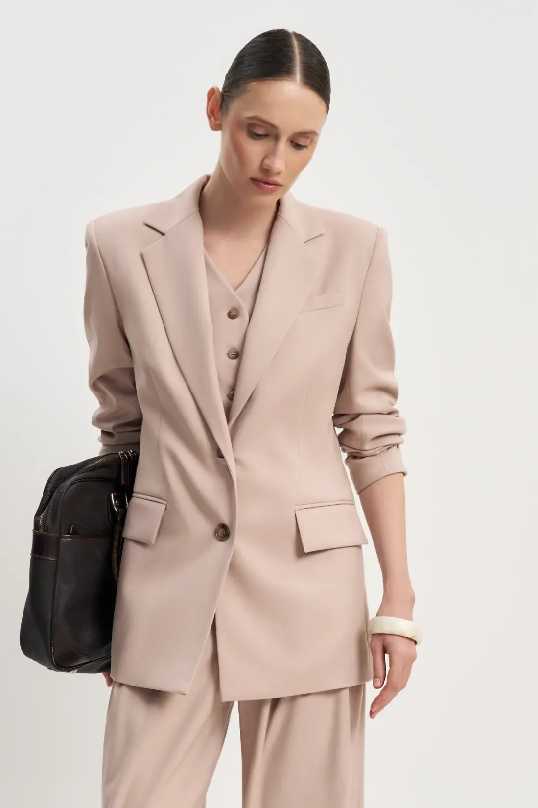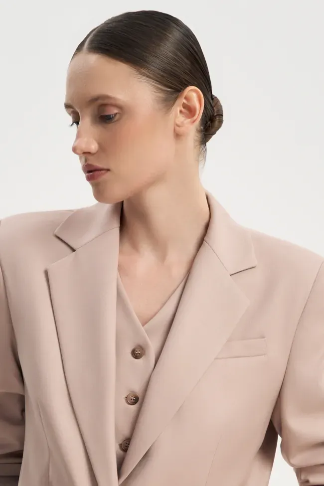 Стильный и очень удобный костюм для офиса и для вечерних мероприятий. Зауженные к низу брюки длиной до щиколотки, облегающий жилет и свободный однобортный пиджак. Очень элегантный внесезонный комплект.