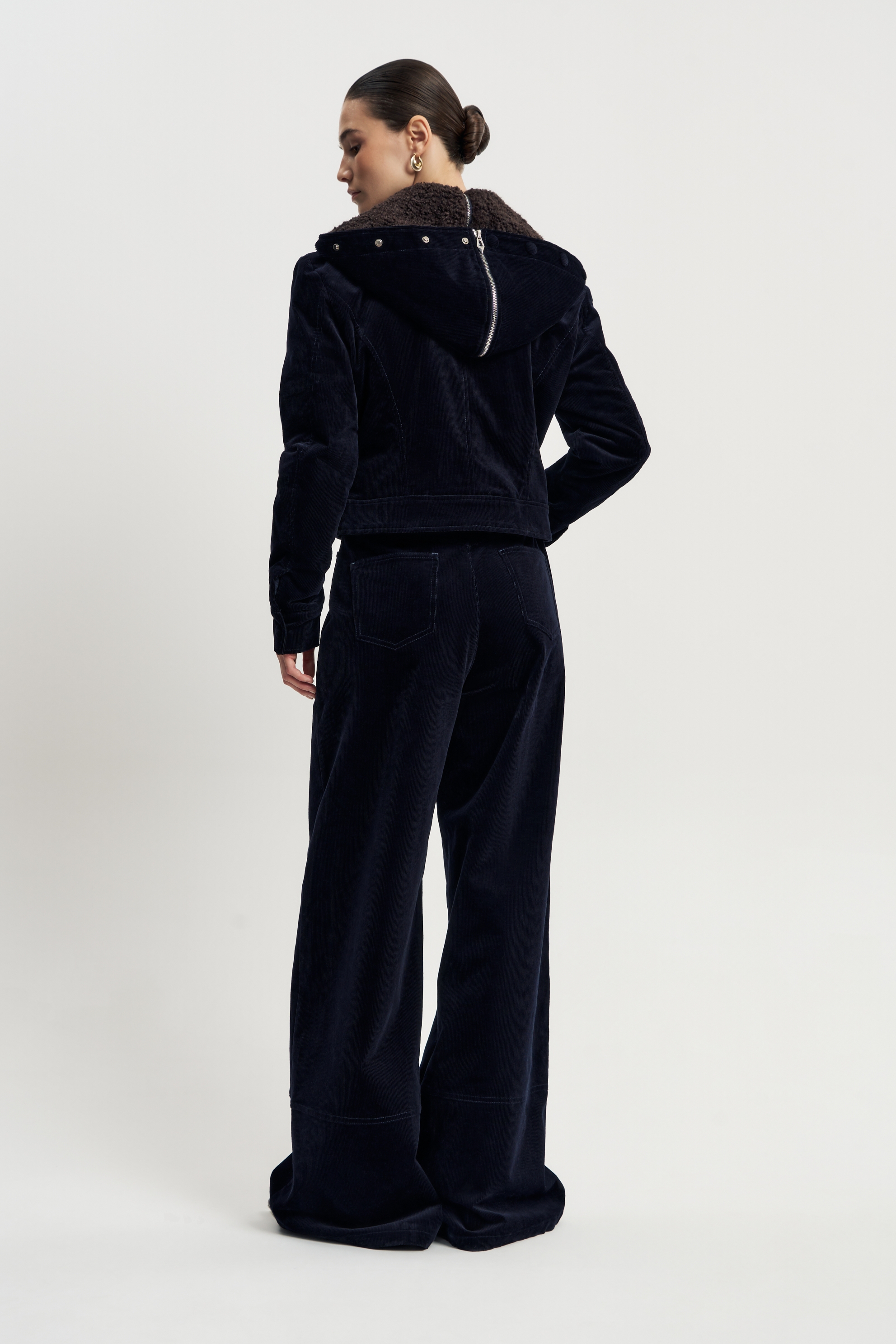 Элегантный костюм из темно-синего вельвета, состоящий из куртки, жилета и брюк.