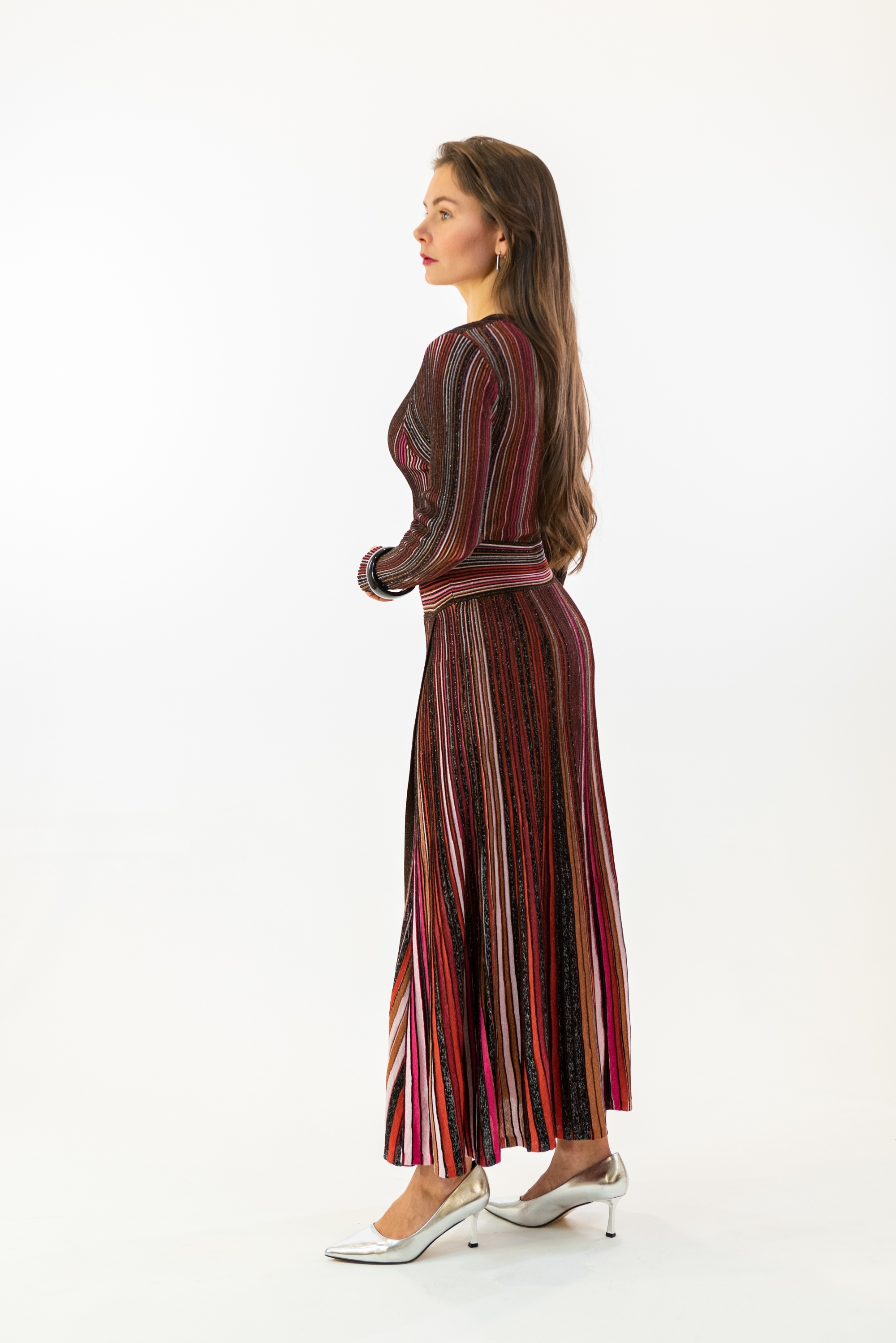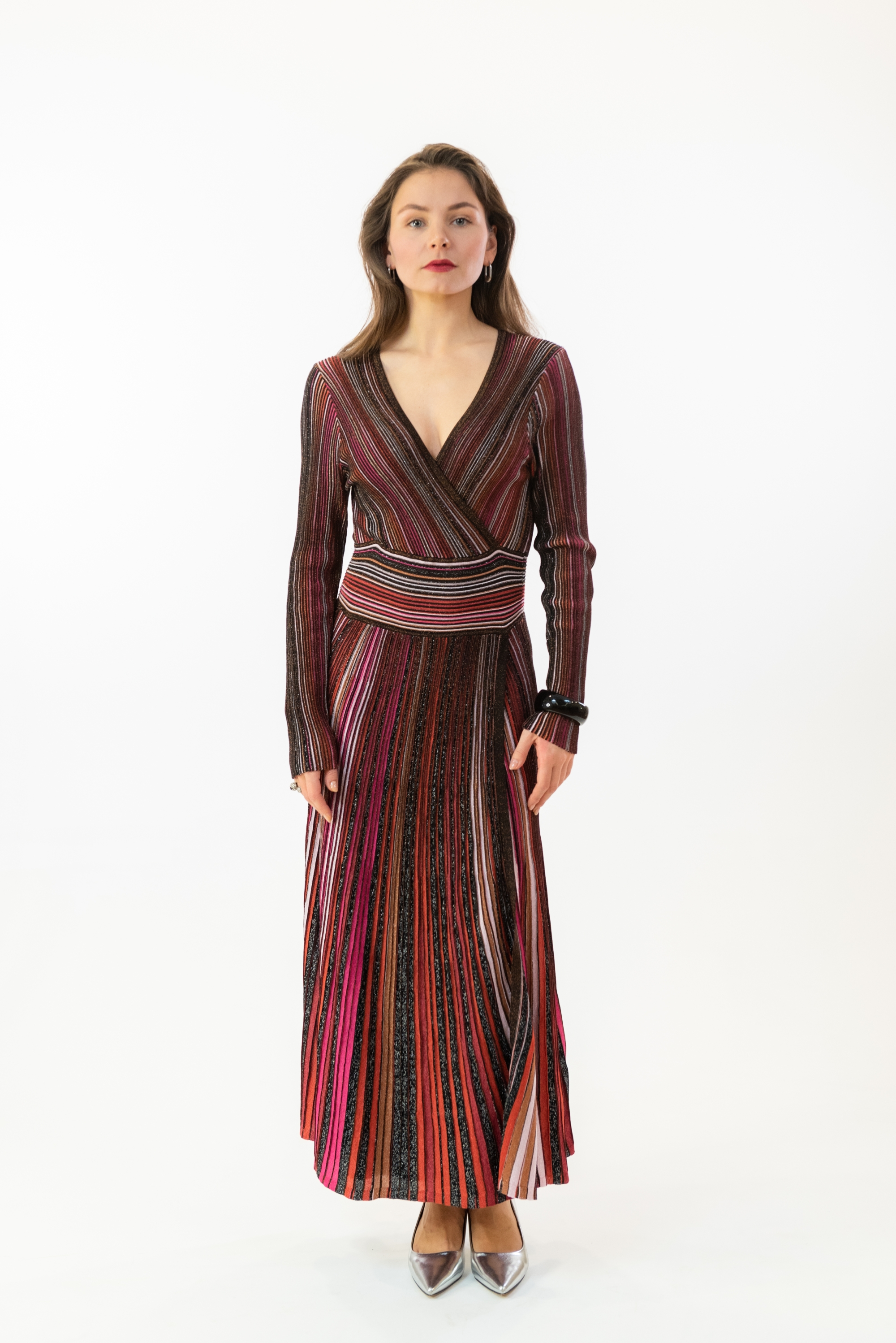 Приталенный силуэт, длина до щиколотки и мягкие складки создают образ с лёгкими отсылками к стилю XX века. V-вырез, длинные рукава, акцент на талии, все это добавляет образу женственности, делая наряд идеальным для вечерних выходов и особых случаев.