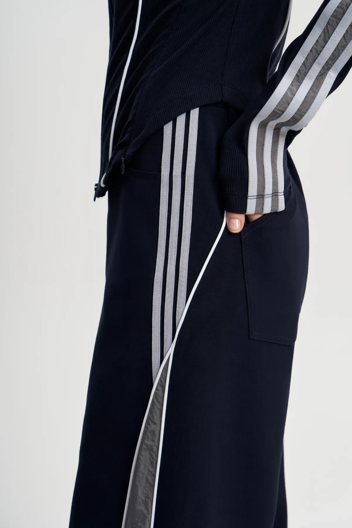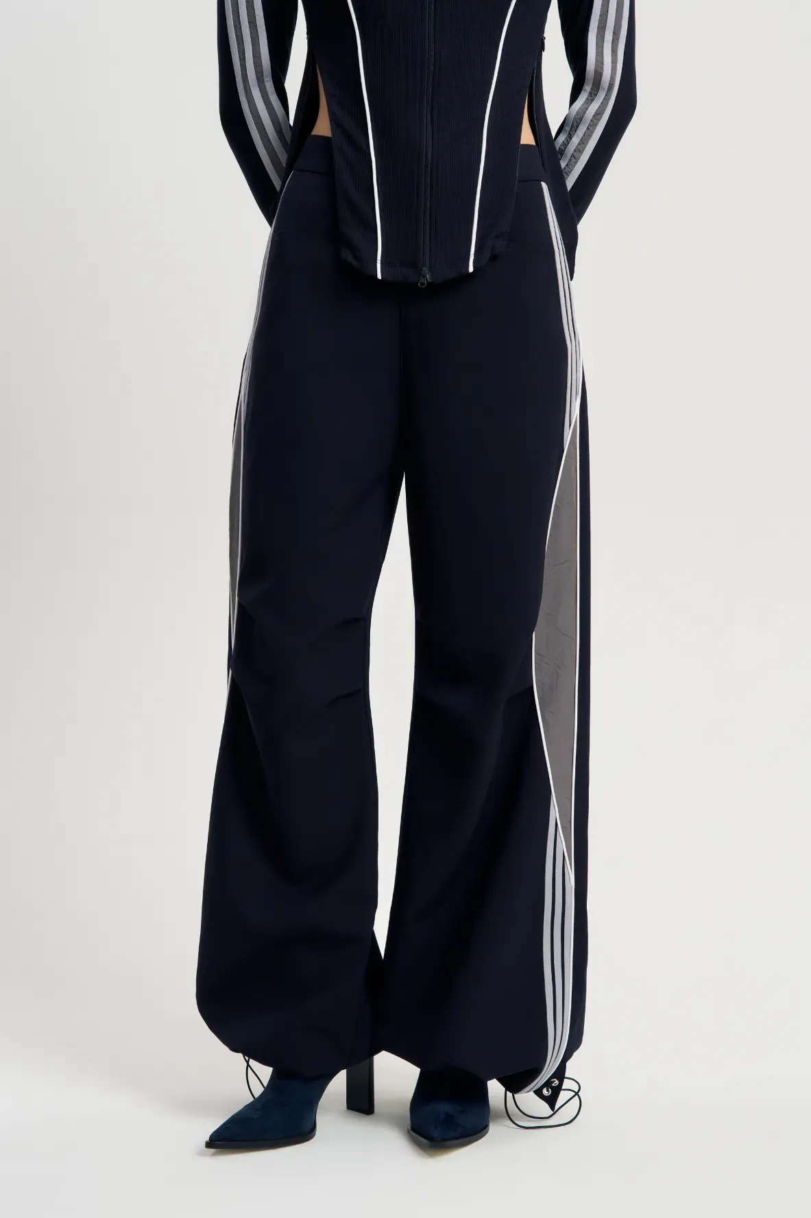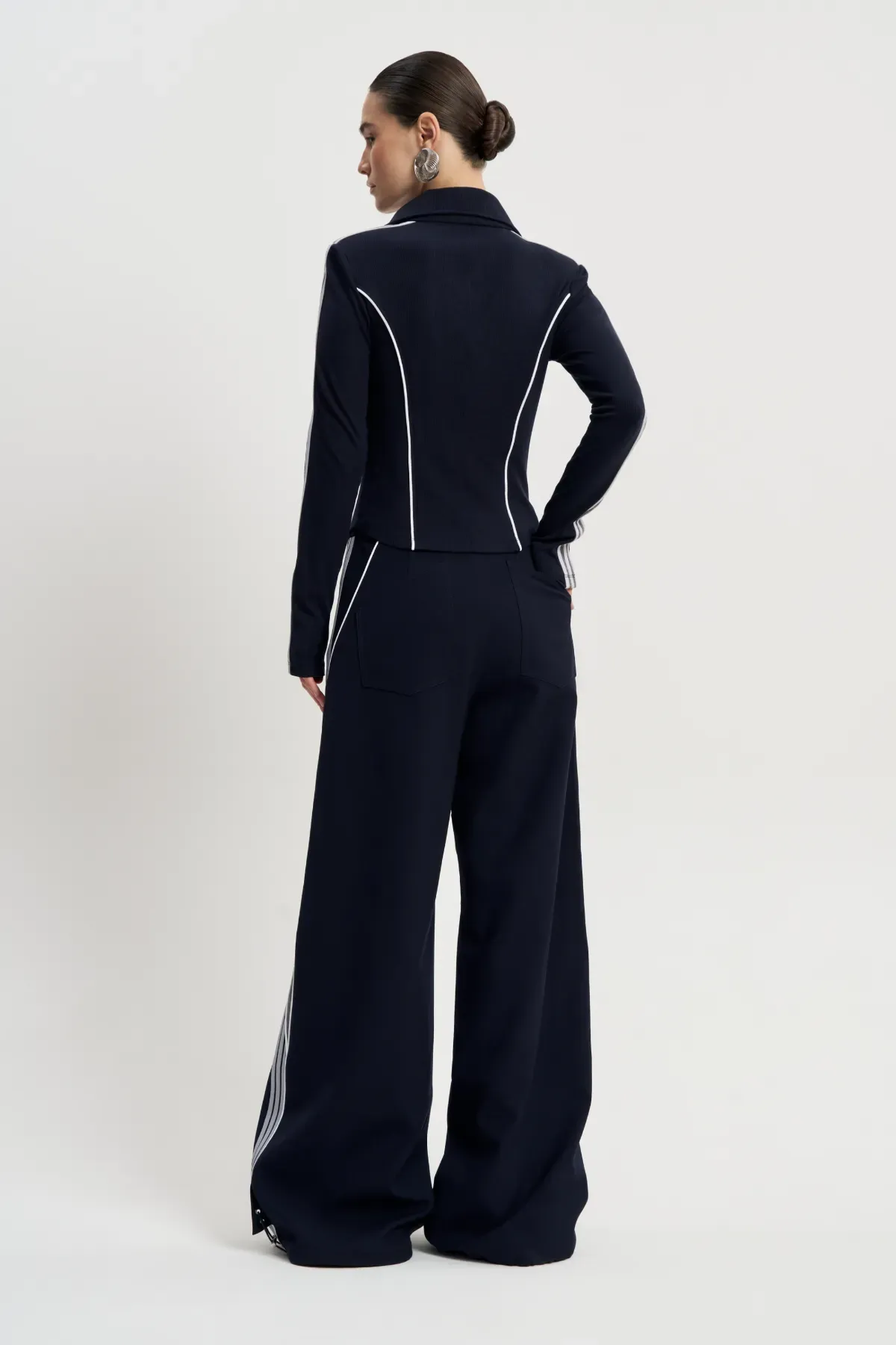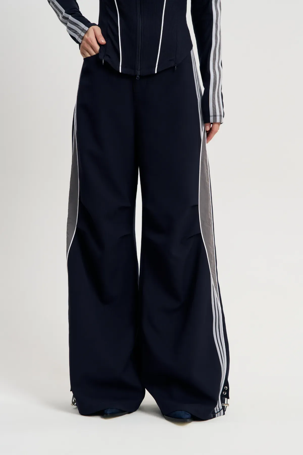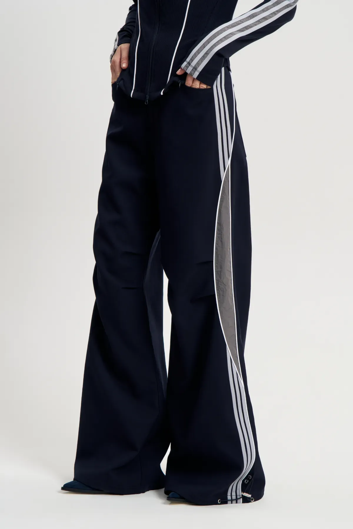 Расклешенные брюки Ретро-шик, составляющие часть одноименного комплекта, являются также уникальной самостоятельной единицей. Несмотря на стиль, отсылающий к спортивным образам девяностых, отличаются качественным брючным кроем, посадкой по талии. Сочетайте с лонгсливами, топами и куртками. Состоят из плотного хлопка, за счет чего отлично держат форму, подчеркивая достоинства фигуры. Подойдет для осенних образов, особенно для прохладной погоды.