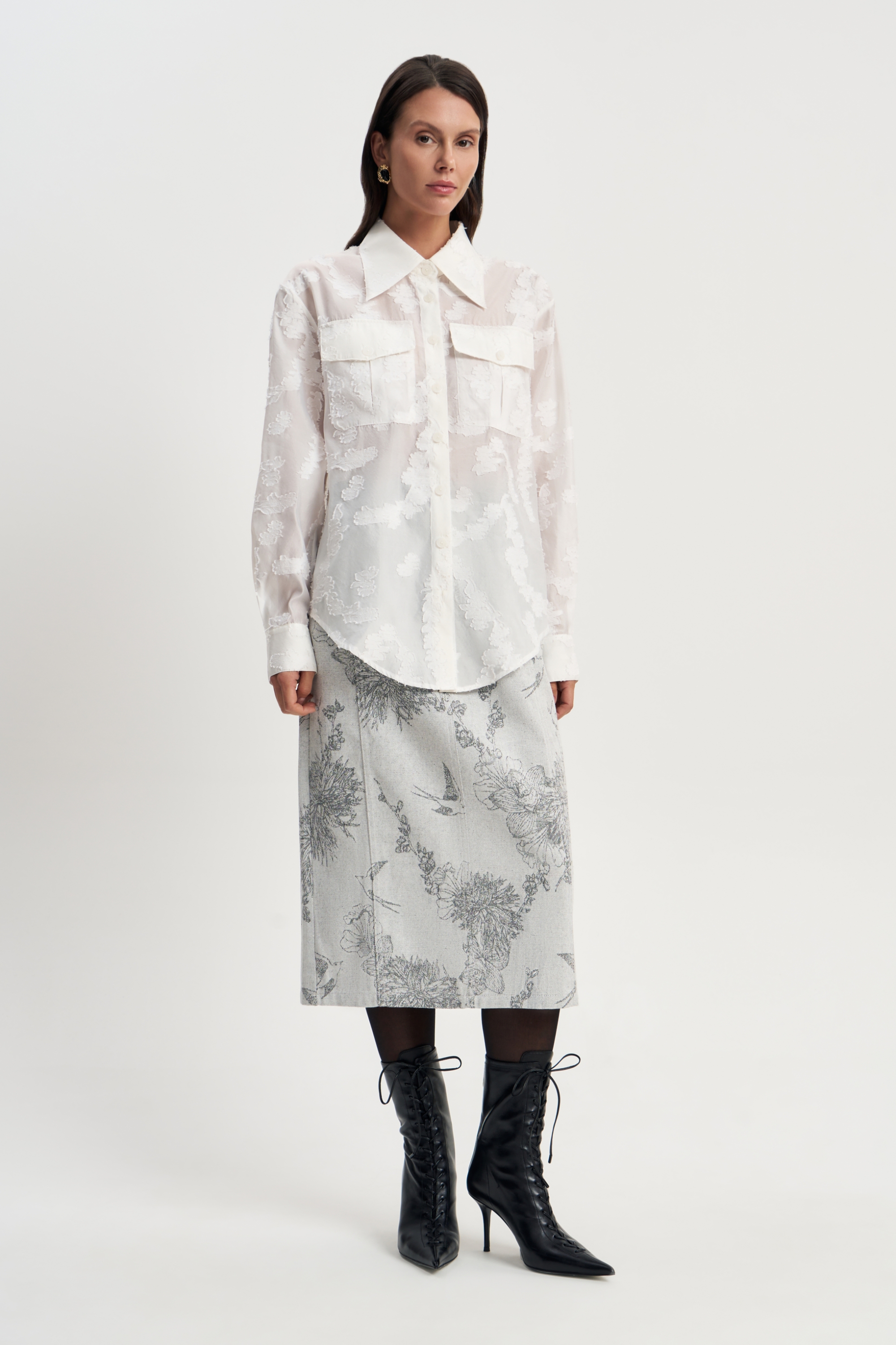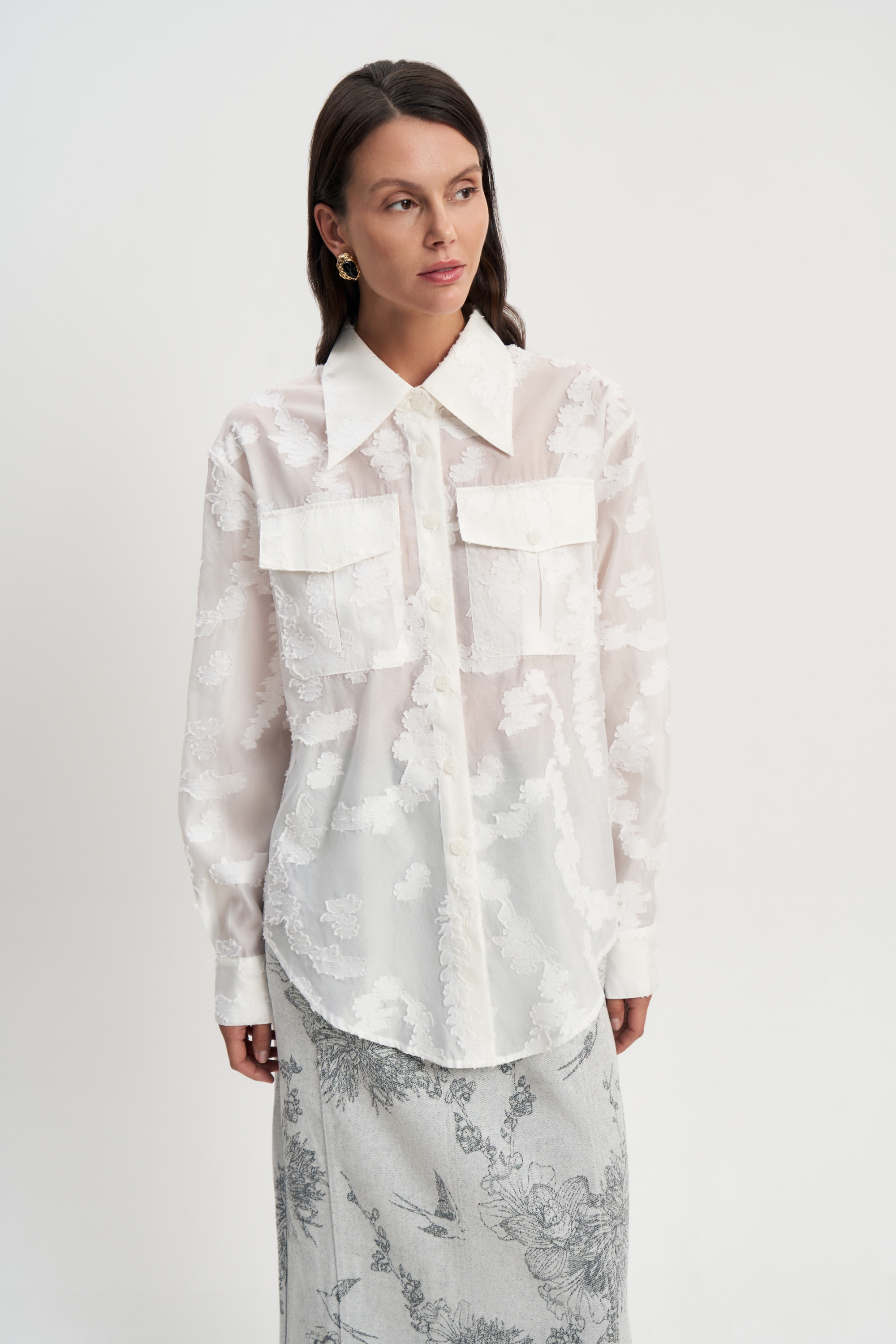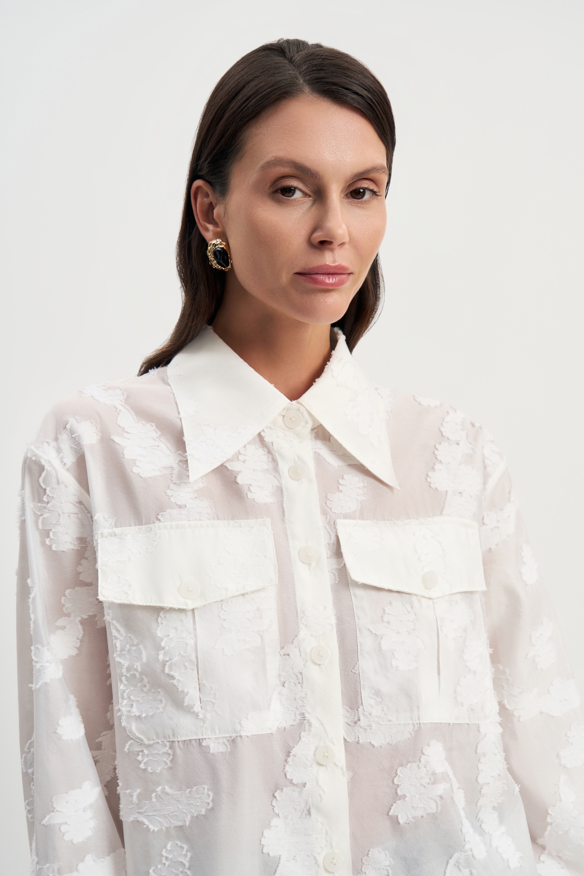 Нежная романтичная блузка с бархатистыми цветами на полупрозрачном фоне. Блузка свободного кроя, очень комфортная, прекрасно сочетается и с классическими вещами и с джинсовым шиком. Прекрасный вариант и для офиса и для клубной вечеринки.