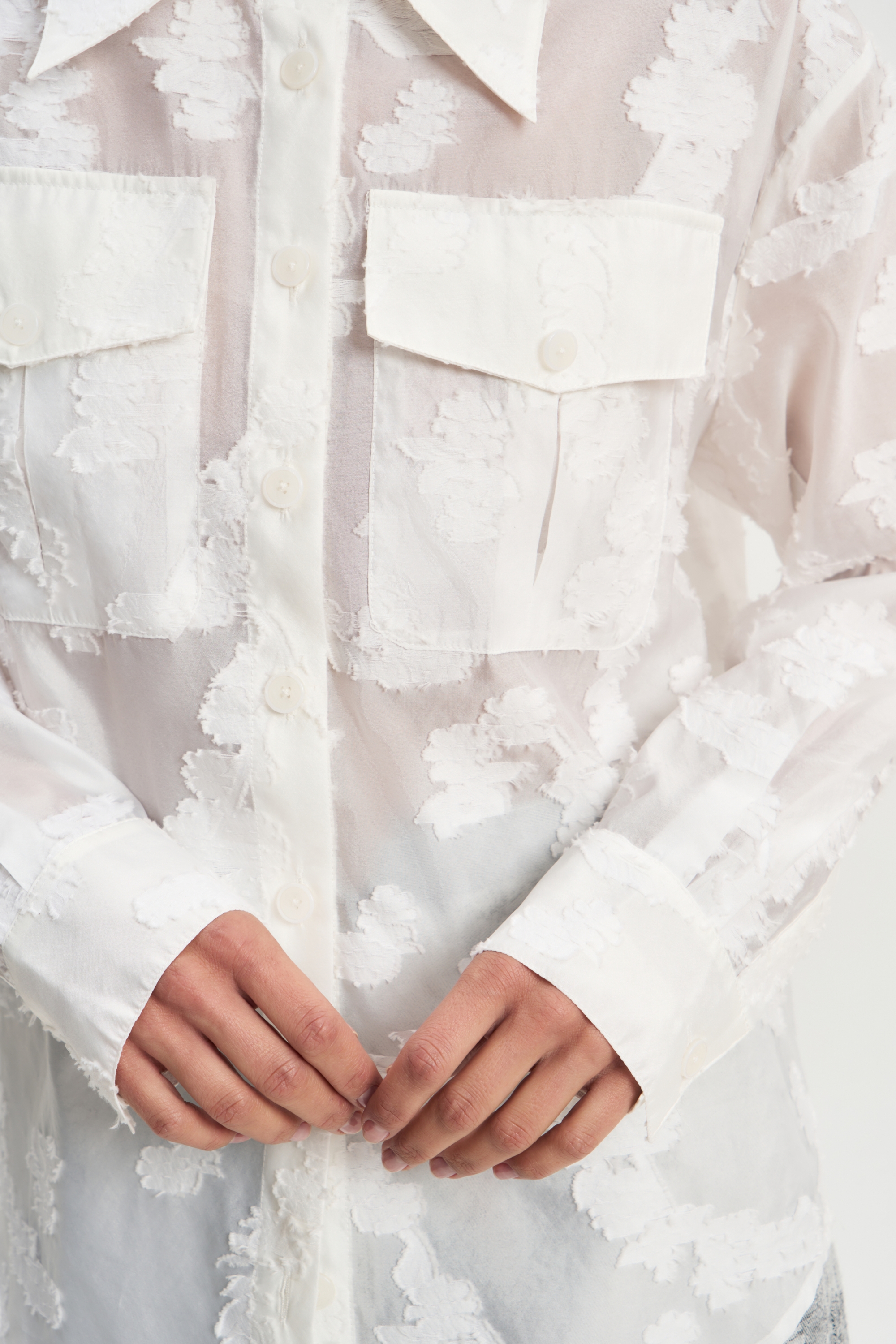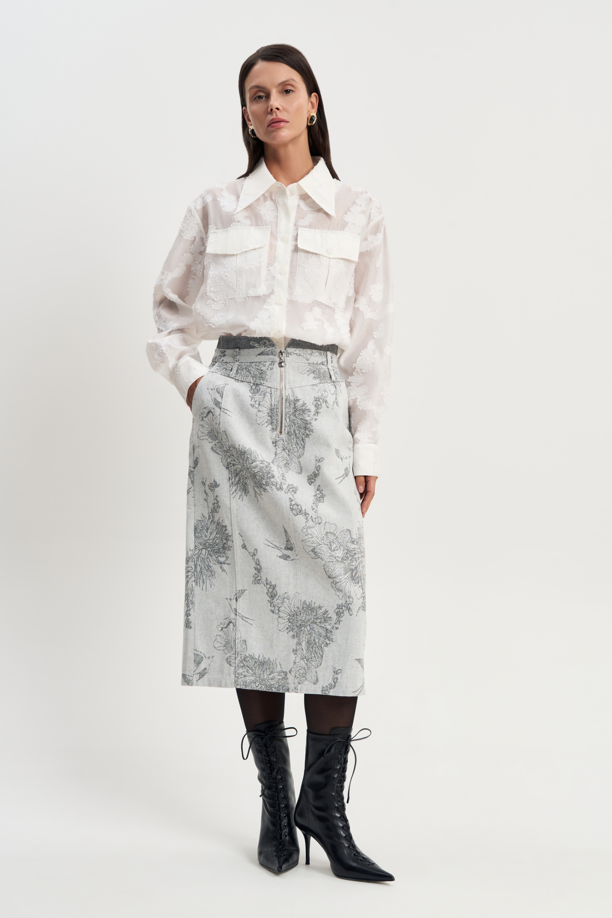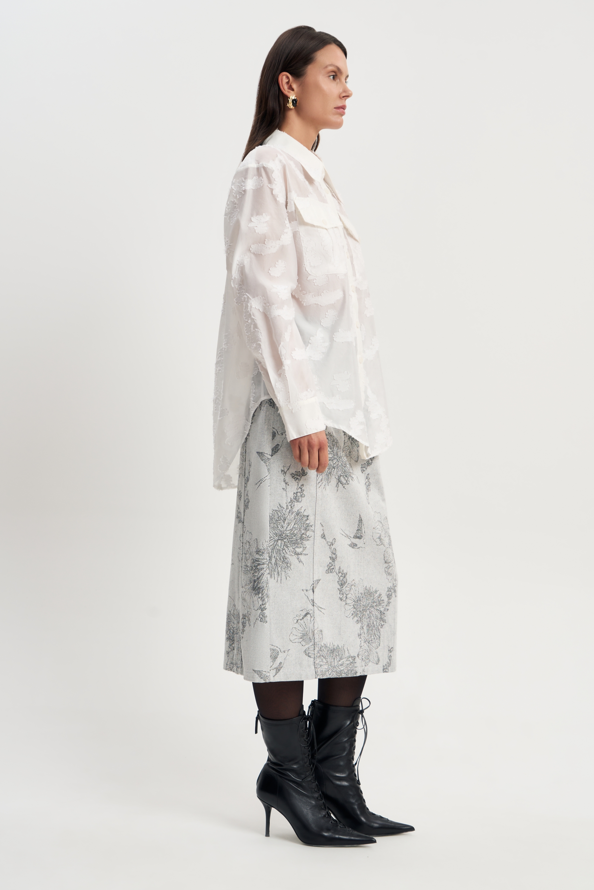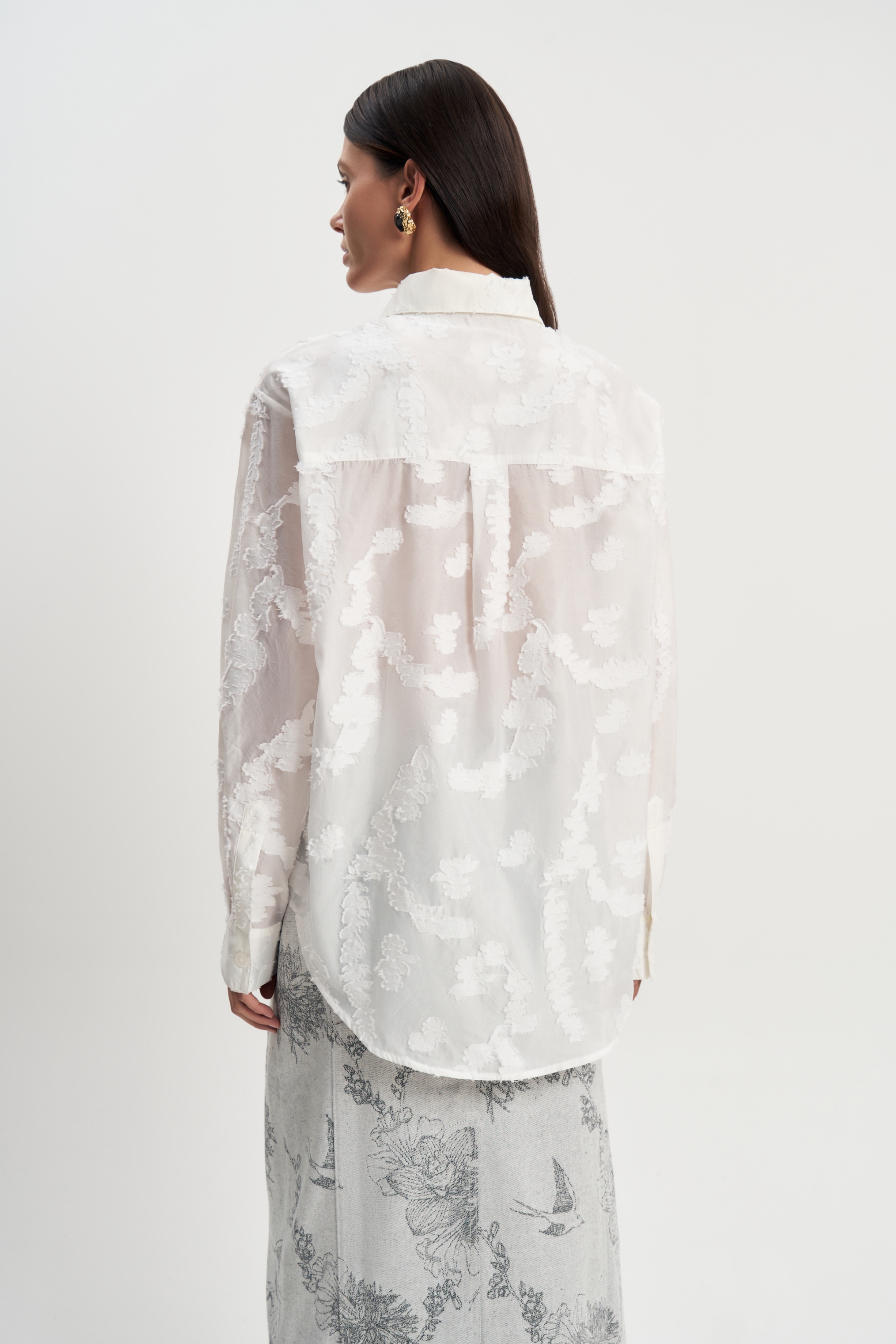 Нежная романтичная блузка с бархатистыми цветами на полупрозрачном фоне. Блузка свободного кроя, очень комфортная, прекрасно сочетается и с классическими вещами и с джинсовым шиком. Прекрасный вариант и для офиса и для клубной вечеринки.