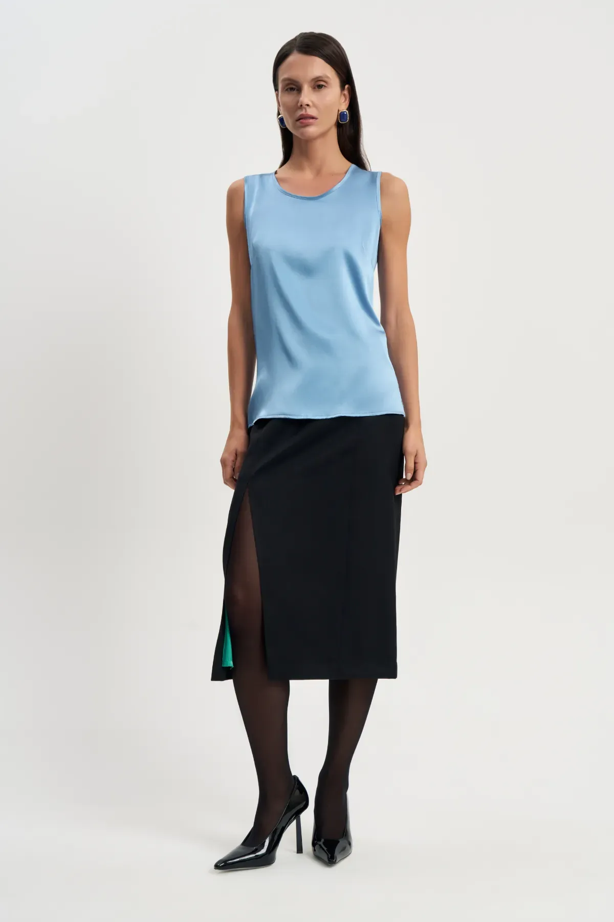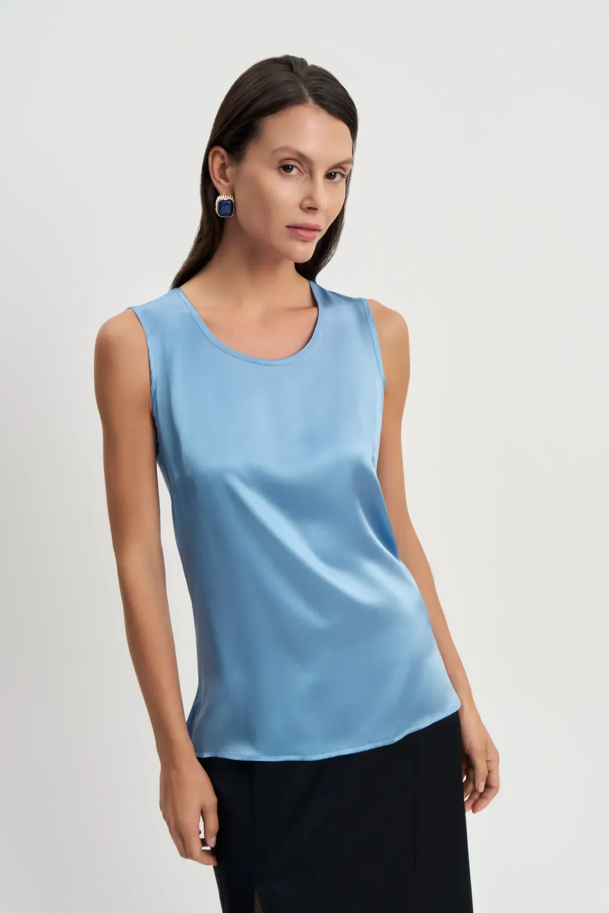 Легкий и утончённый шелковый топ голубого оттенка станет универсальной основой вашего гардероба. Сочетайте этот топ свободного кроя с юбками или классическими брюками, чтобы создать изысканный офисный образ. Для более современного стиля рекомендуем попробовать с джинсой.