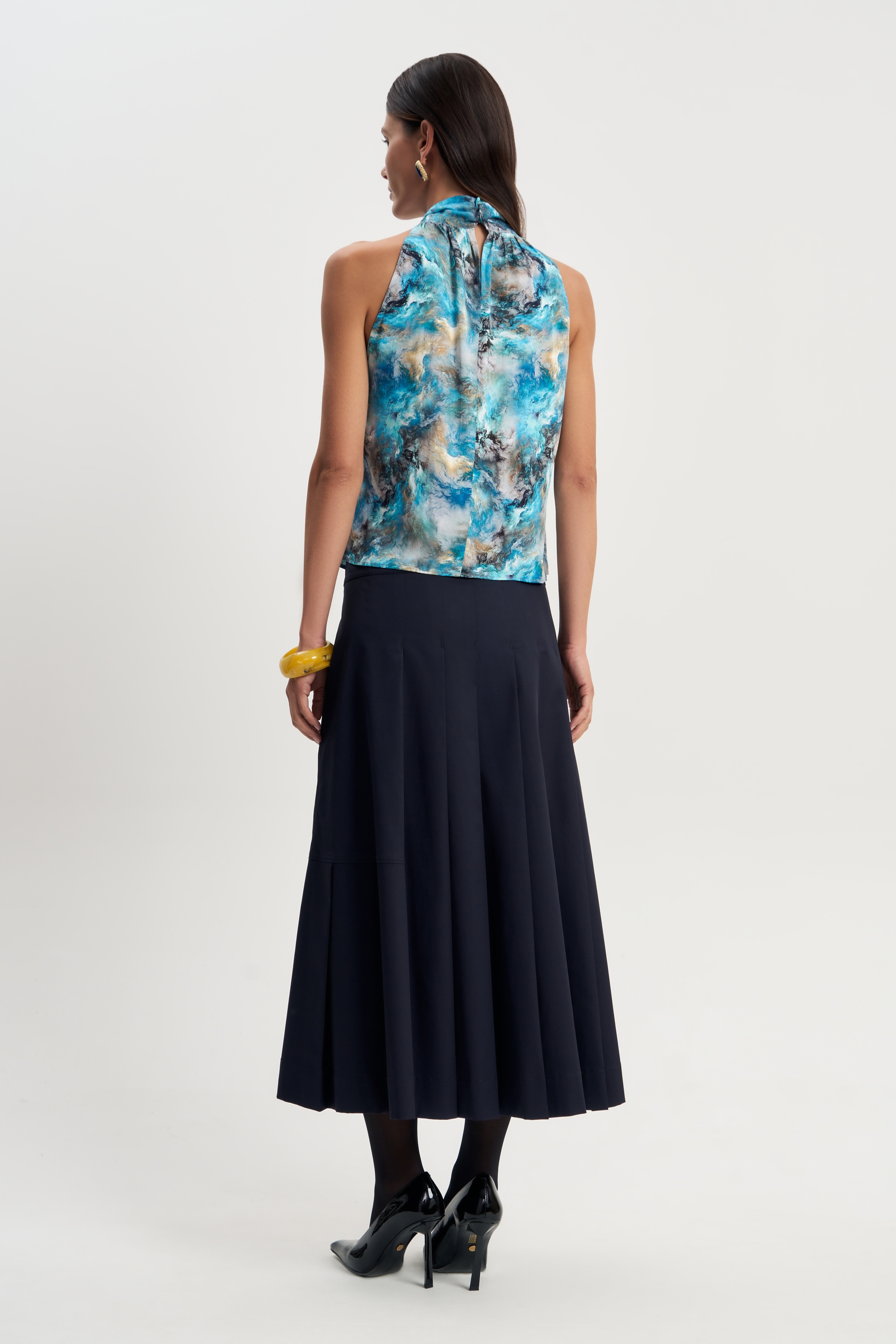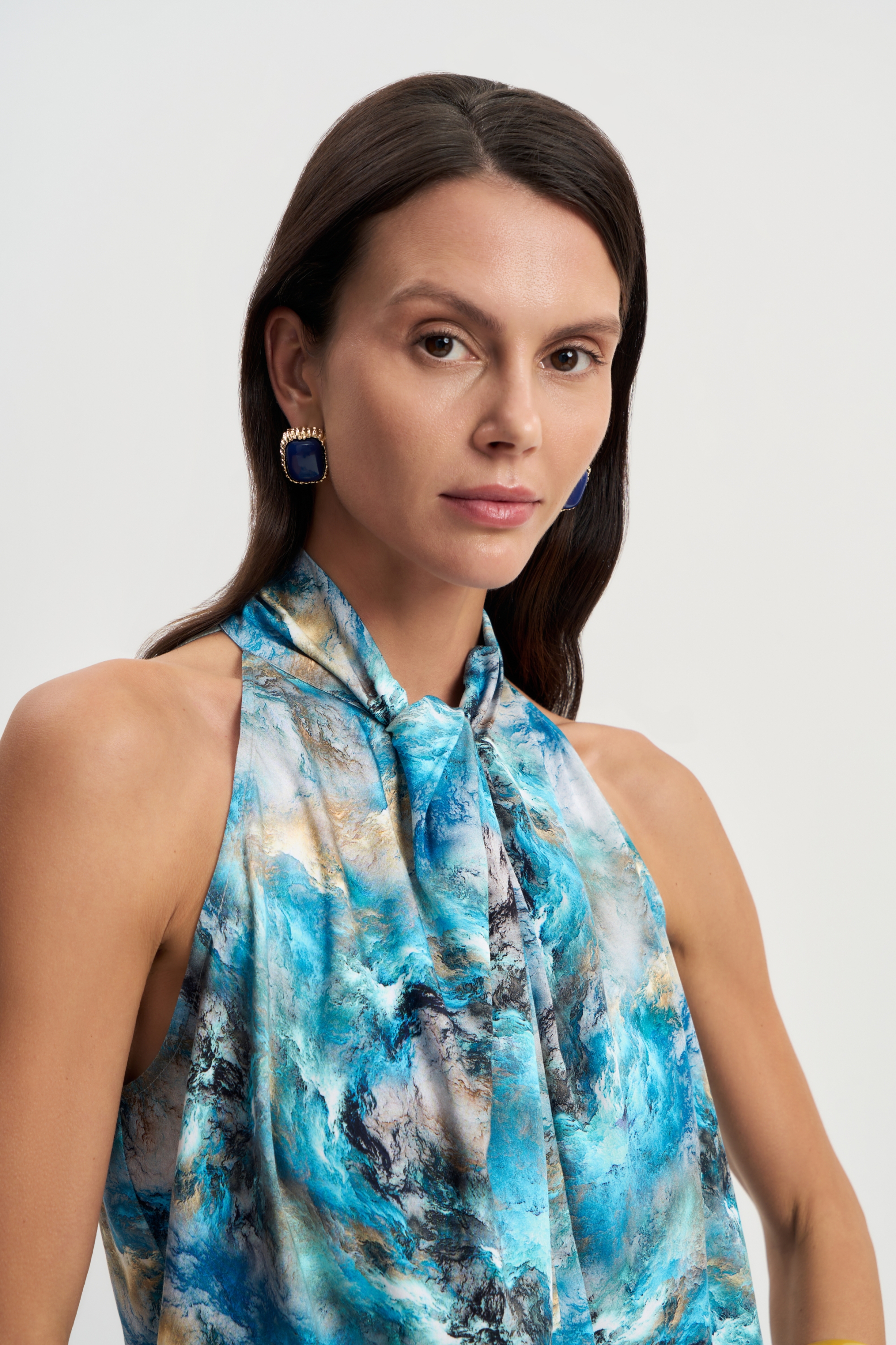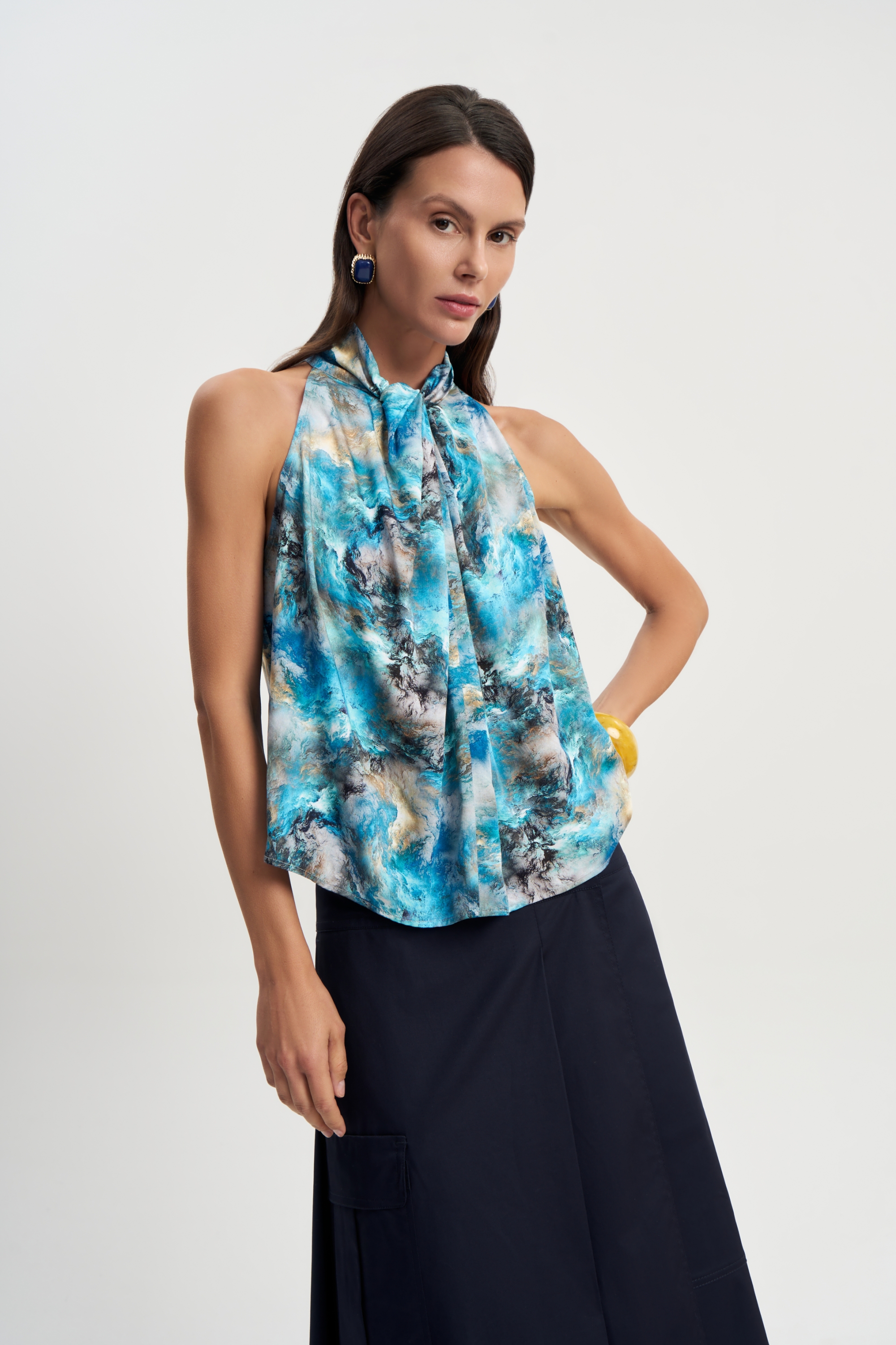 Шелковистый топ Море мягко прилегает к телу и комфортен в жаркую погоду. Горловина стойка украшена изящным узлом. Американская пройма красиво подчеркивает плечи. Прекрасно сочетается с любыми оттенками бежевого и голубого.