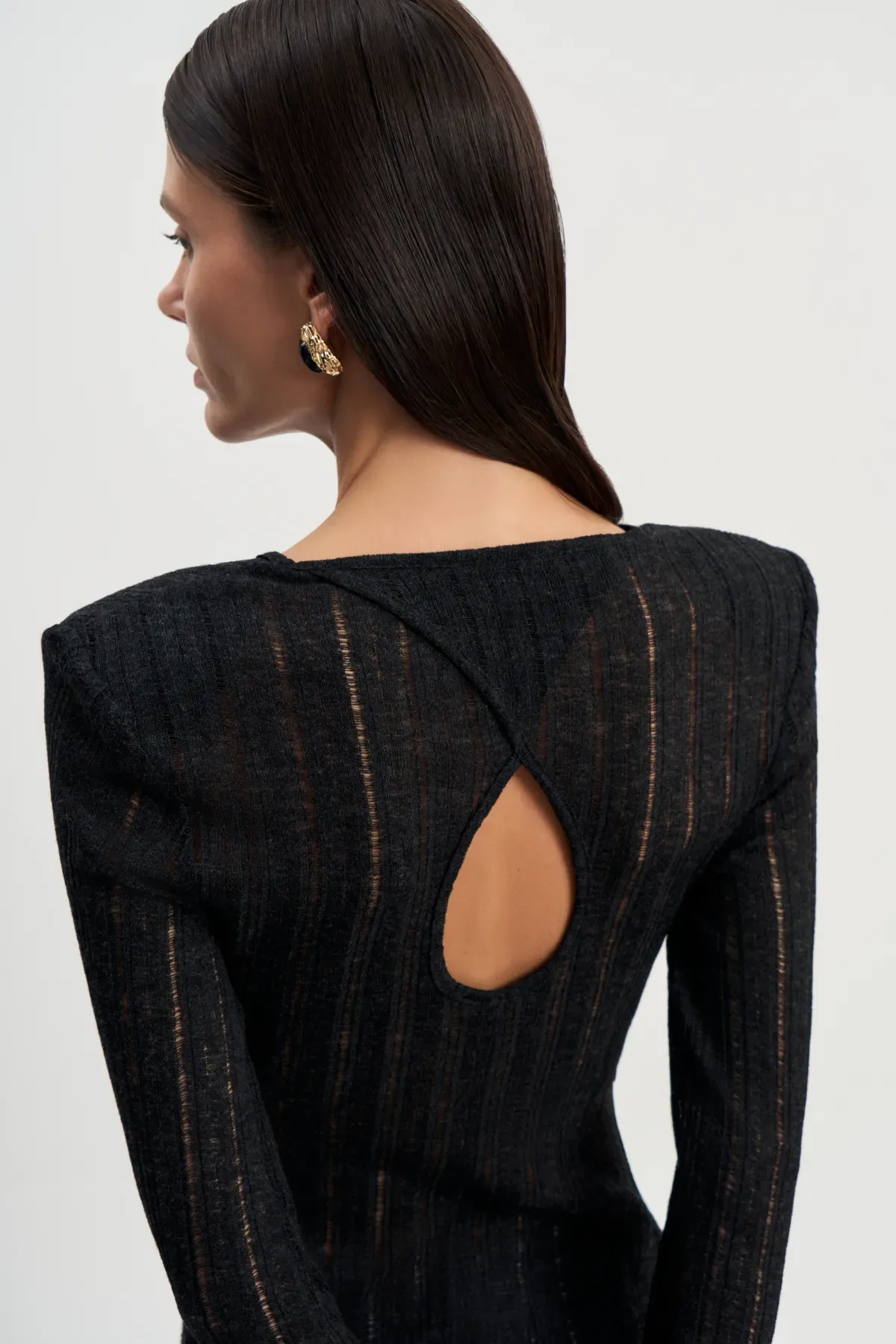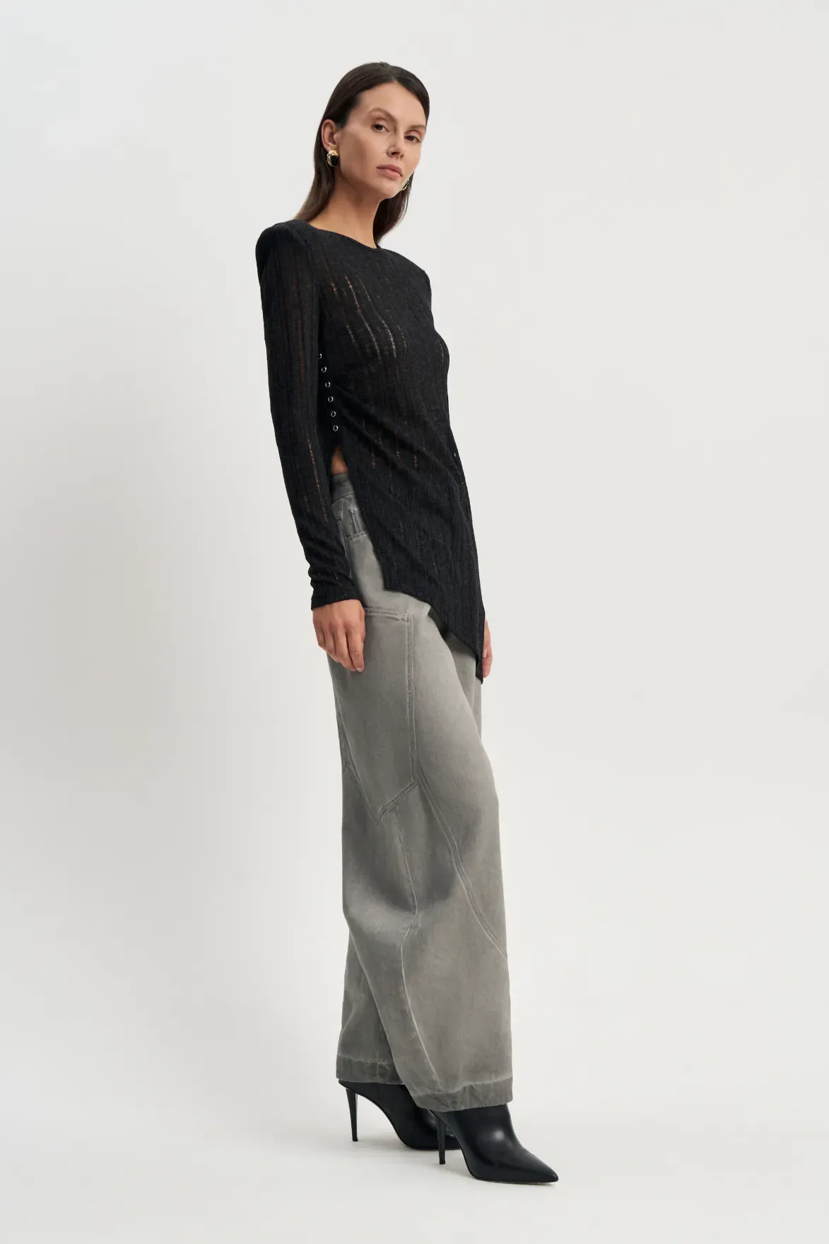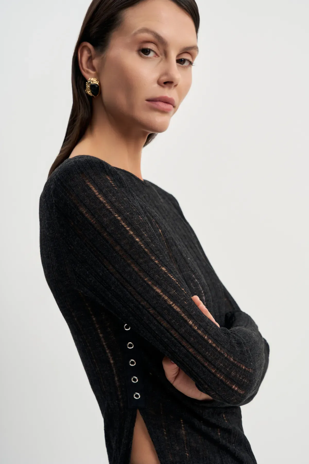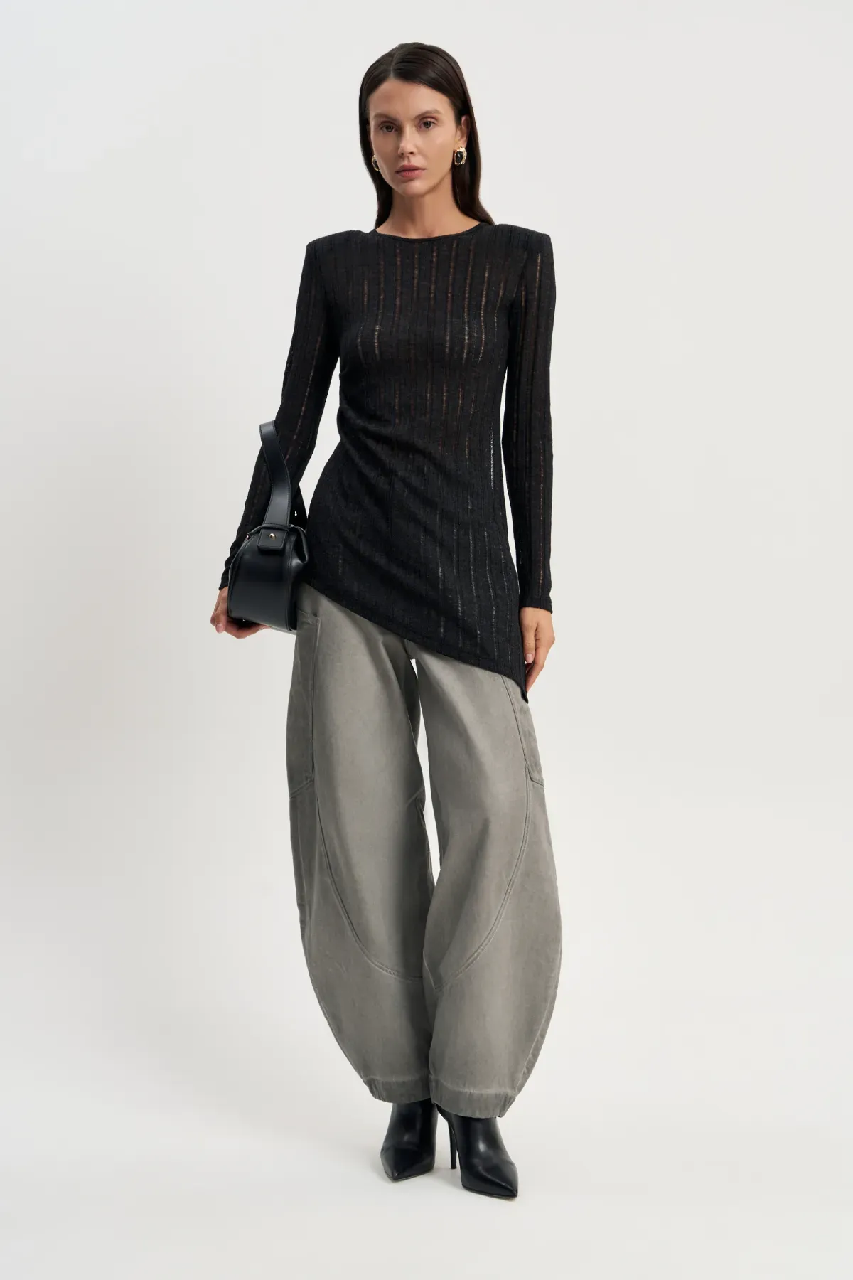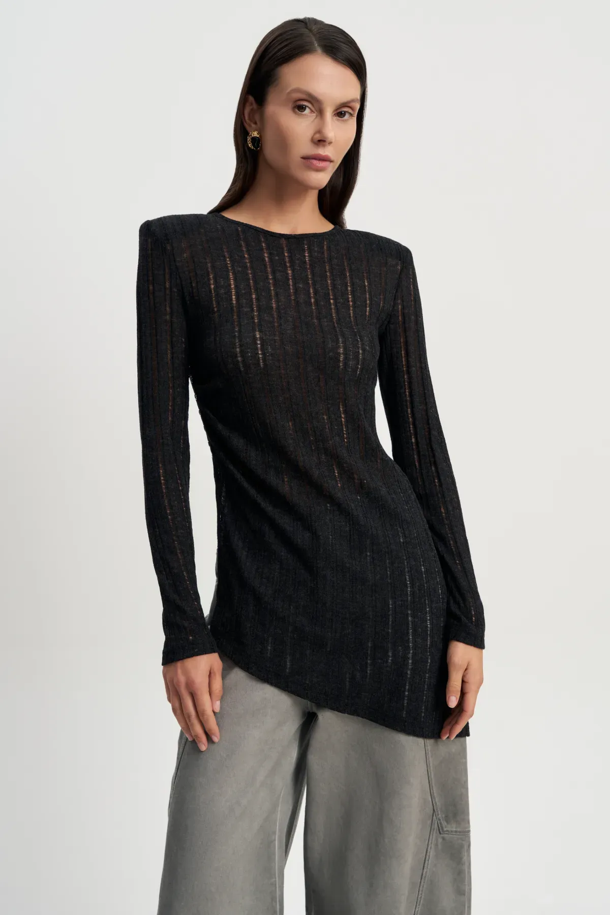 Джемпер «Ассиметрия» с удлинённым силуэтом удивляет неожиданной геометрией. Асимметричный подол, разрез сбоку до талии и полупрозрачные полосы создают ощущение элегантного футуризма, этот черный джемпер отлично смотрится с джинсами или брюками.