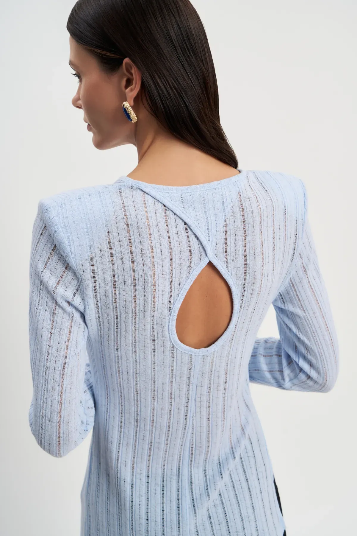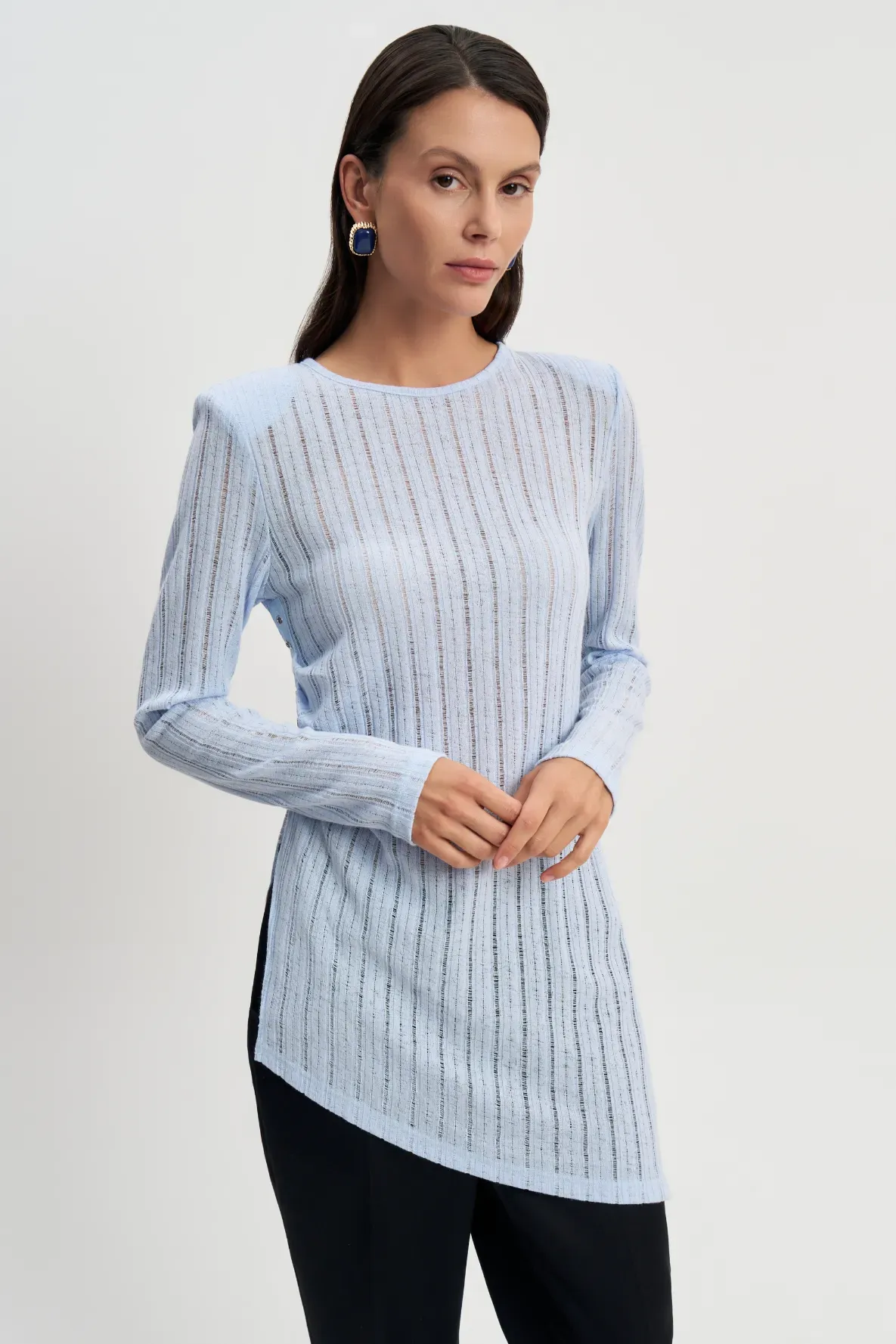 Джемпер «Ассиметрия» — удлинённый силуэт с неожиданной геометрией. Асимметричный подол, разрез сбоку до талии и полупрозрачные полосы создают ощущение элегантного футуризма, выполнен в нежно-голубом цвете. Отлично смотрится с джинсами или брюками. На фото представлен в комплекте с джинсами "Голубая кромка"