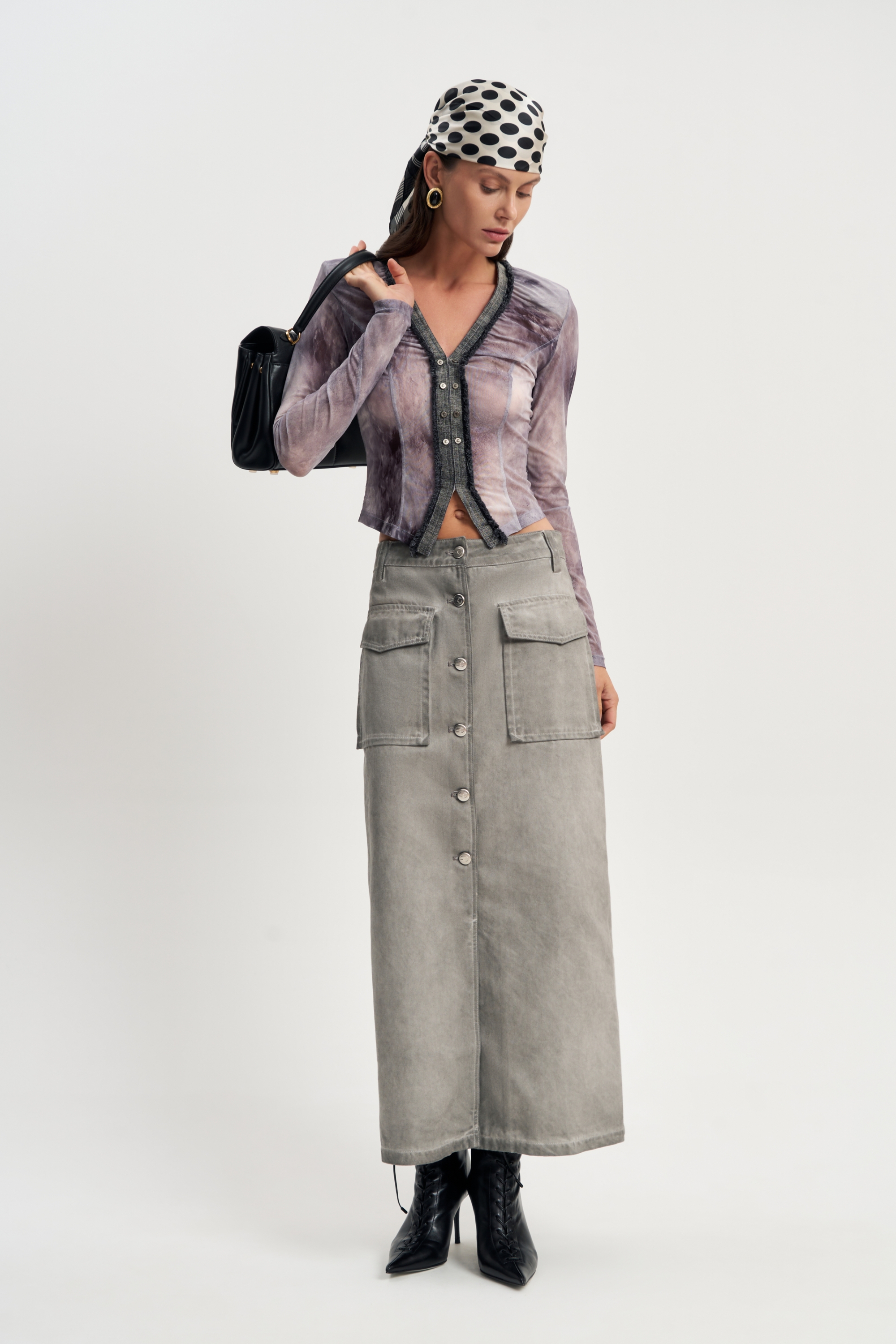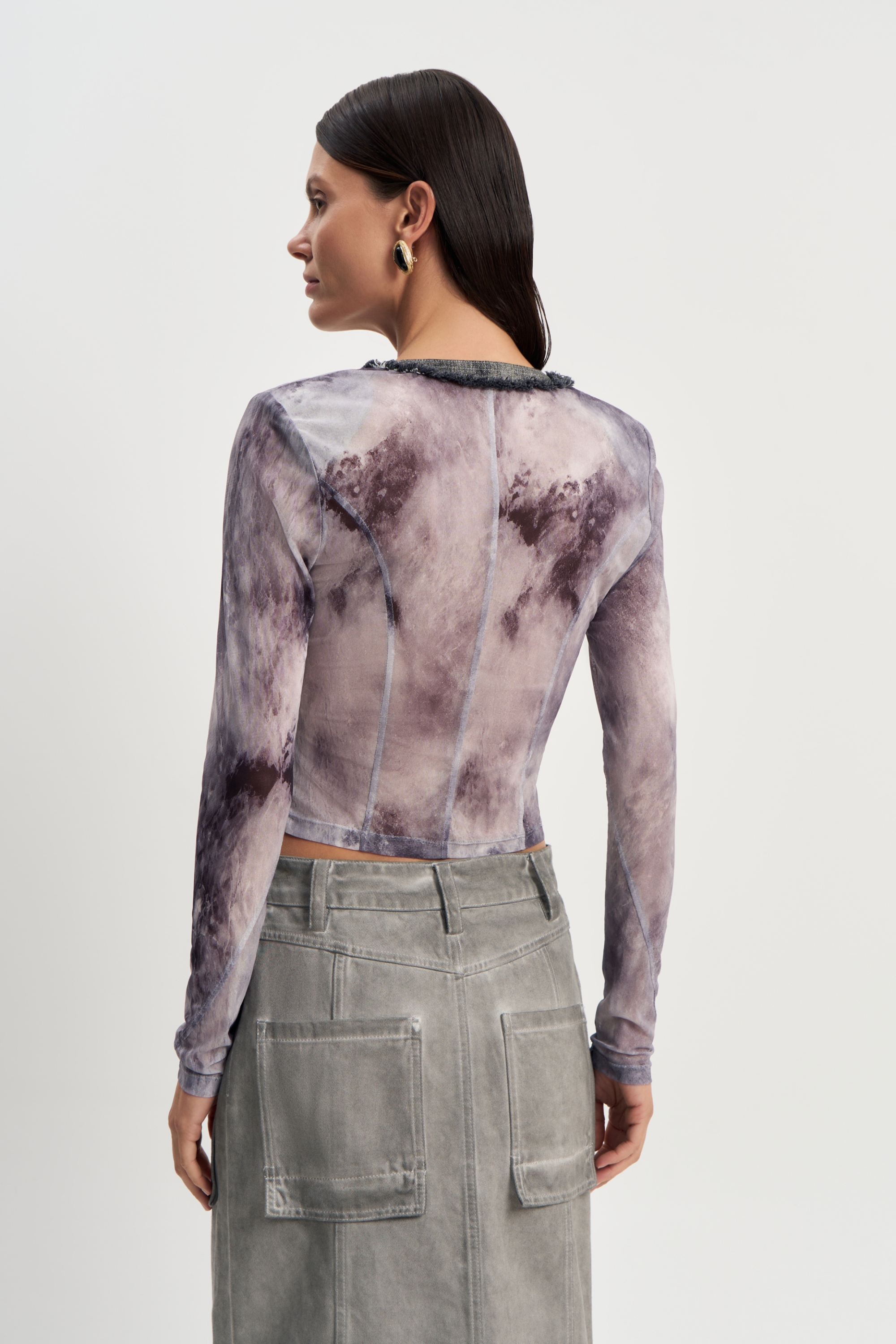 Лёгкий полупрозрачный топ с необычным принтом навевает на мысли о далеких галактиках. Короткий крой до талии, аккуратные пуговицы — просто и космически красиво.