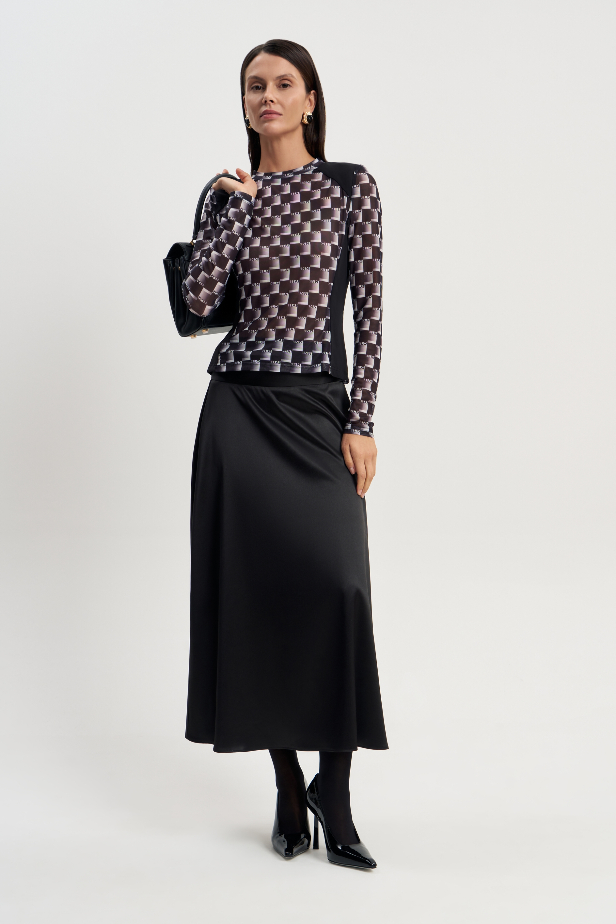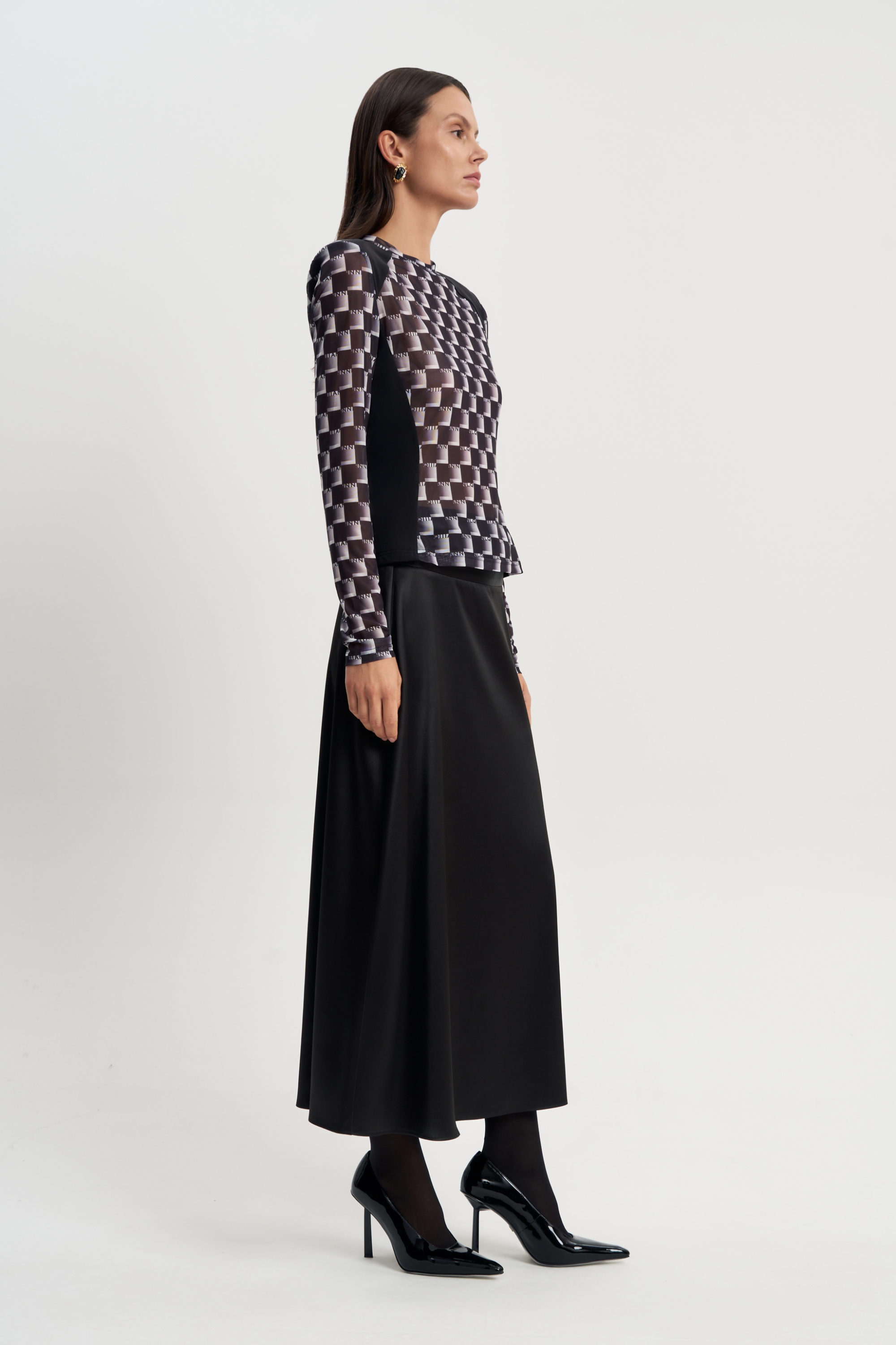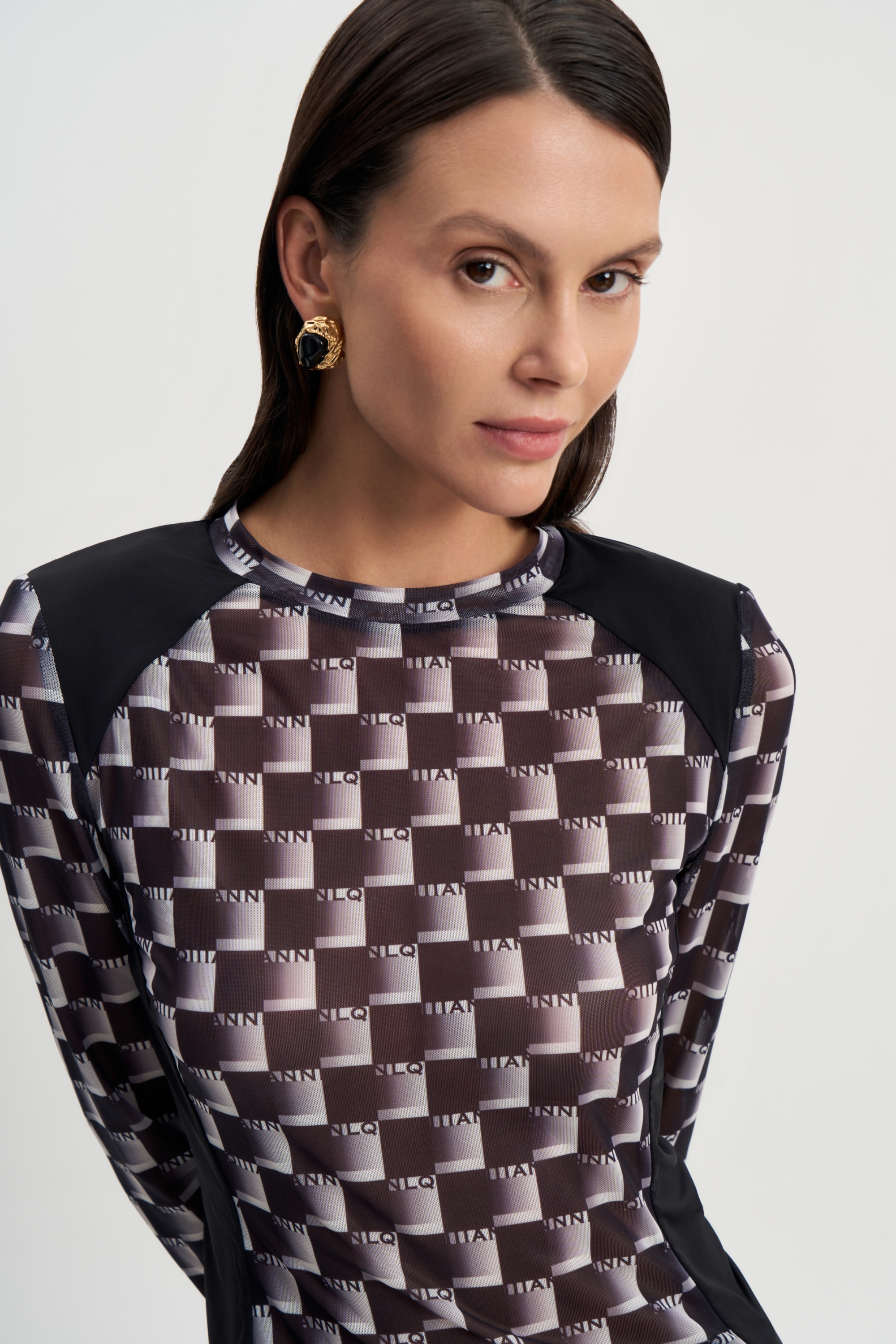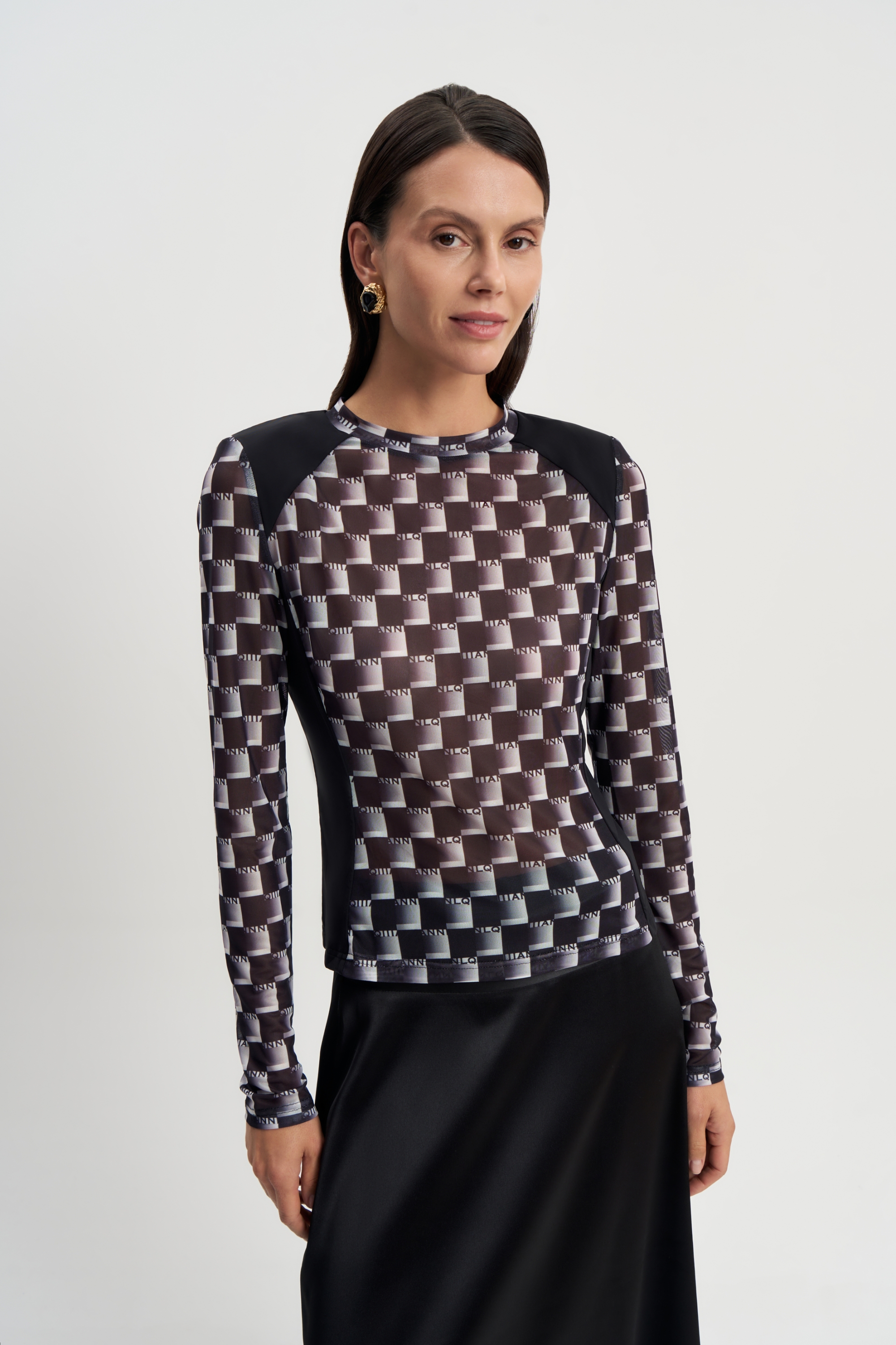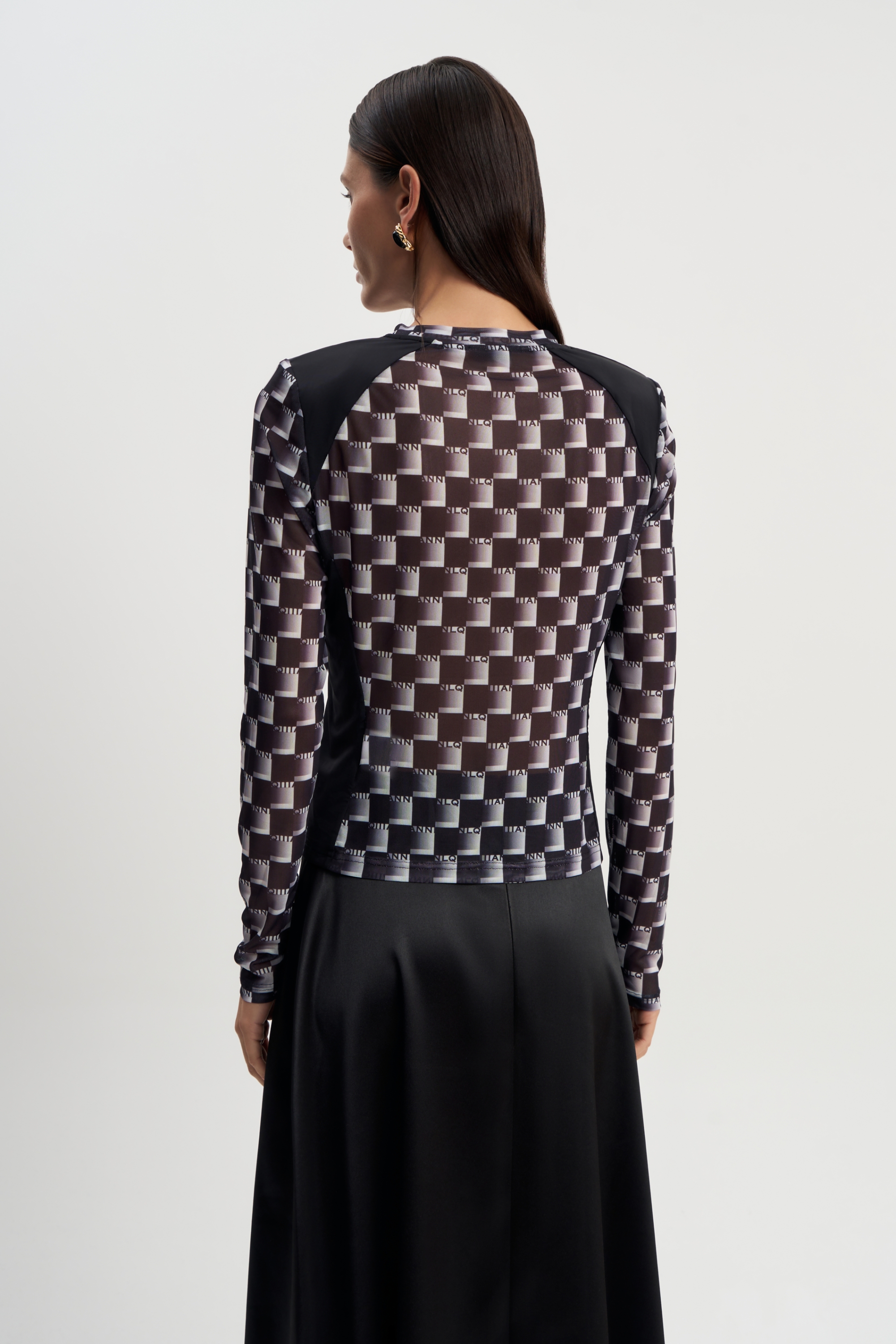 Облегающий полупрозрачный топ с длинными рукавами. Чёрно-белый принт имитирует шахматное поле, создавая оптическое движение по телу. Плотные треугольные вставки на плечах акцентируют силуэт и придают конструкции ритм.