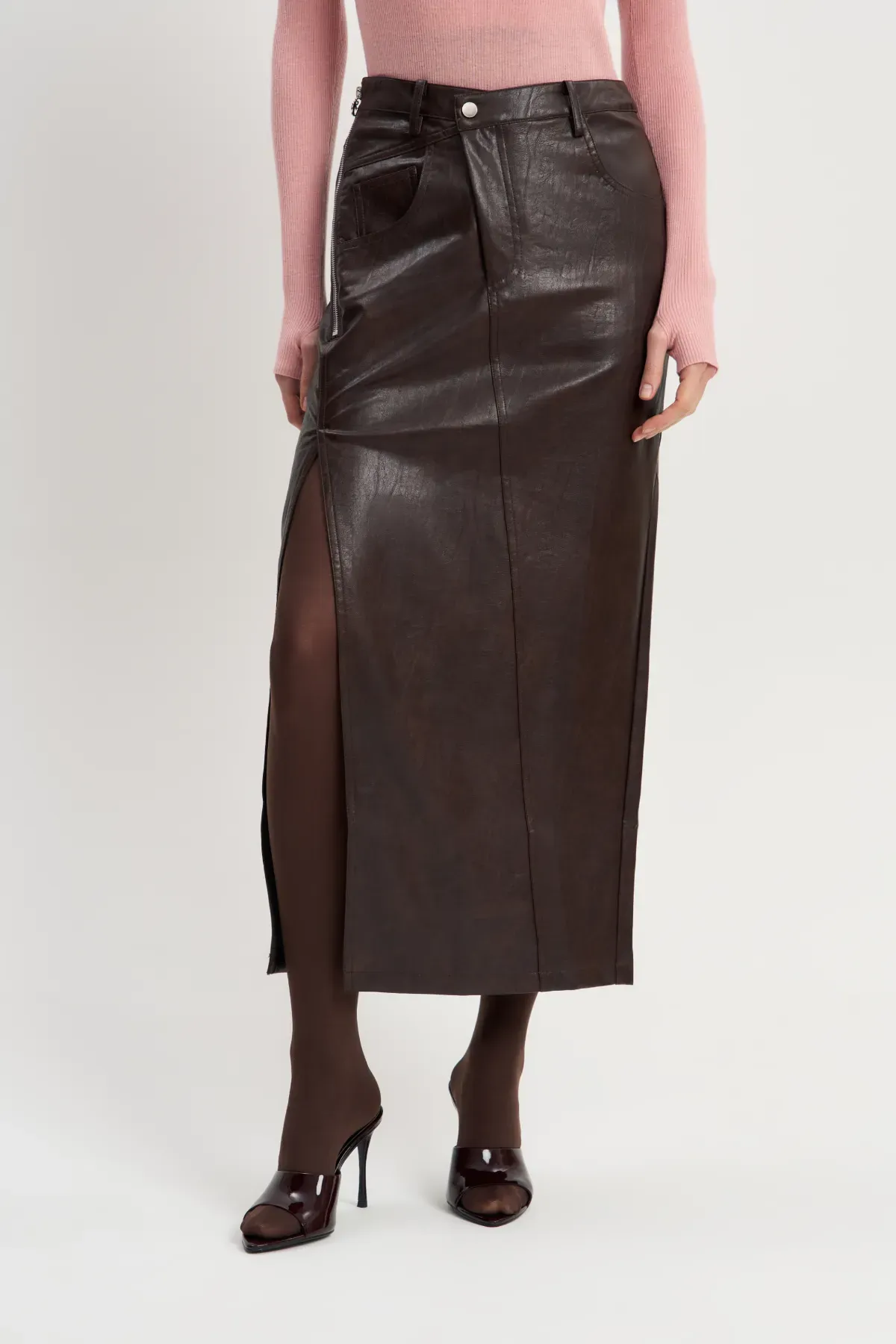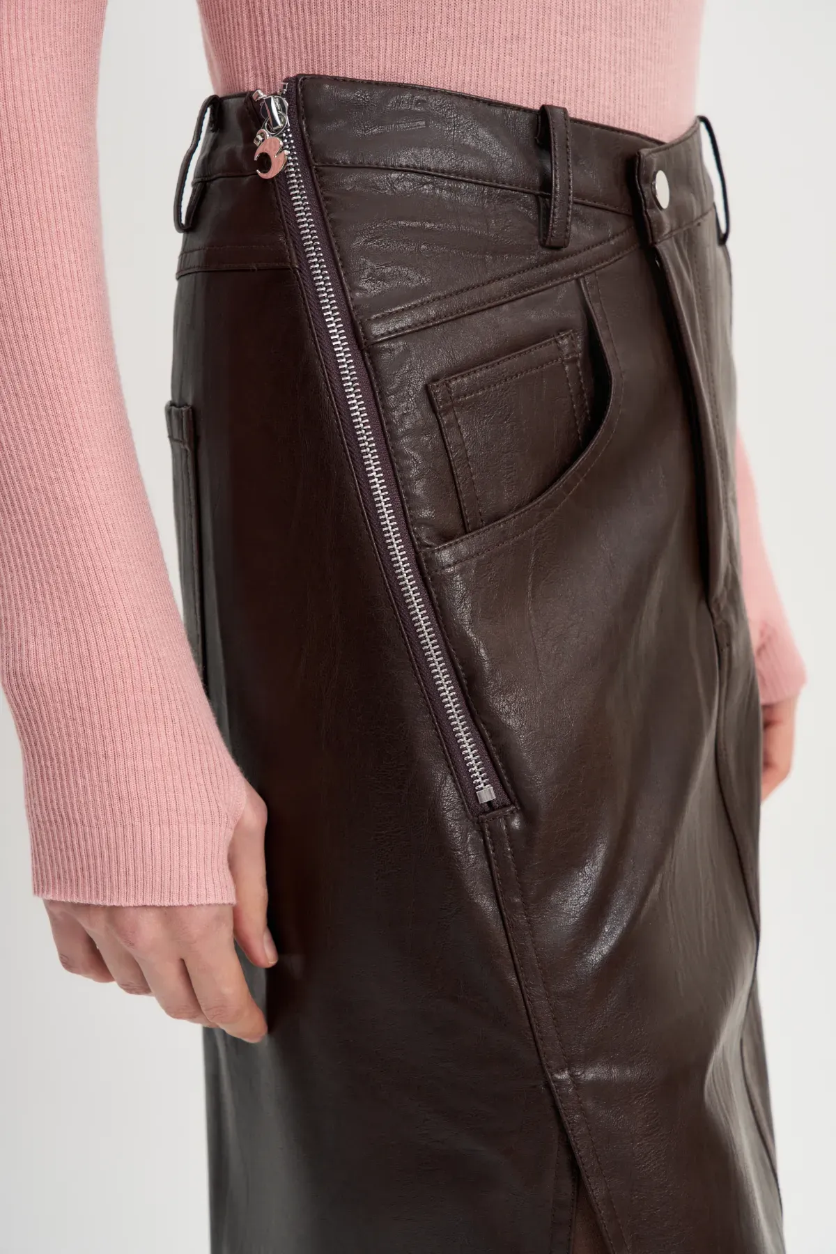Юбка Travel сшита из последнего поколения дышащей экокожи PU, которое отличает мягкость, эластичность и приятный блеск натуральной кожи. Необычный крой с двумя молниями разной длины, расположенными не вертикально, а наискосок, обеспечивает идеальную посадку и притягивает внимание дизайном и стилем.