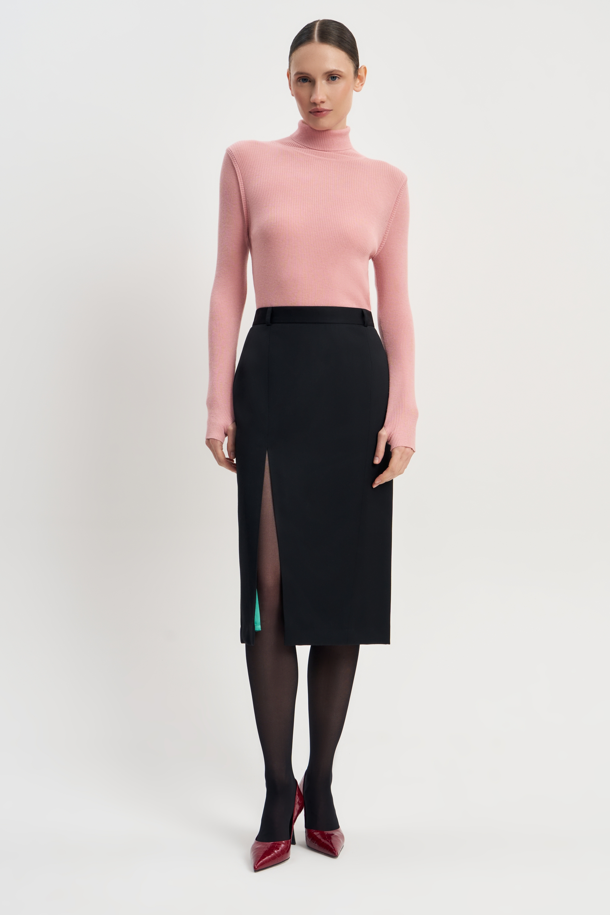 Черная юбка с высоким разрезом — идеальный баланс классики и смелых акцентов. Классический крой с длиной чуть ниже колена подчеркивает элегантность, а высокий разрез добавляет образу дерзости и сексуальности. Главная изюминка - ярко-зеленая подкладка, привлекающая внимание и добавляющая нотки уверенности и уникальности.