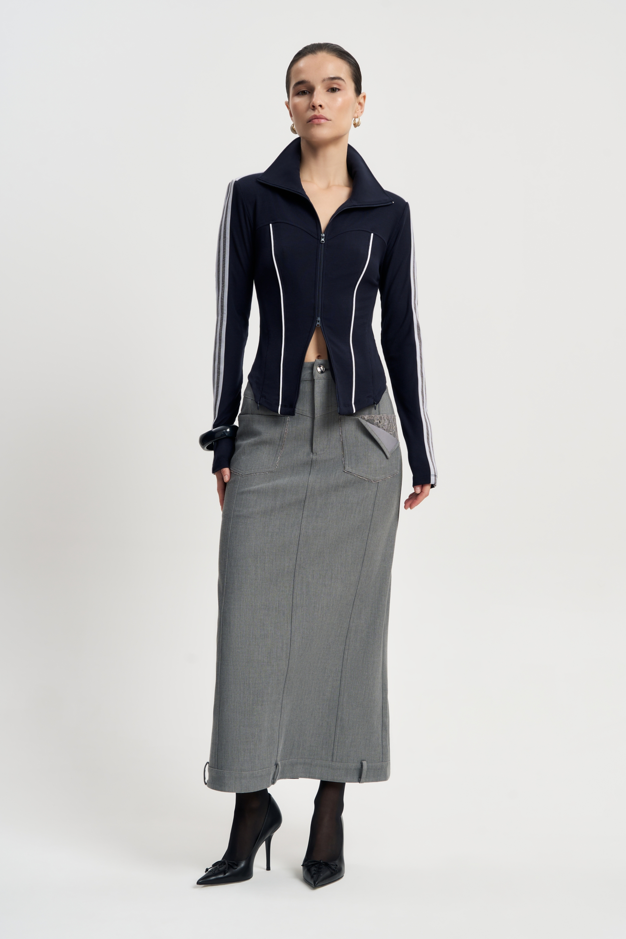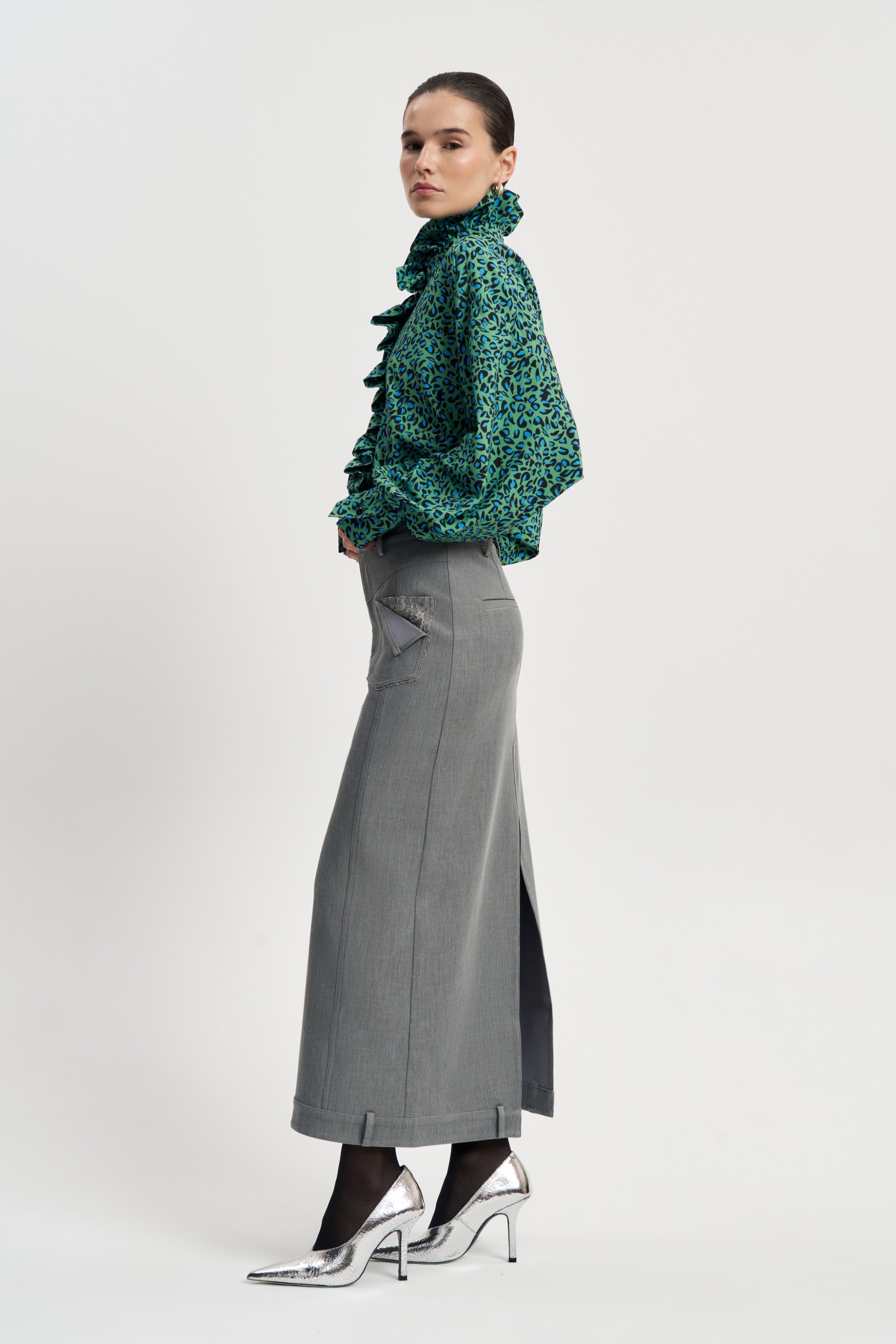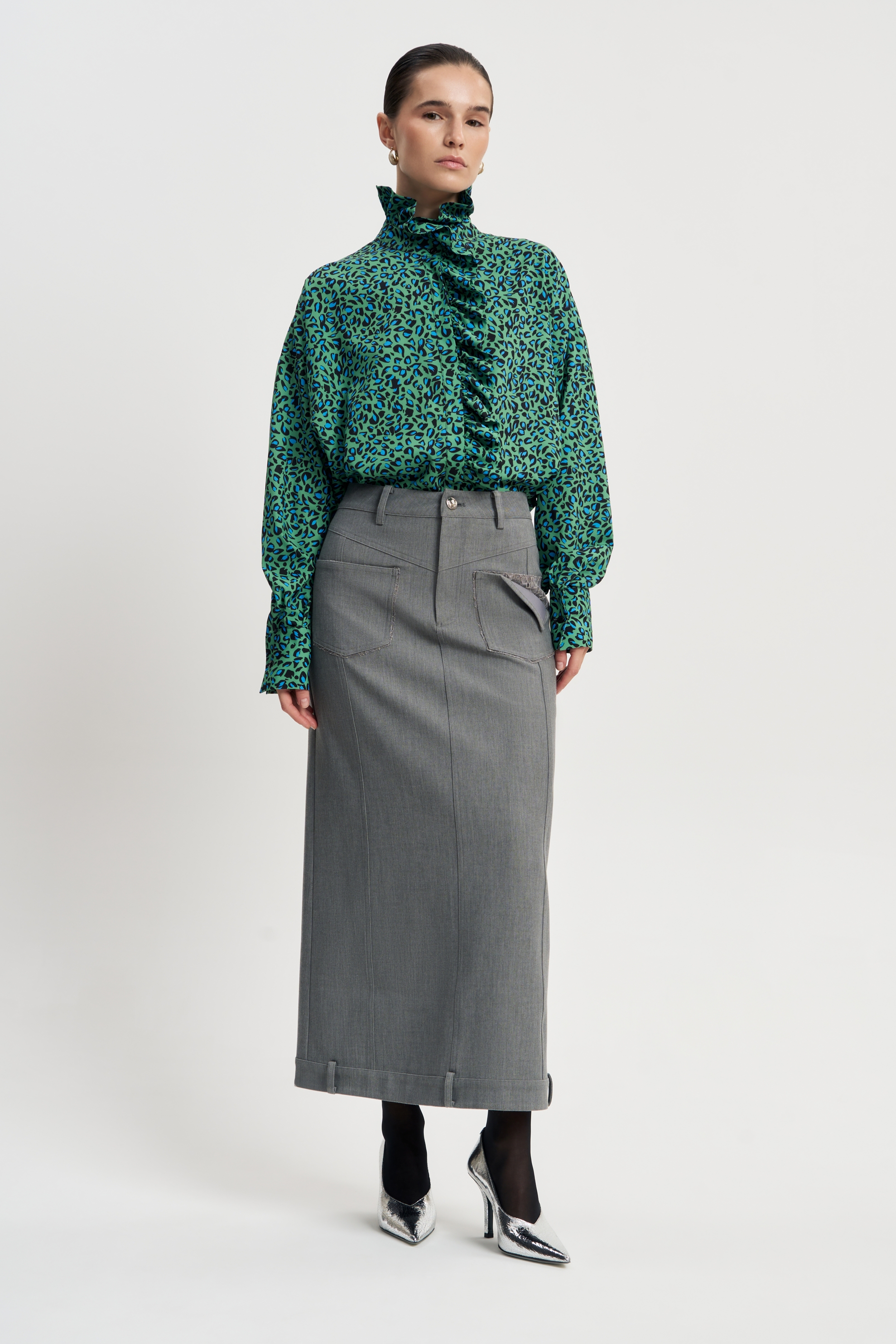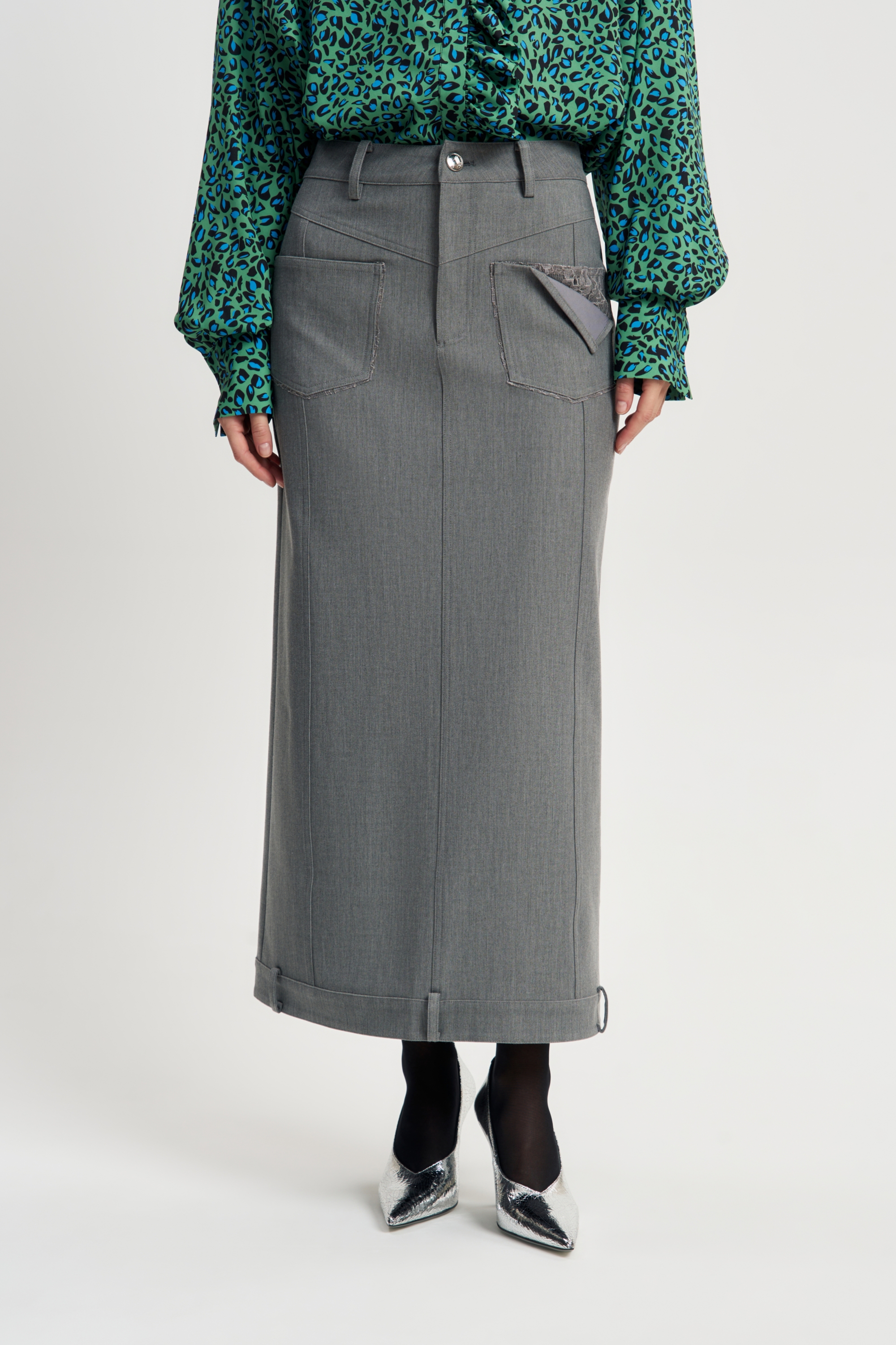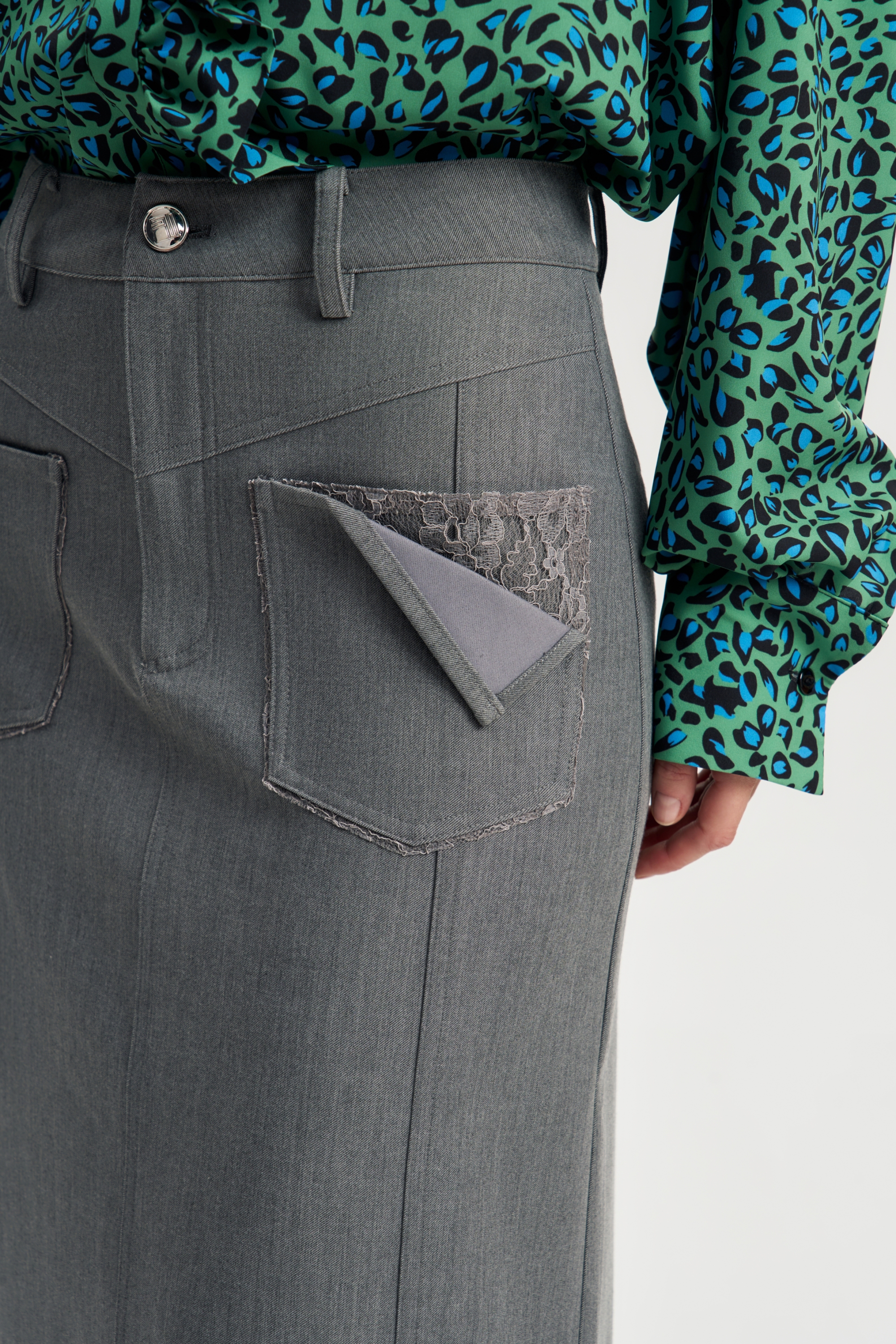 Сдержанная элегантность и архитектурная точность — юбка миди в благородном сером цвете. Два крупных кармана на бёдрах придают образу современную структуру, а неожиданный акцент — декоративная отделка одного из карманов тончайшим кружевом, будто выглядывающим из-под отогнутого края, — добавляет чувственность.