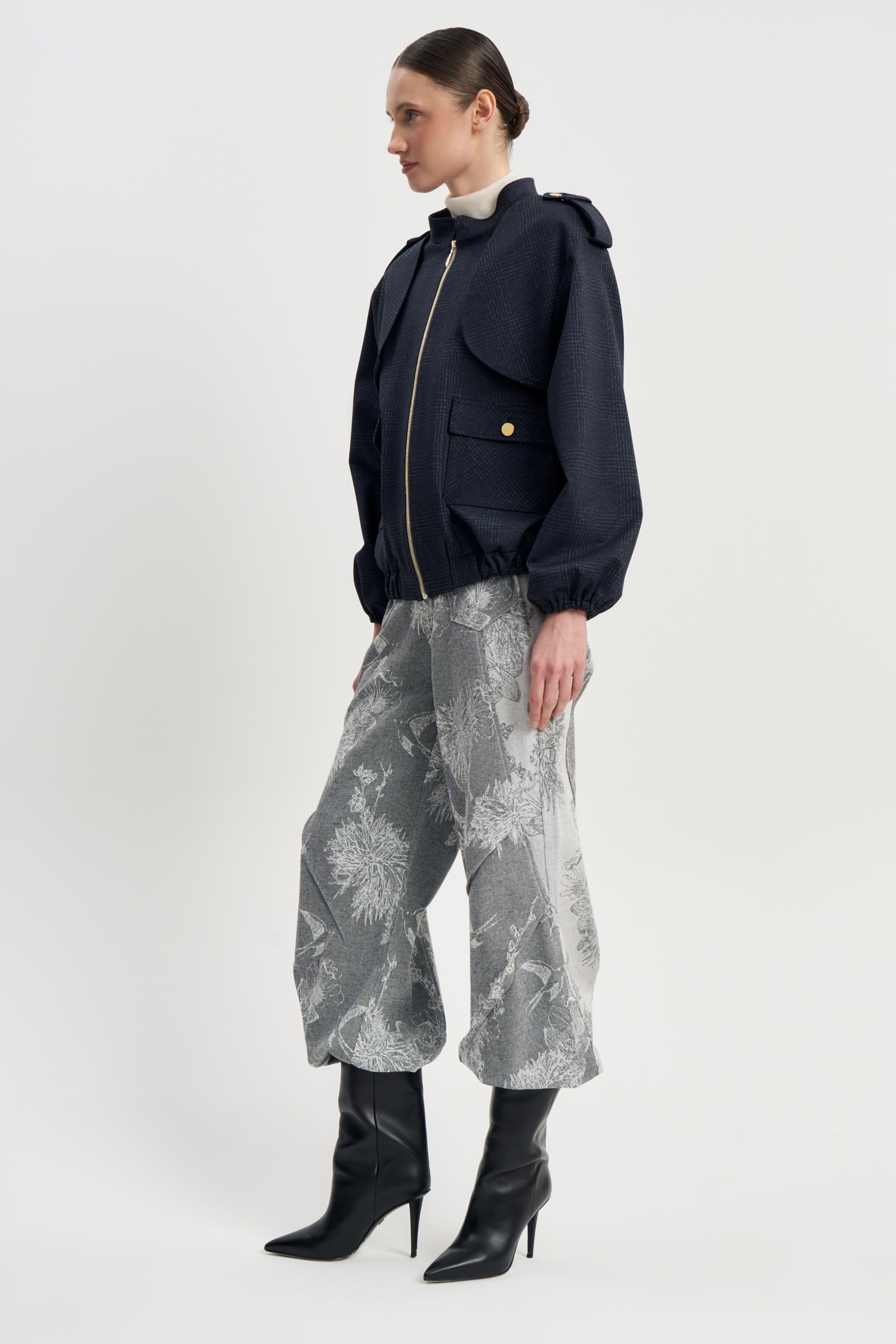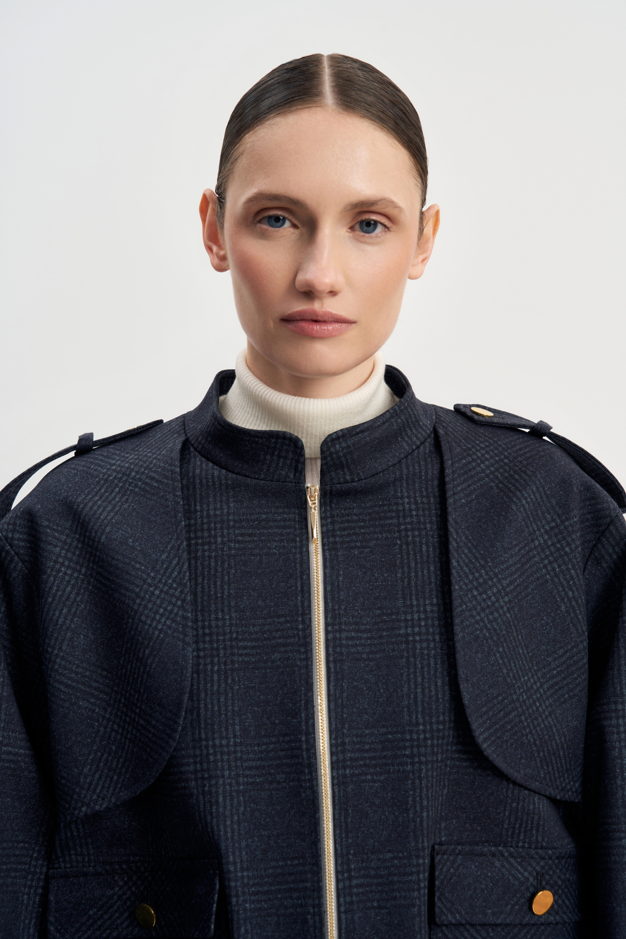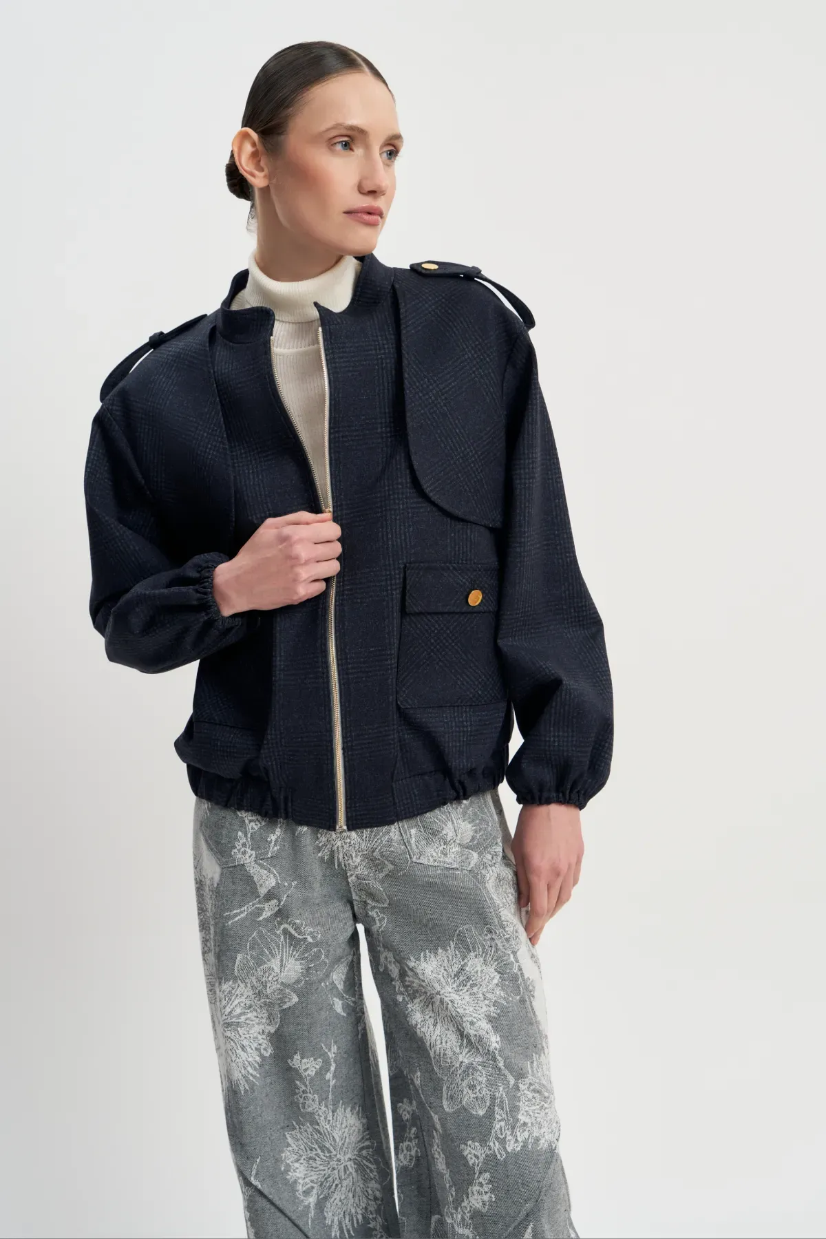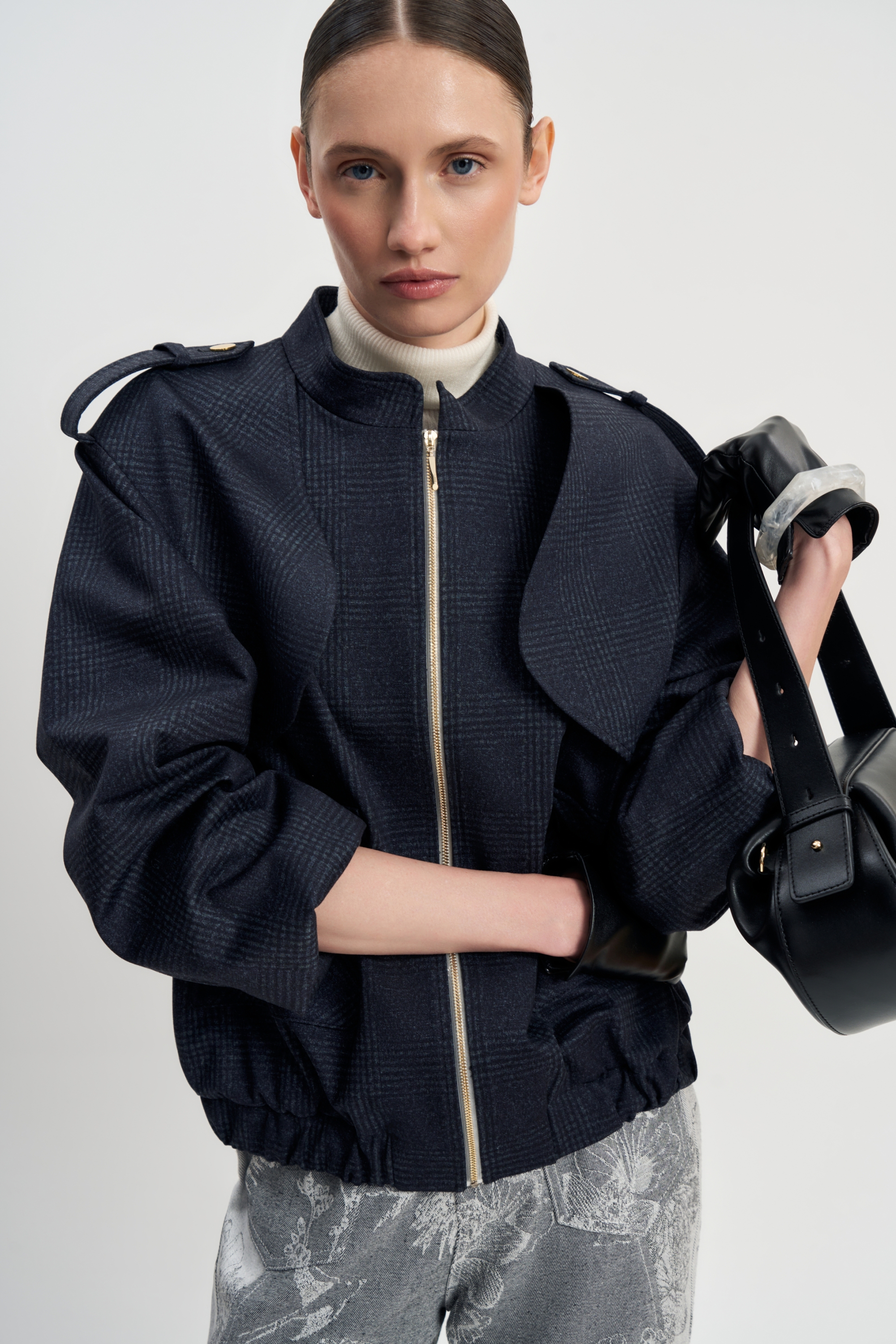 Бомбер сшит из плотной ткани в английскую клетку темно-серого цвета. Бомбер на молнии, на подкладке, украшен погонами, клапанами, карманами с кнопками. Прекрасный вариант для города в прохладный день и для стильного загородного путешествия.