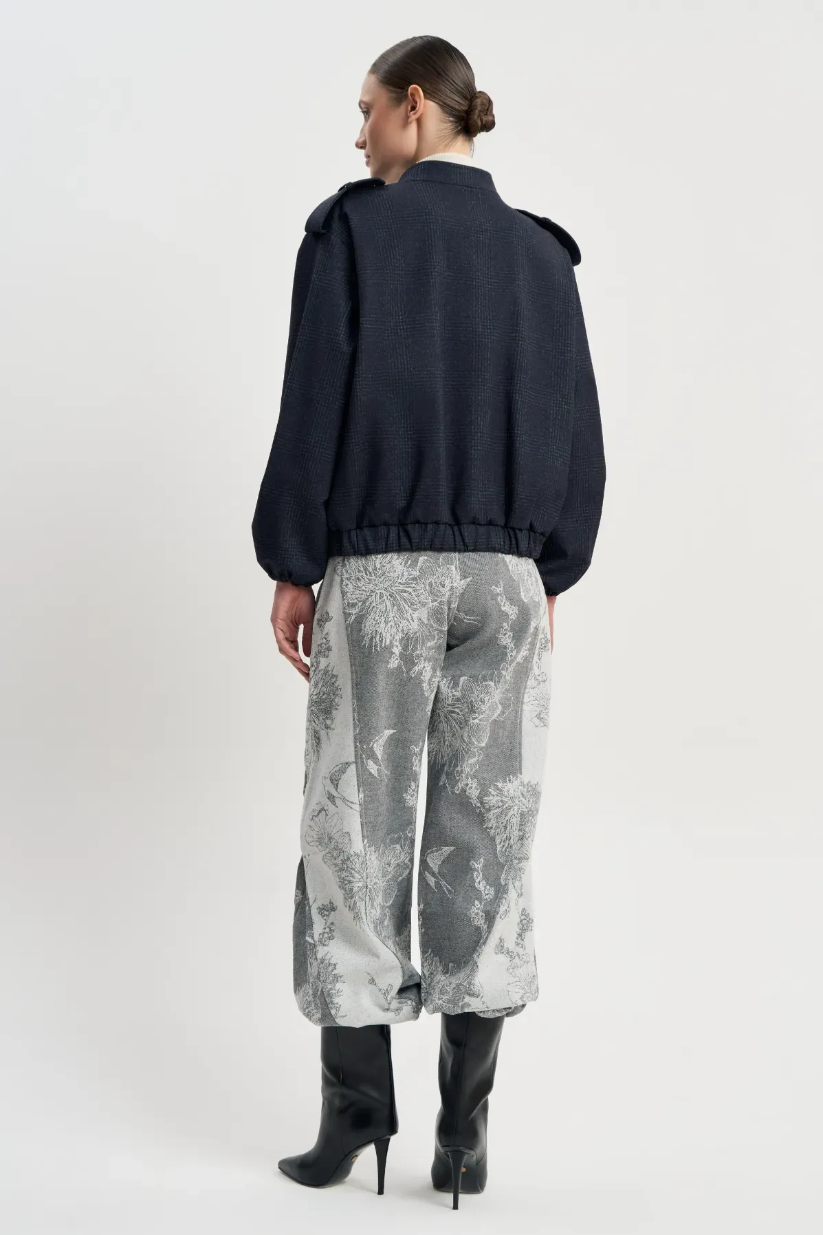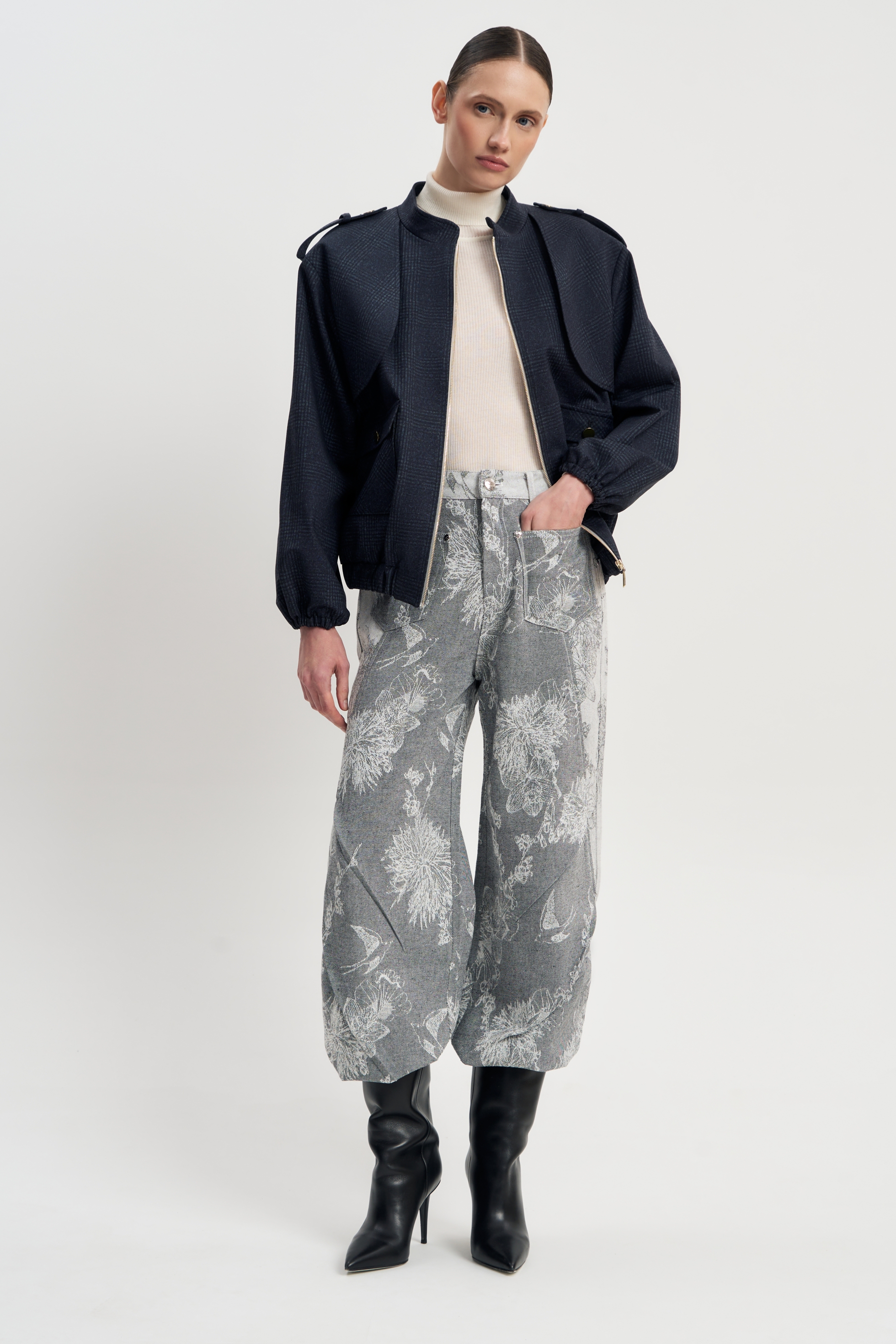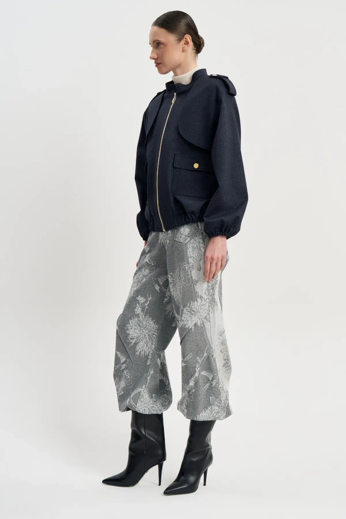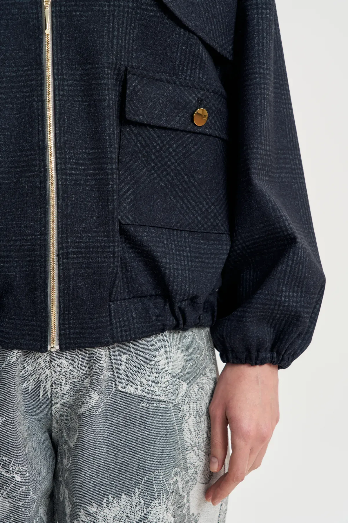 Бомбер сшит из плотной ткани в английскую клетку темно-серого цвета. Бомбер на молнии, на подкладке, украшен погонами, клапанами, карманами с кнопками. Прекрасный вариант для города в прохладный день и для стильного загородного путешествия.
