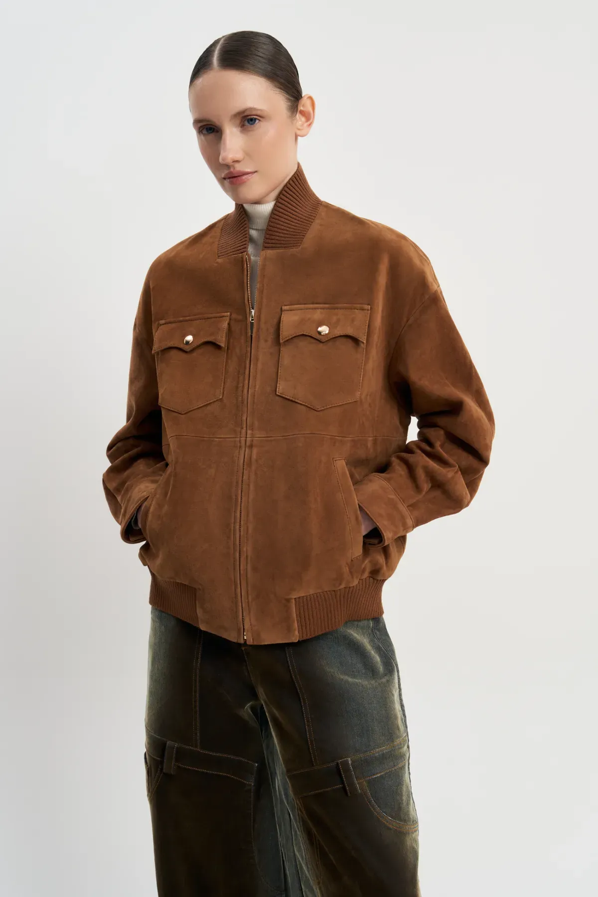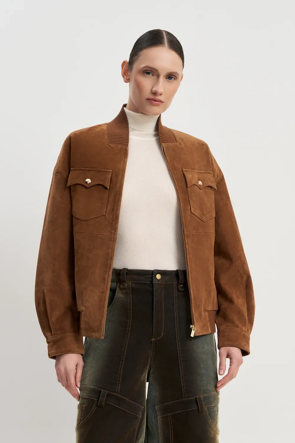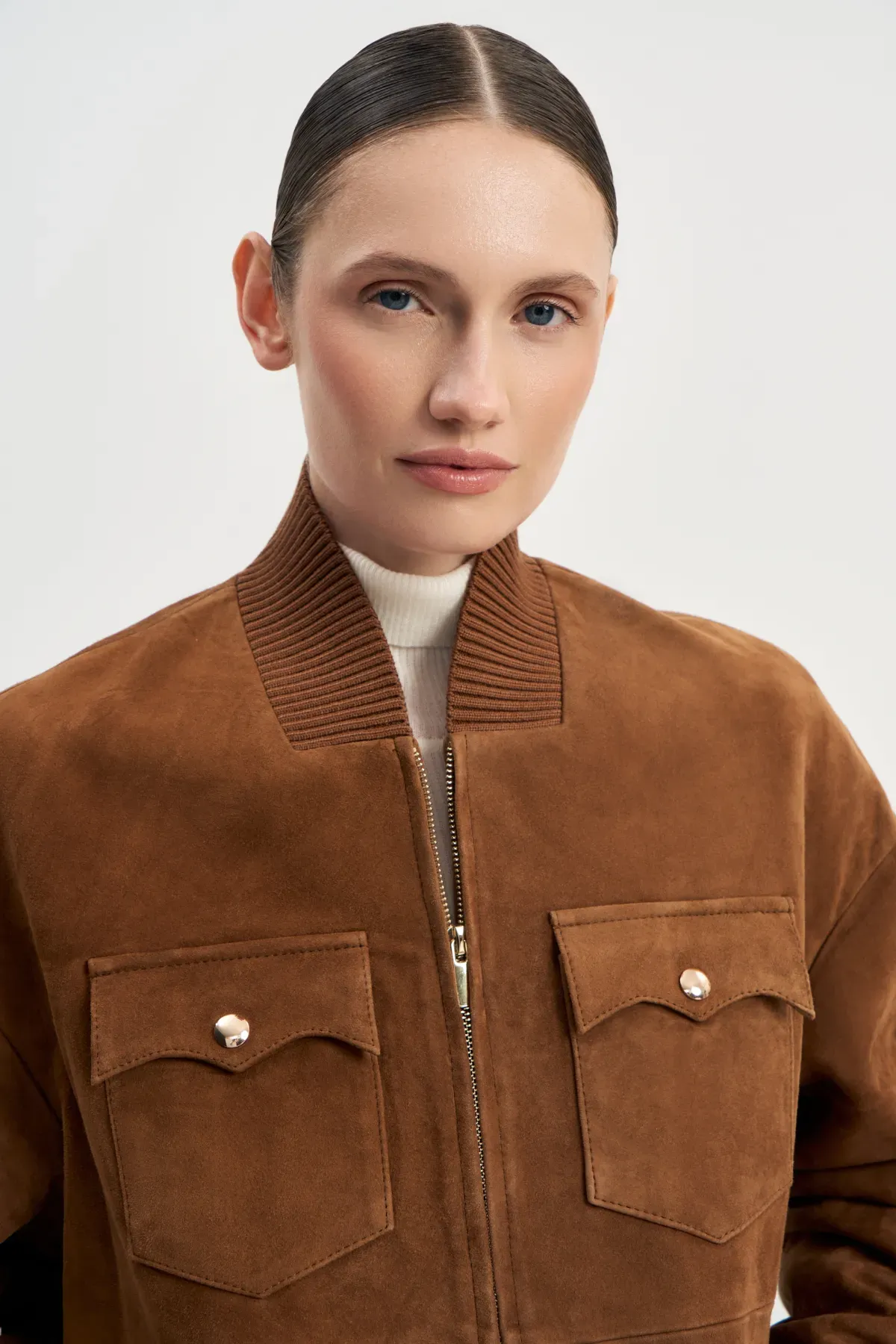 Куртка на молнии из натуральной замши является продолжением английского стиля наших коллекций. Плотная трикотажная резинка на поясе и горловине куртки, сложной формы накладные карманы и шикарная подкладка добавляют куртке элегантности.