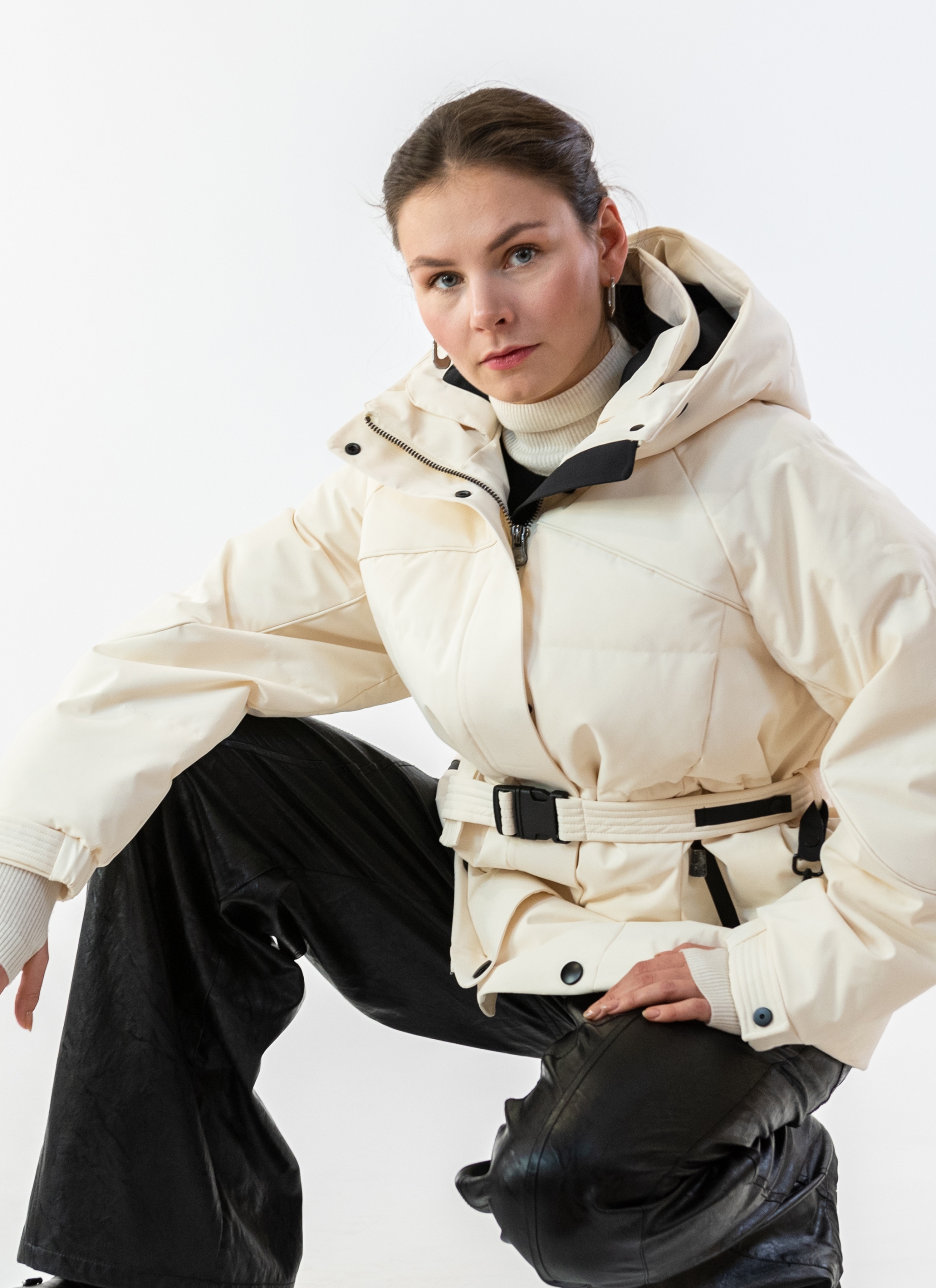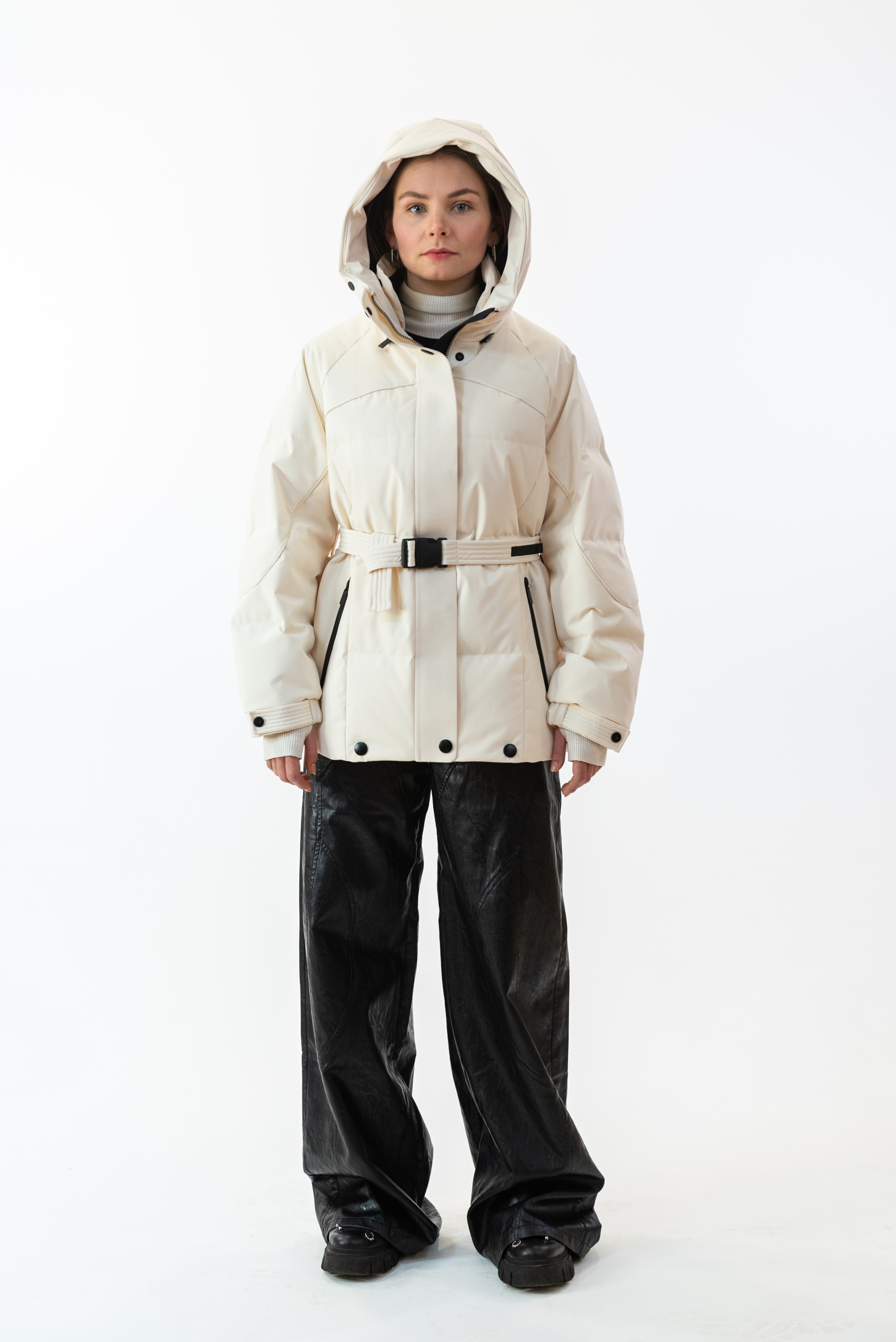 Эта универсальная модель регулируется поясом для создания более женственного образа. В то время как акцентные детали добавляют спортивное настроение: удобный капюшон, чёрные пуговицы-кнопки и перчатки-манжетки.
