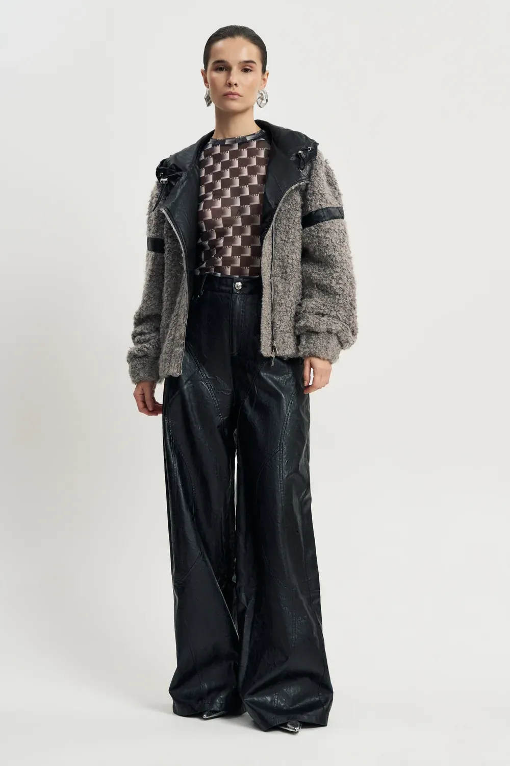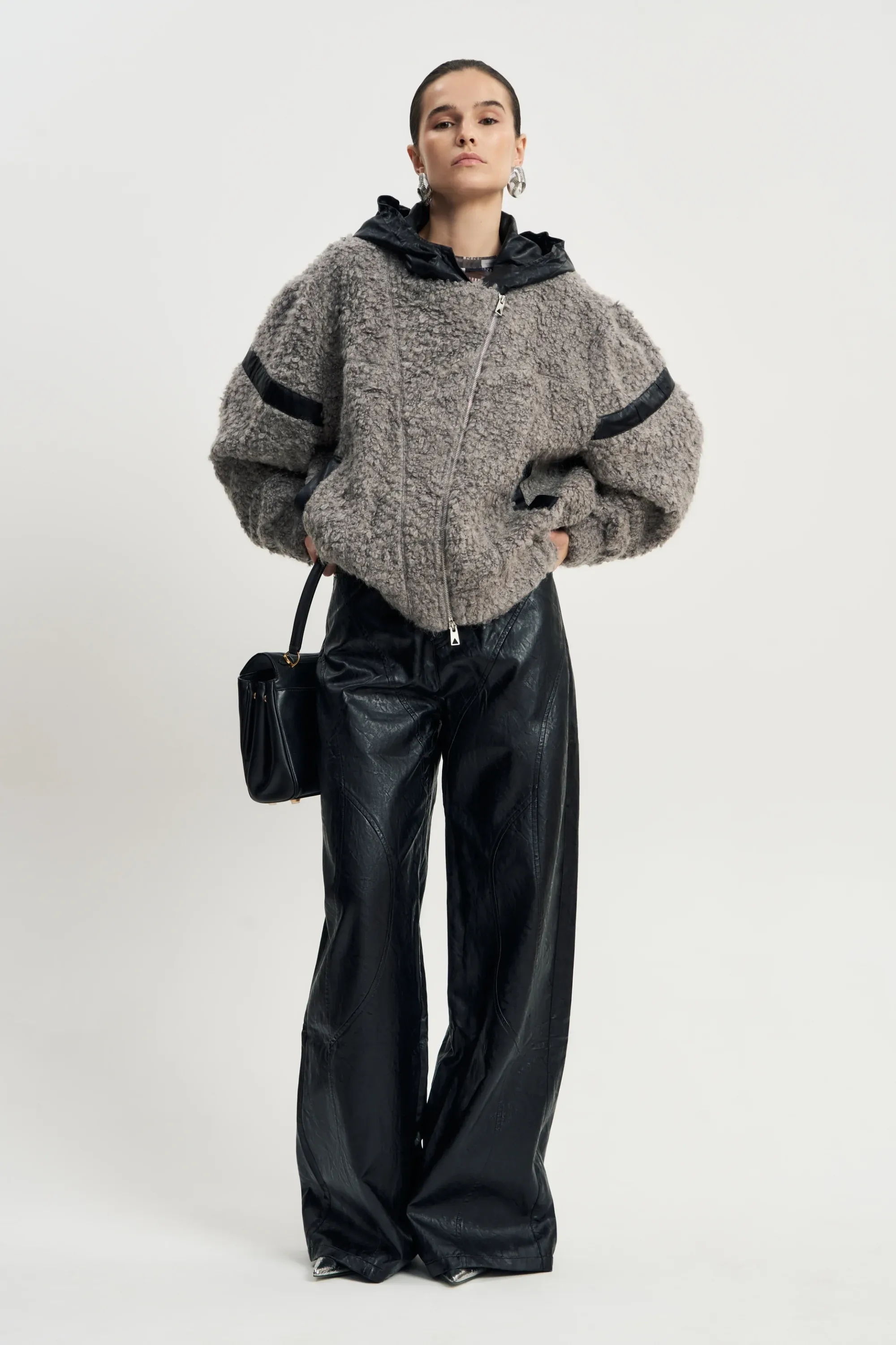 Очаровательная зимняя куртка-бомбер из буклированной шерсти с мохером. Капюшон и декоративные вставки из искусственной кожи предают вещи дерзкий и смелый акцент.