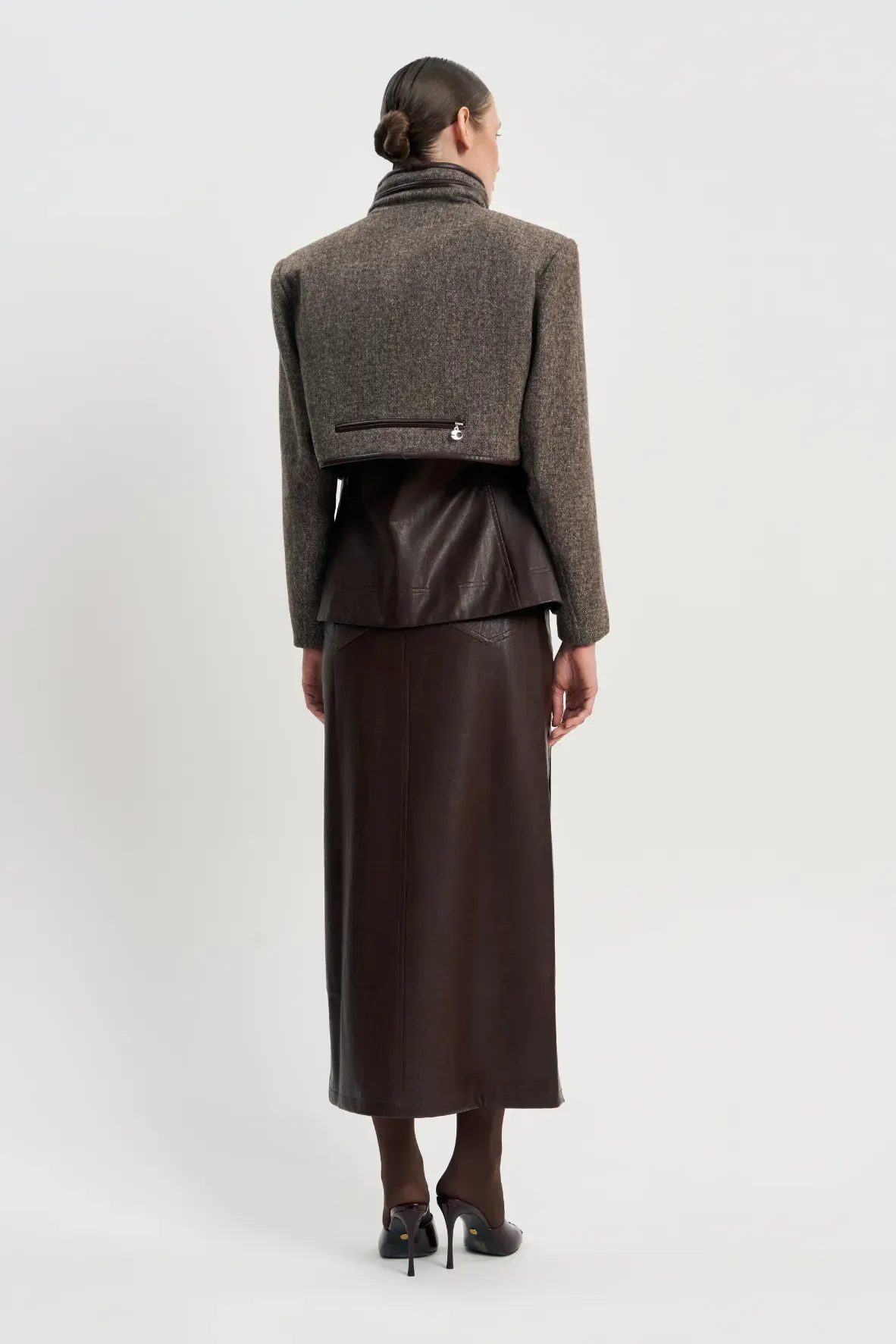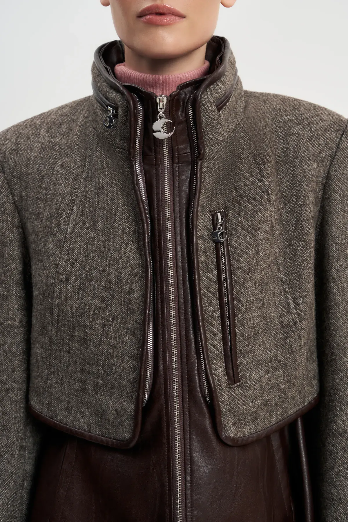 Эта оригинальная двухслойная куртка сочетает в себе строгие линии и продуманный силуэт. Нижний слой — приталенный жилет из мягкой коричневой кожи с высоким воротником, капюшоном и декоративными швами. Он плотно облегает фигуру, подчёркивая форму и создавая выразительный силуэт.
