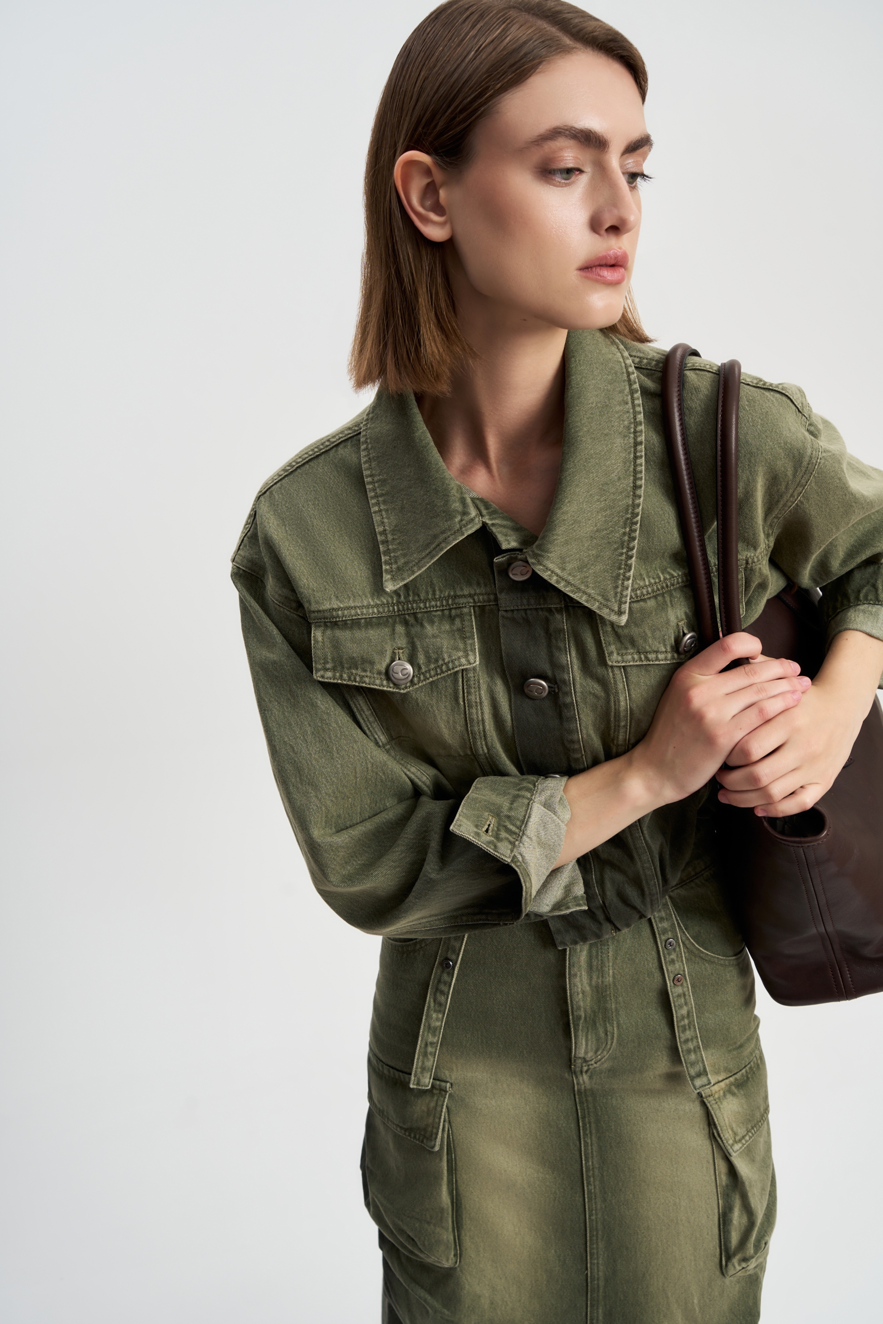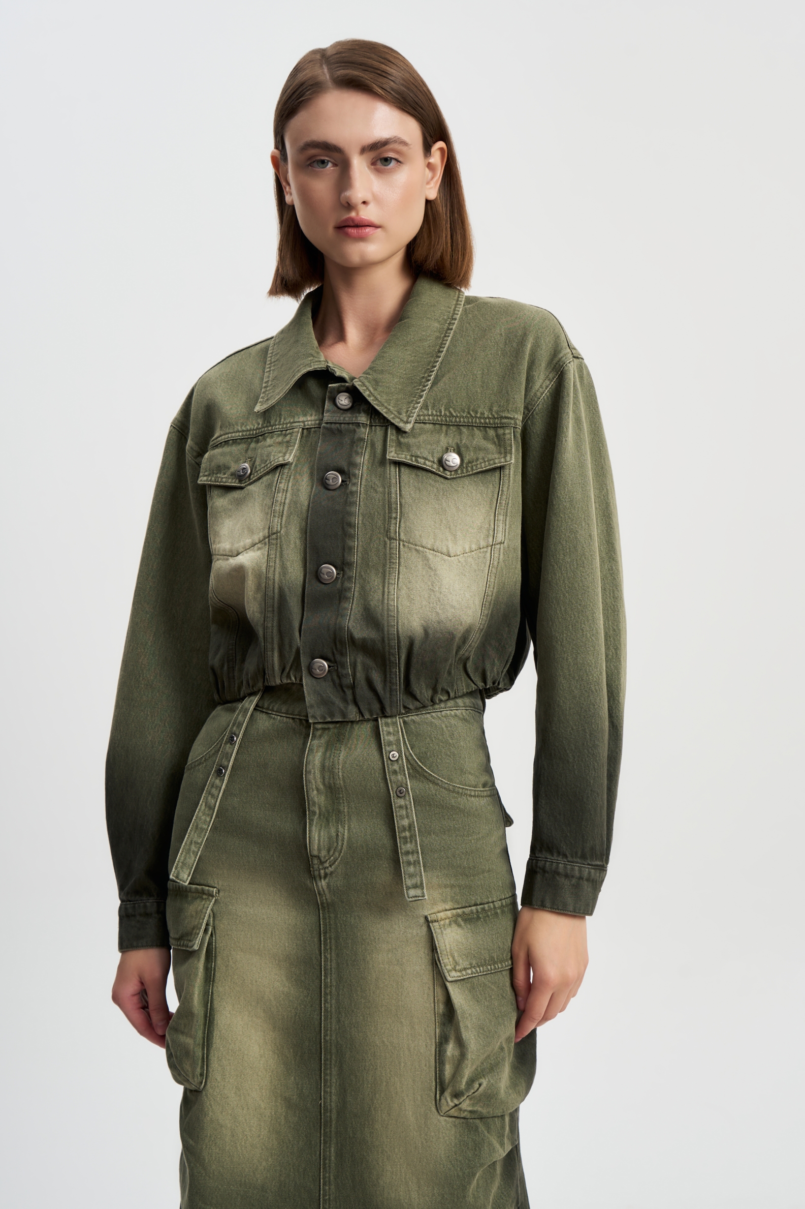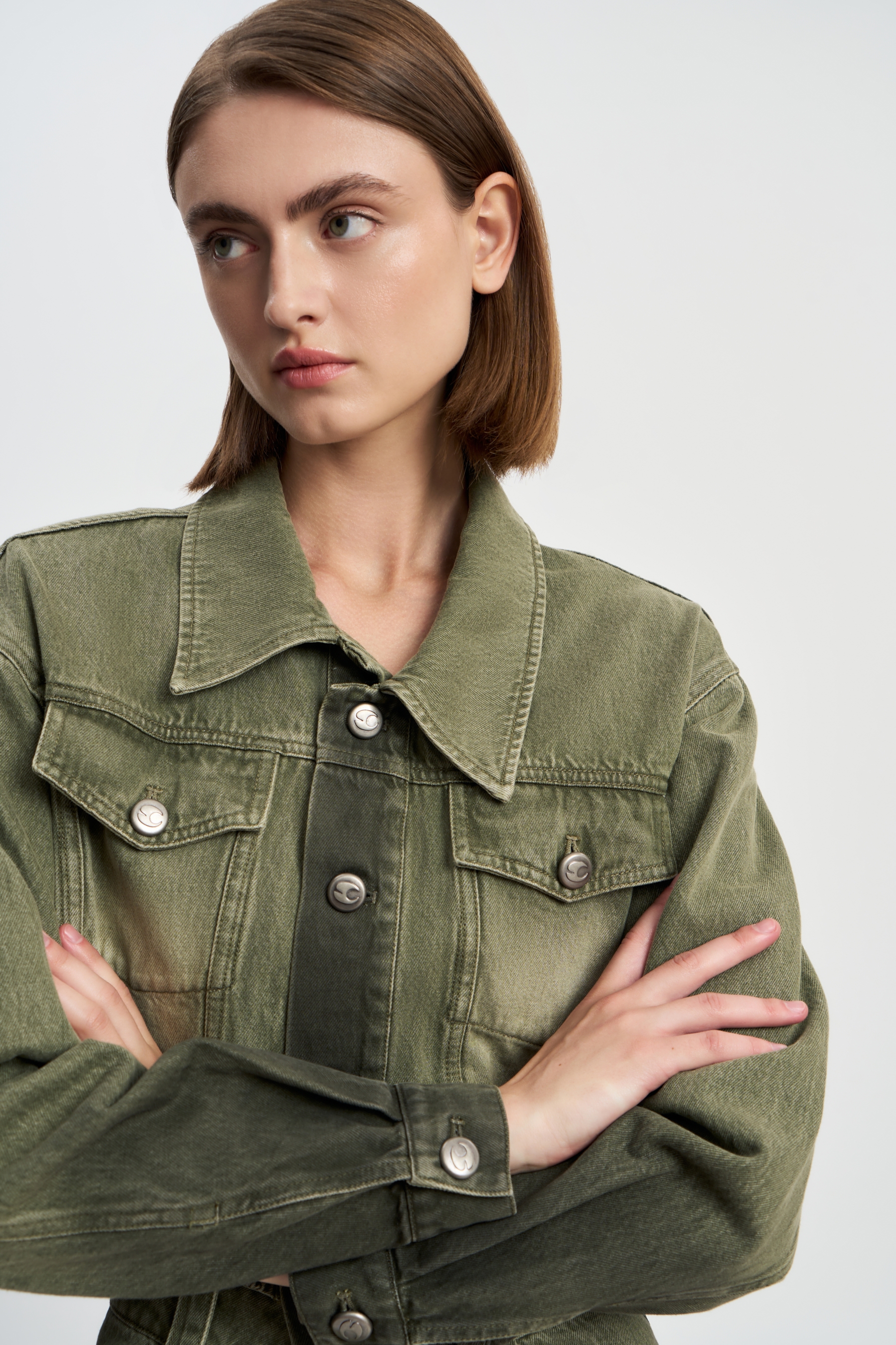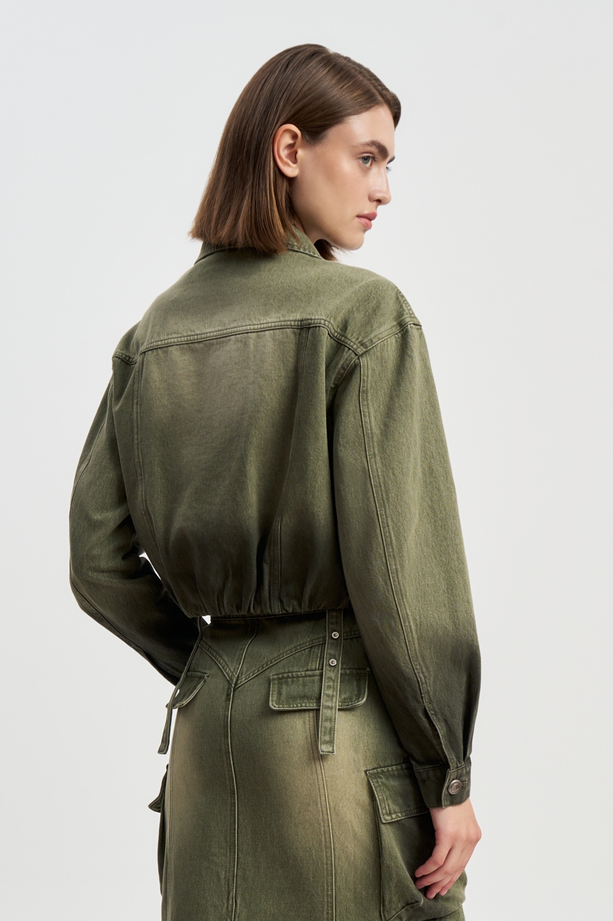 Куртка из джинсы темно-зеленого цвета с асимметричной застежкой, имитирующей как бы небрежное неправильное застегивание. Ткань в районе накладных карманов высветлена.