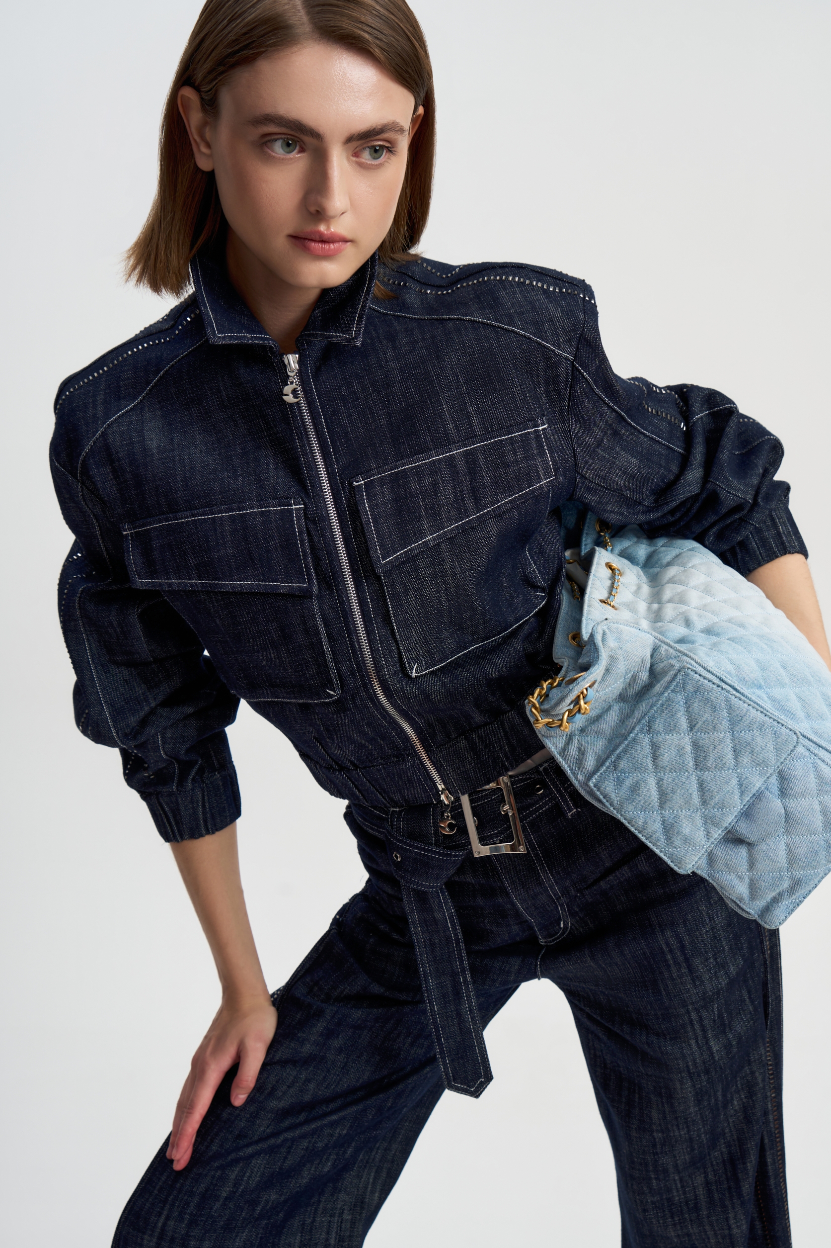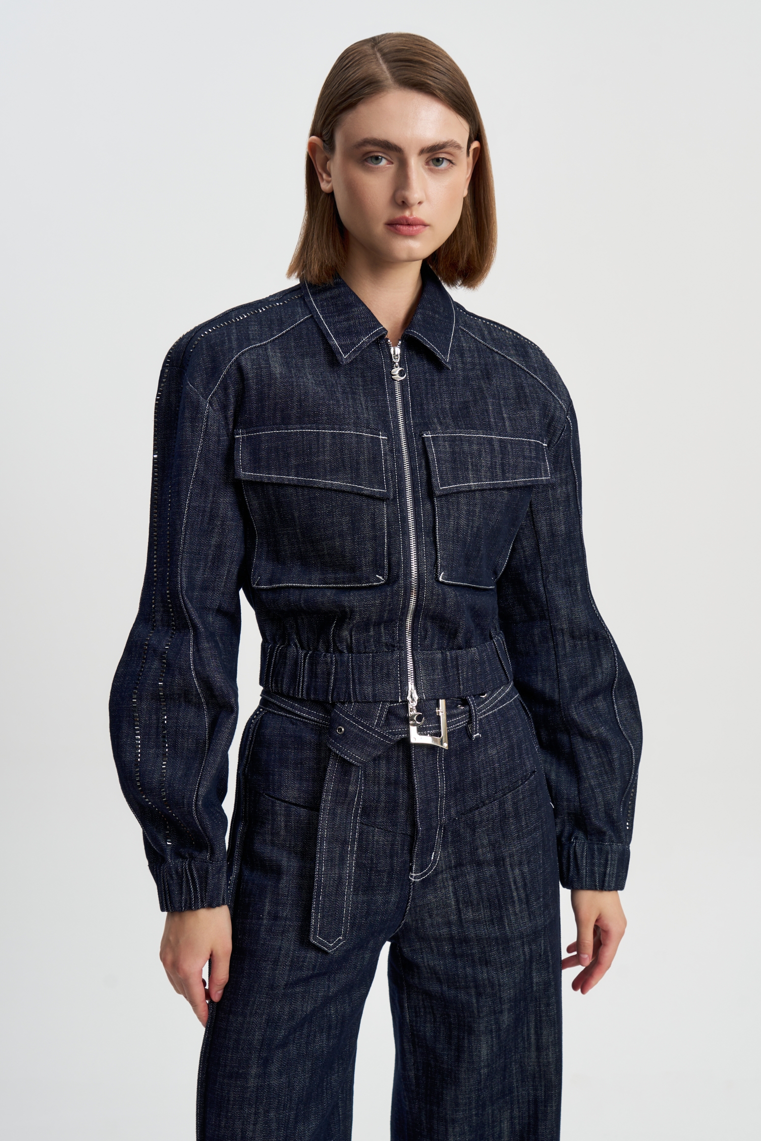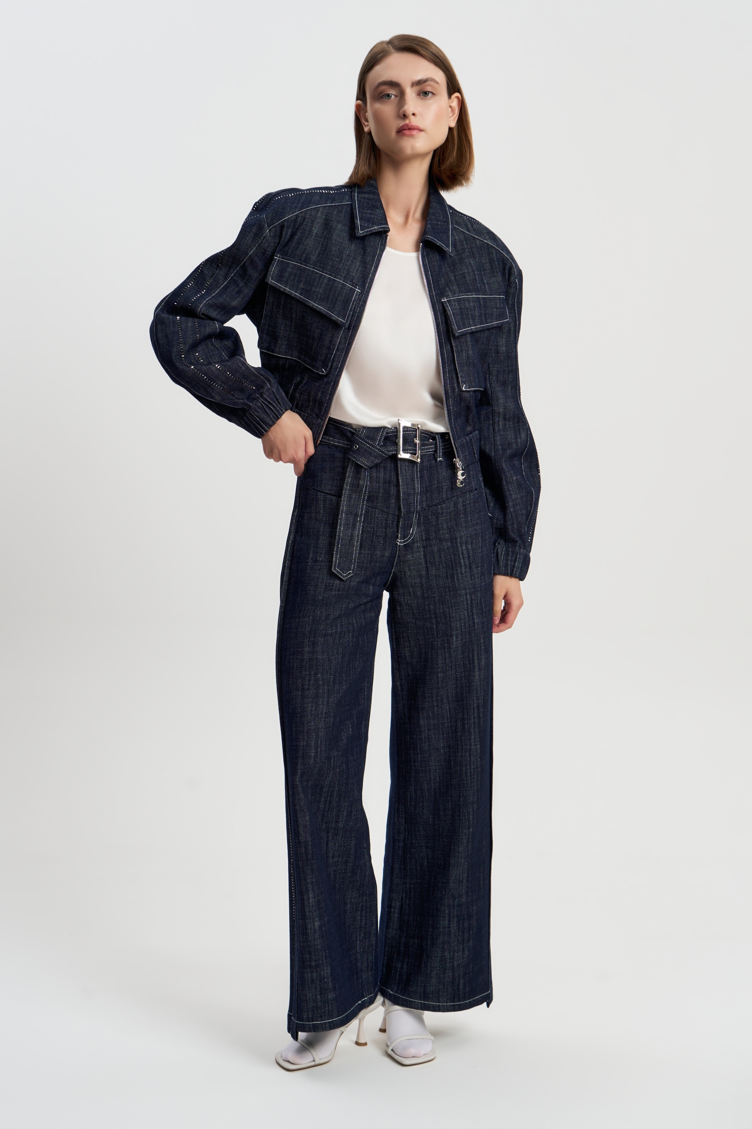 Куртка из джинсы глубокого синего цвета с необычным присборенным по длине рукавом, образующим напуск над манжетой, и накладными карманами на груди. Куртка украшена белой отстрочкой впереди и на спине и по длине рукава блестящими синими лампасами. С брюками Строчки составляет элегантный джинсовый костюм.