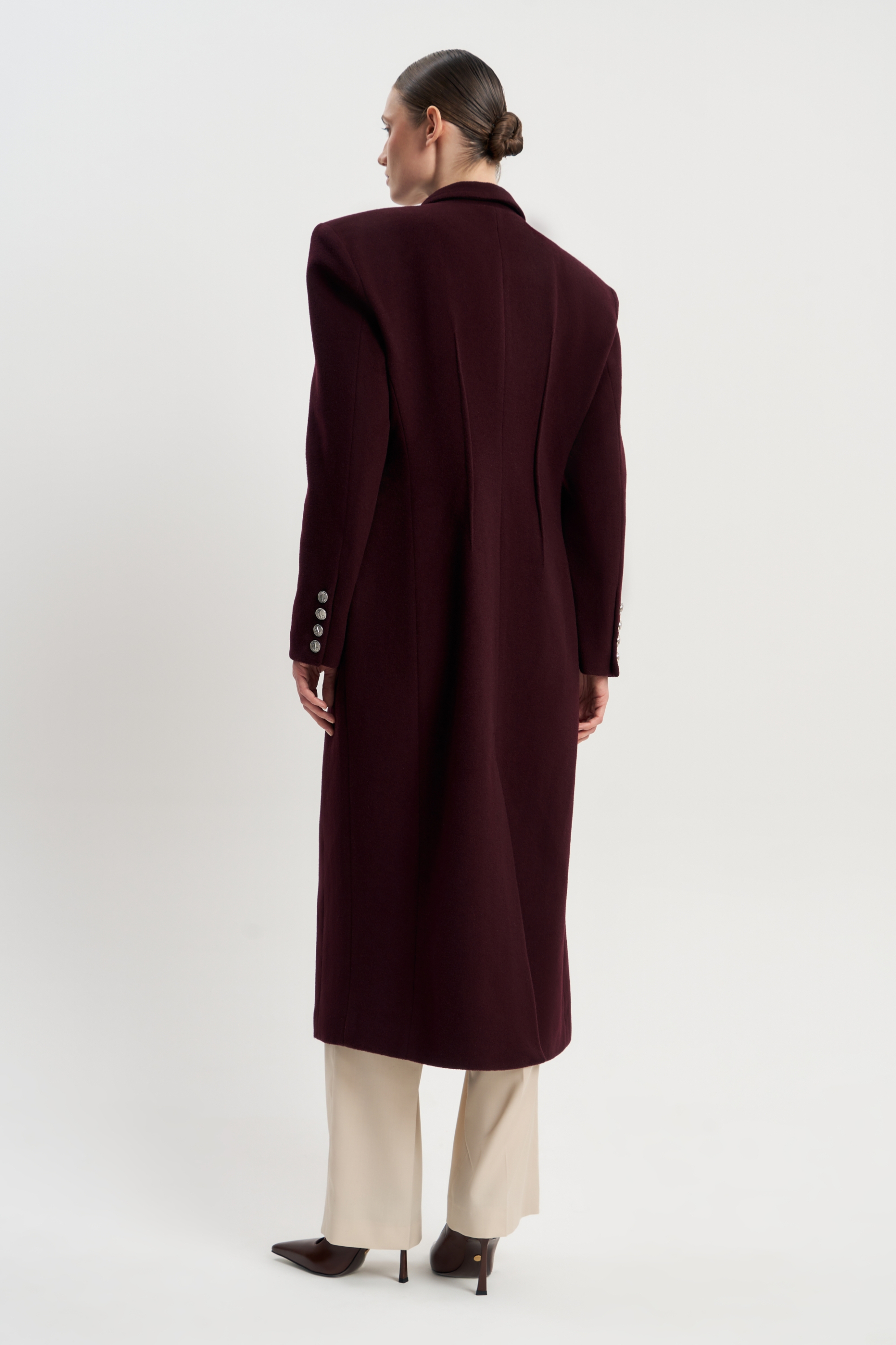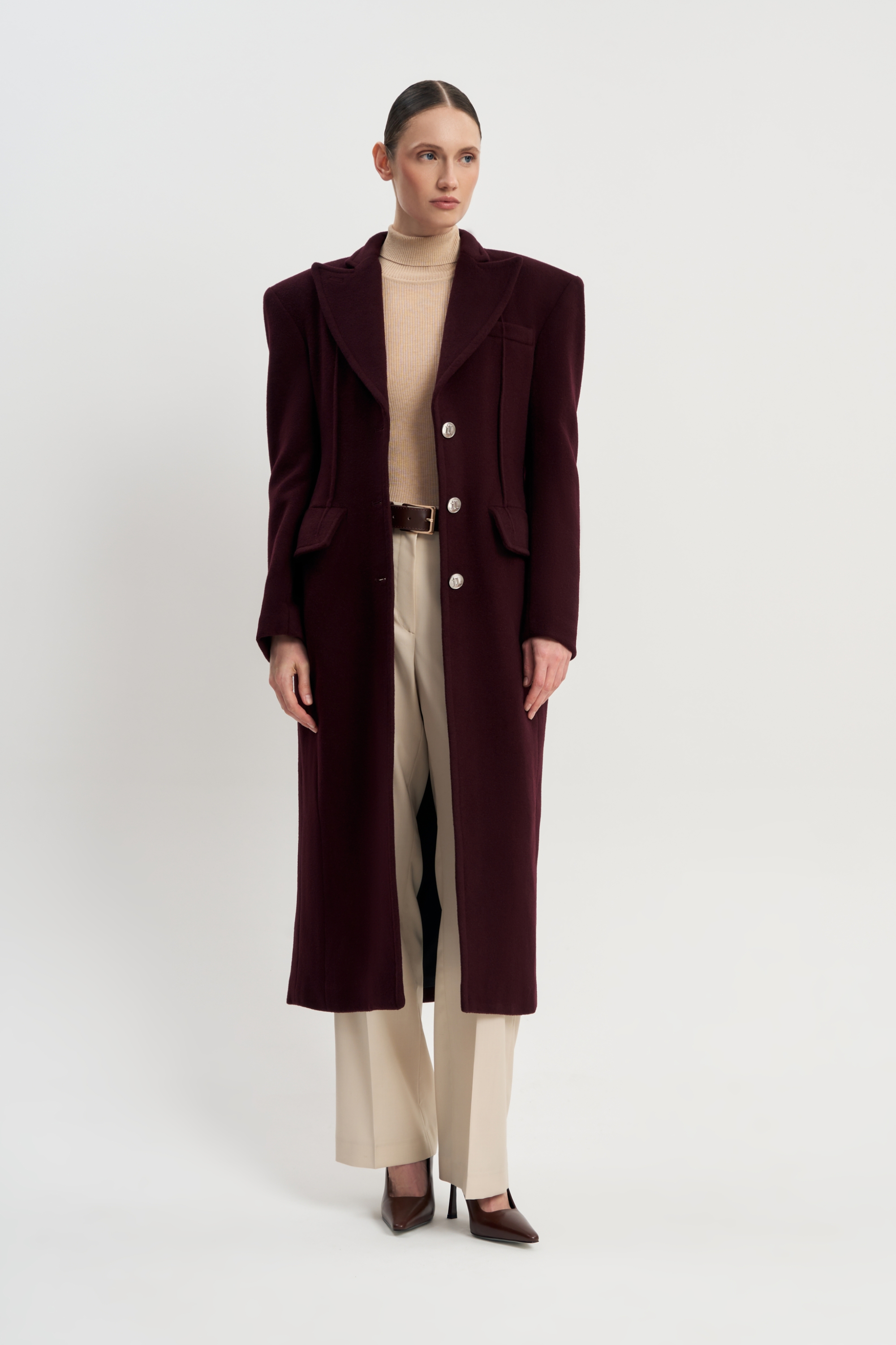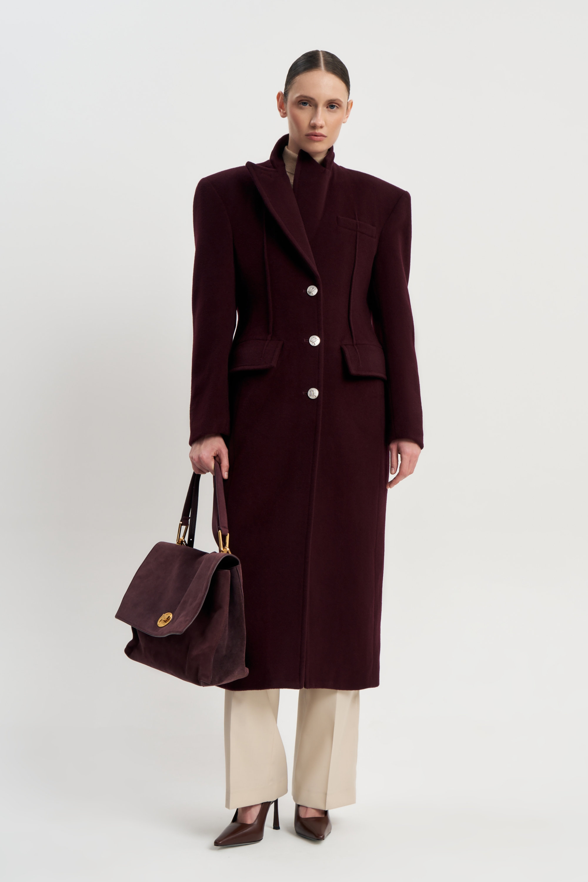 Элегантное бордовое пальто с приталенным кроем и широкими плечами, оно отсылает нас к стилю Викторианской эпохи, вновь вошедшему в моду этой осенью. Вдохновленное классическими силуэтами, пальто сочетает в себе утонченную строгость и современные акценты: яркие пуговицы, крупные карманы и воротник.