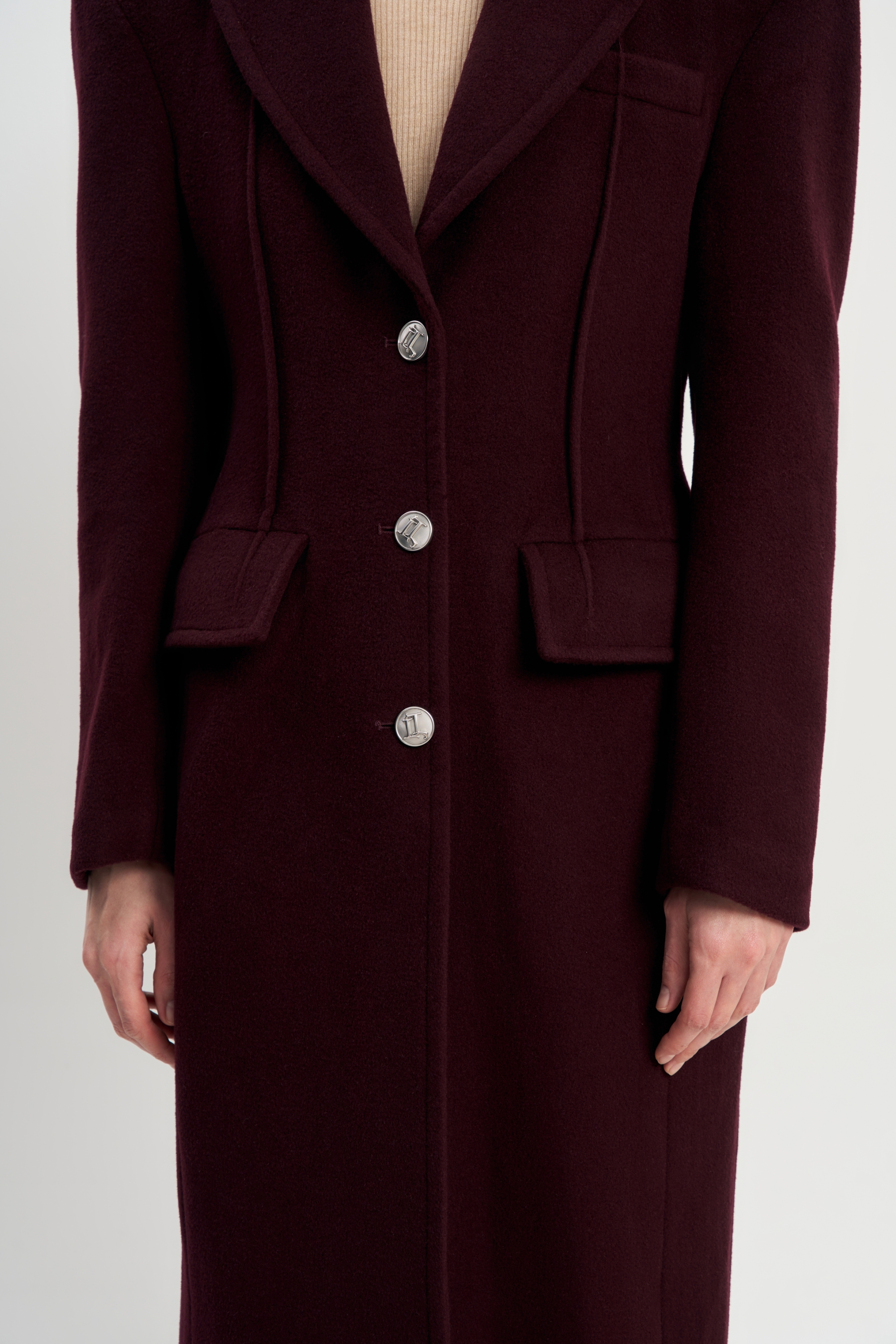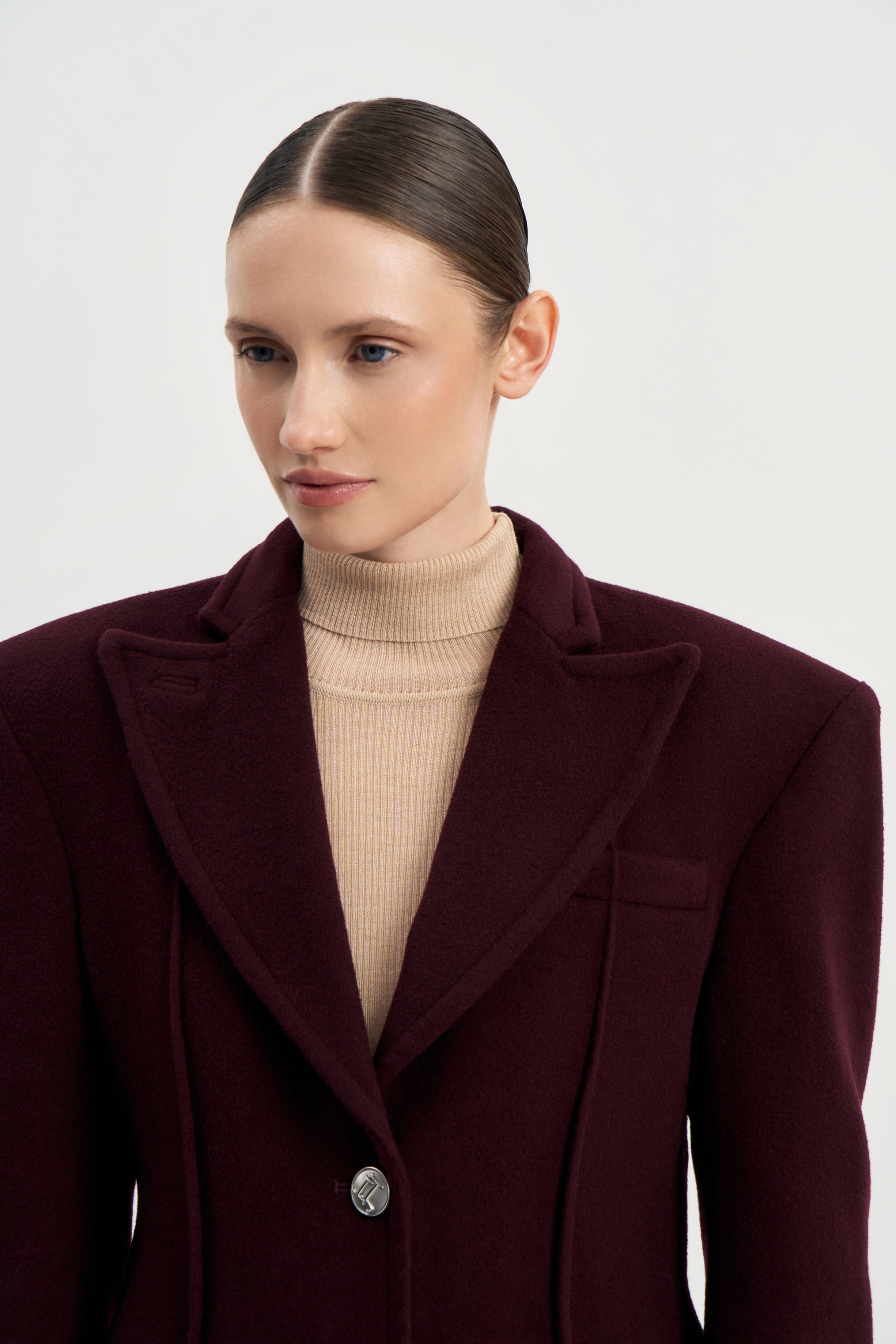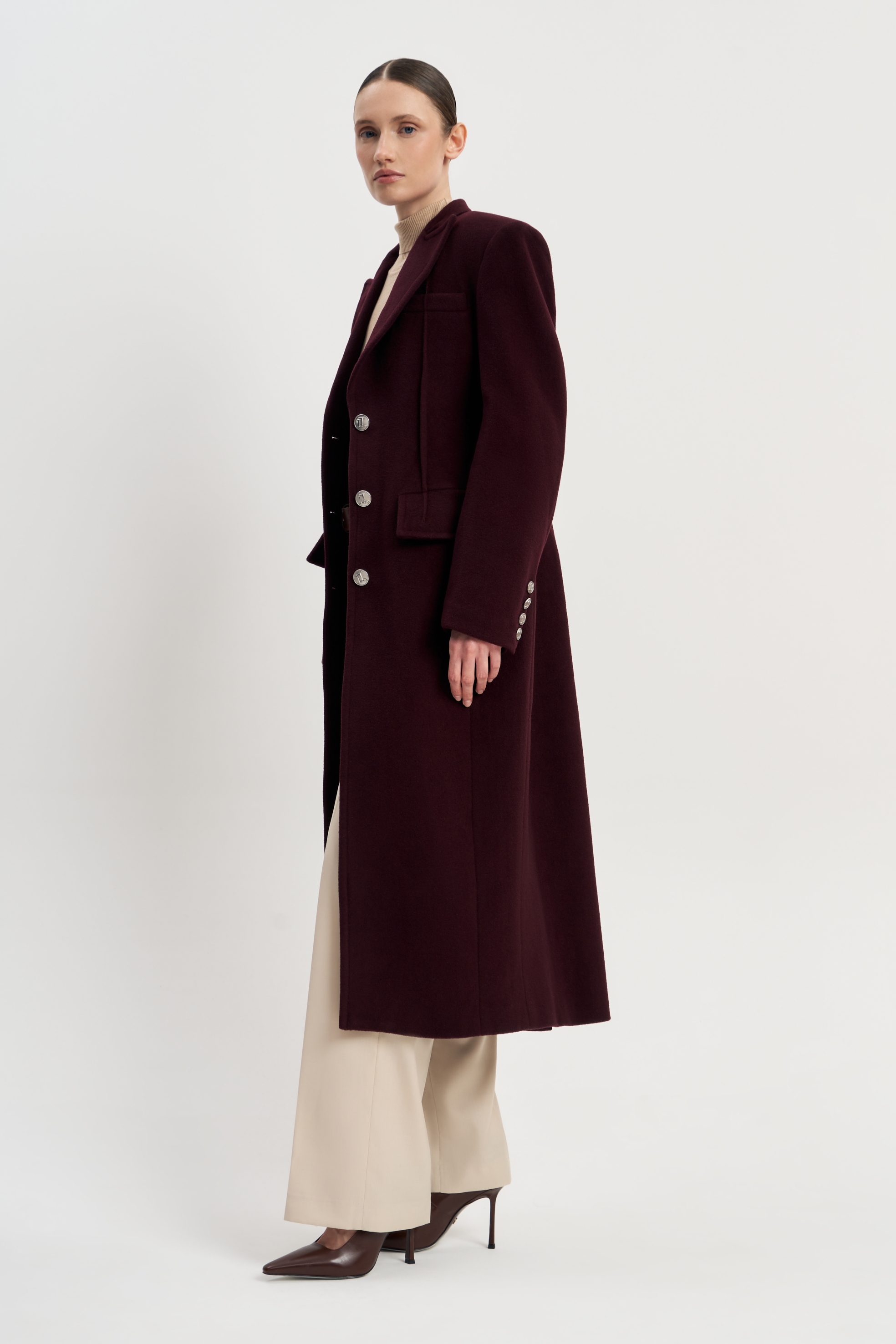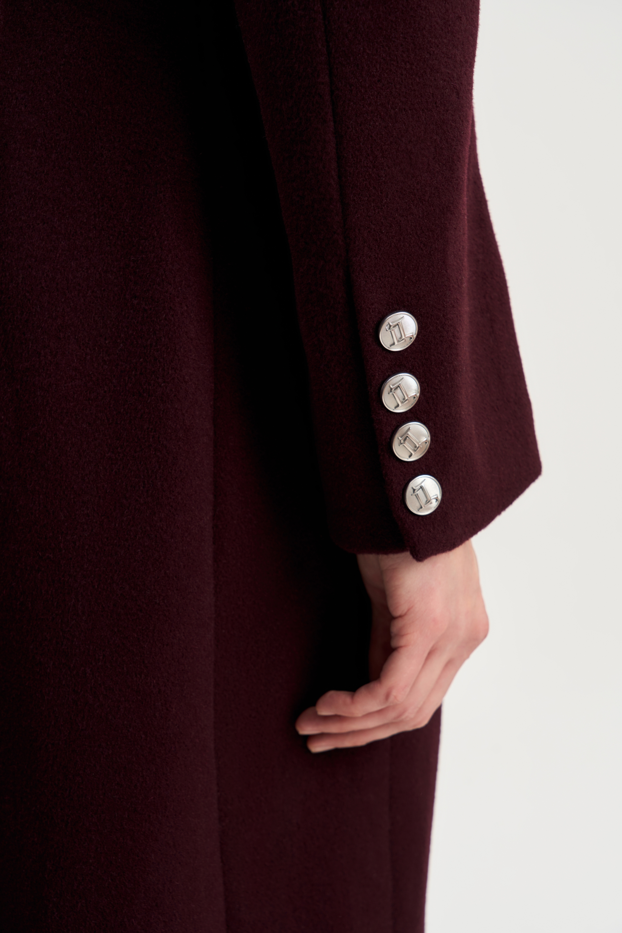 Элегантное бордовое пальто с приталенным кроем и широкими плечами, оно отсылает нас к стилю Викторианской эпохи, вновь вошедшему в моду этой осенью. Вдохновленное классическими силуэтами, пальто сочетает в себе утонченную строгость и современные акценты: яркие пуговицы, крупные карманы и воротник.