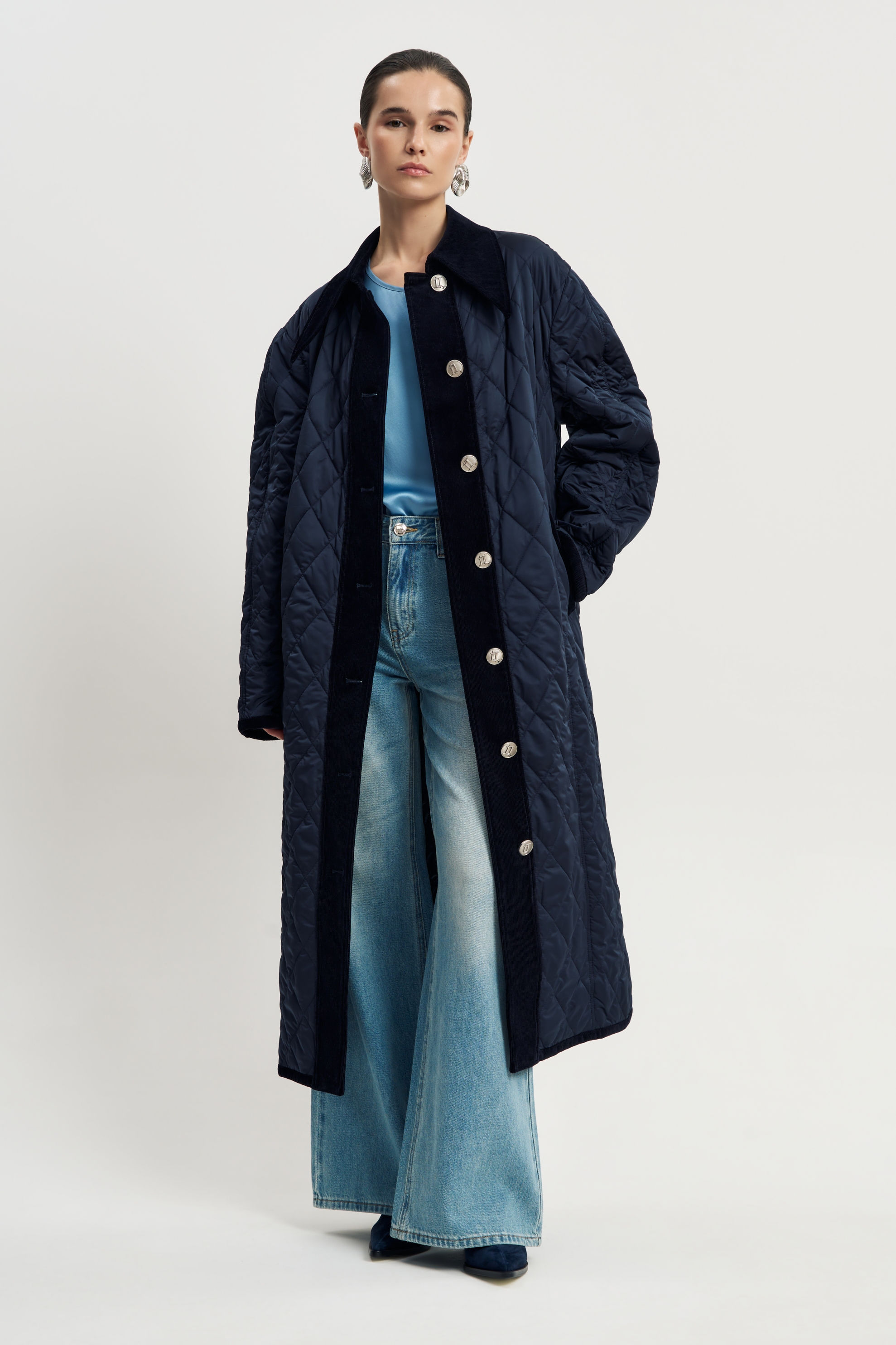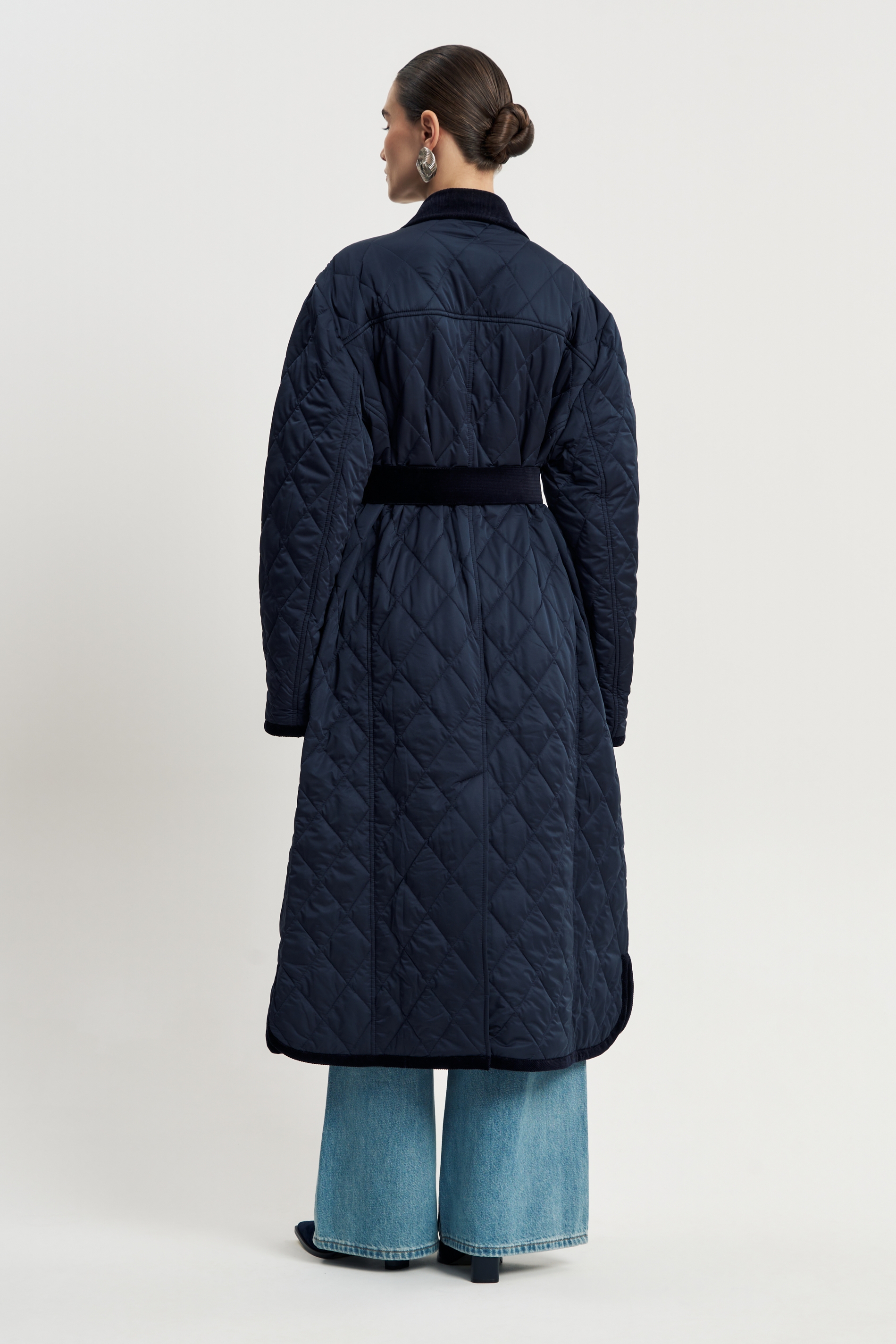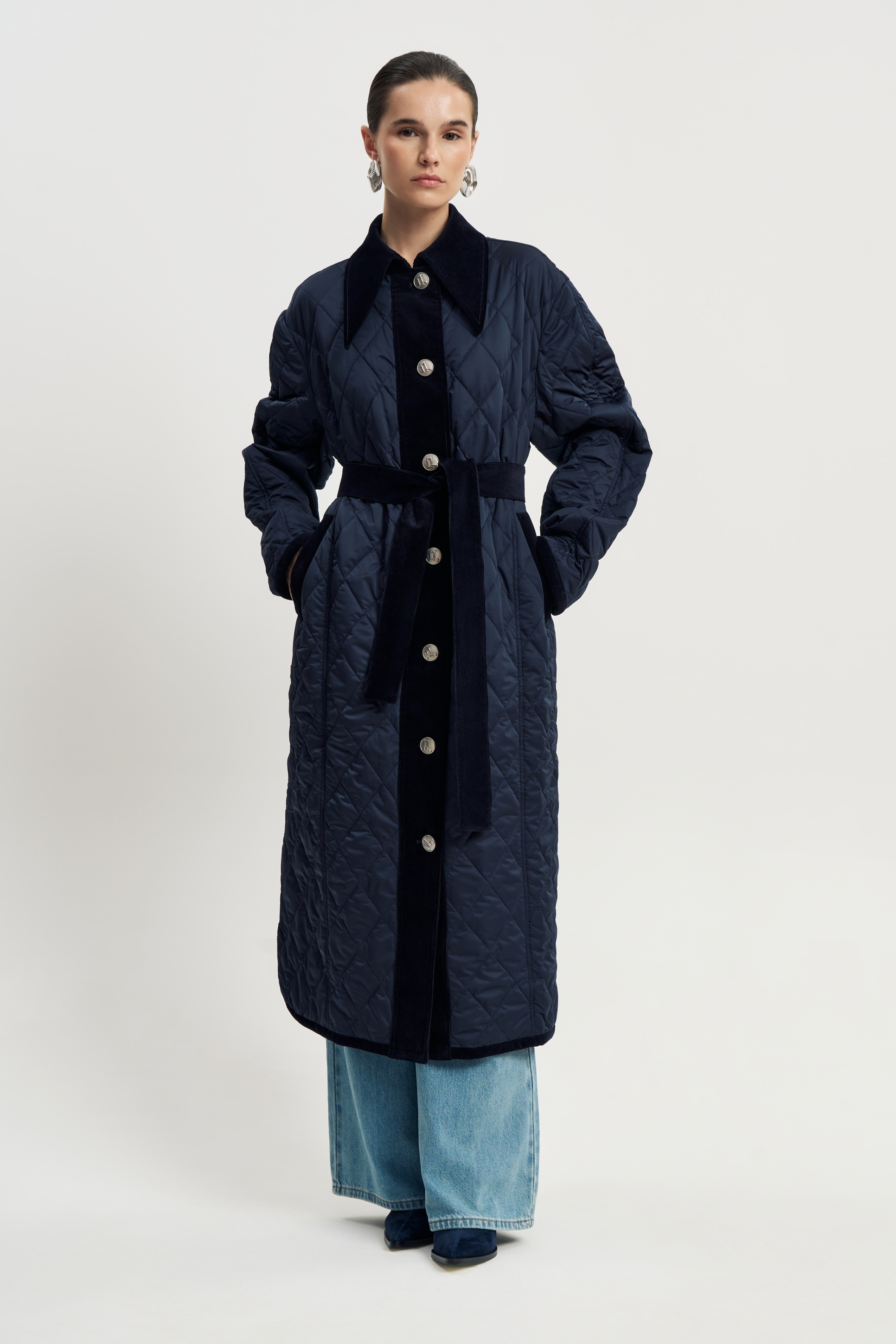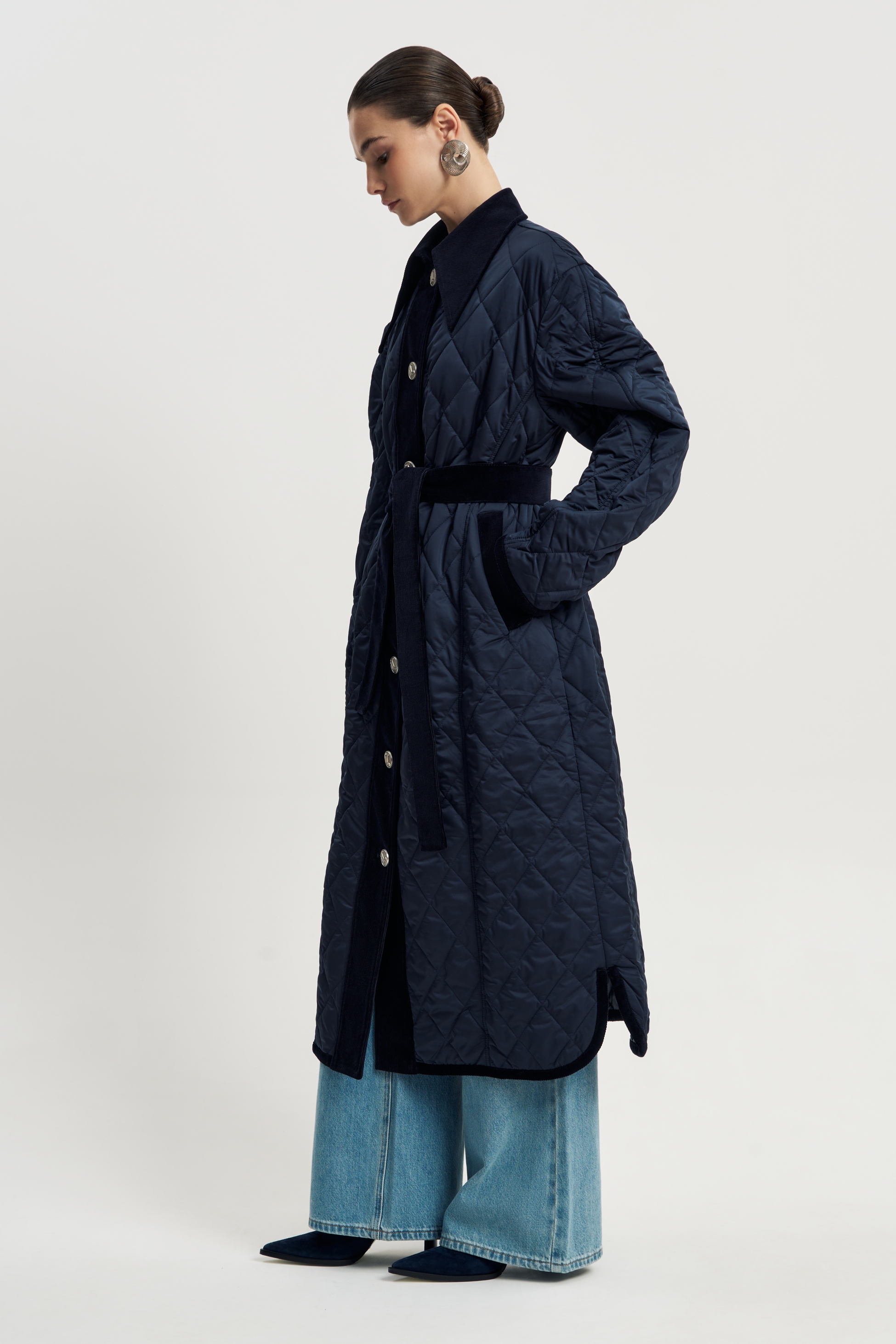Стеганое пальто на тонком утеплителе, темно-синего цвета. Свободный крой и крупные кнопки создают настроения уюта, а вельветовый пояс подчеркивает линию талии и добавляет неожиланный изящный акцент. Остроконечный воротник и карманы также отделаны вельветом, что отвечает общему стилю.