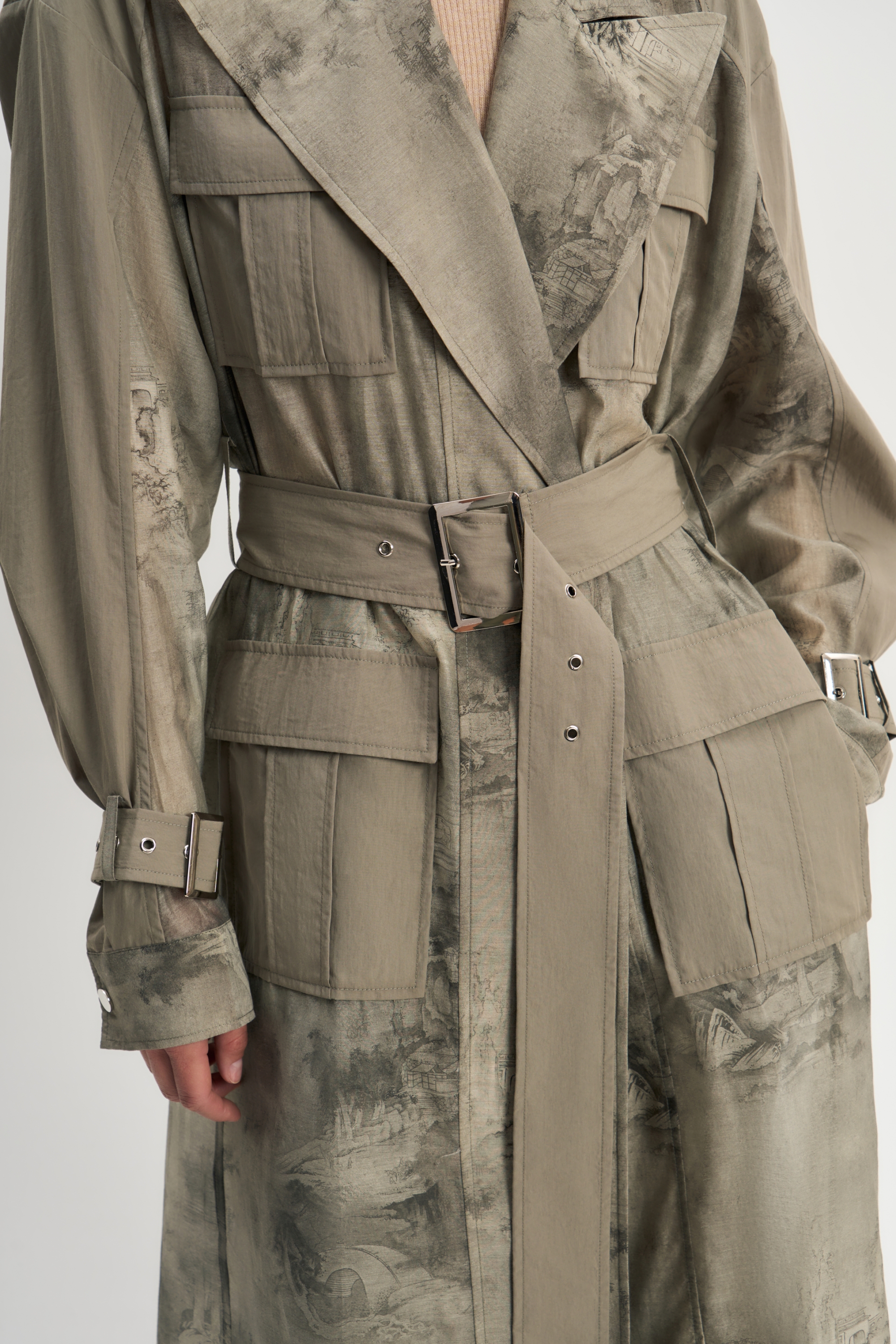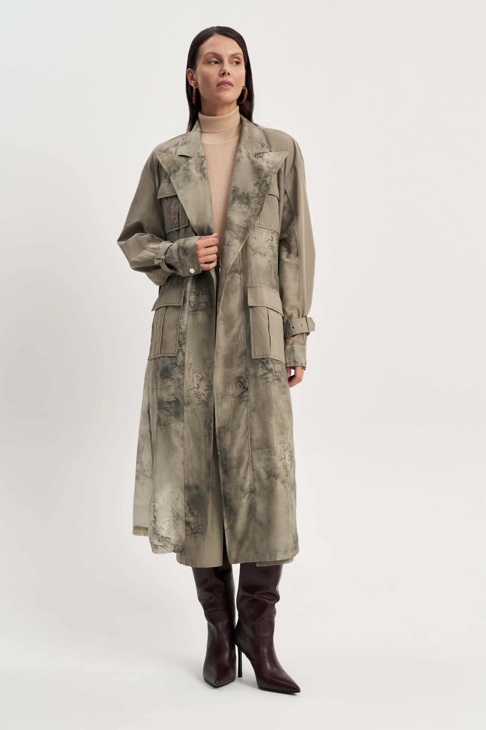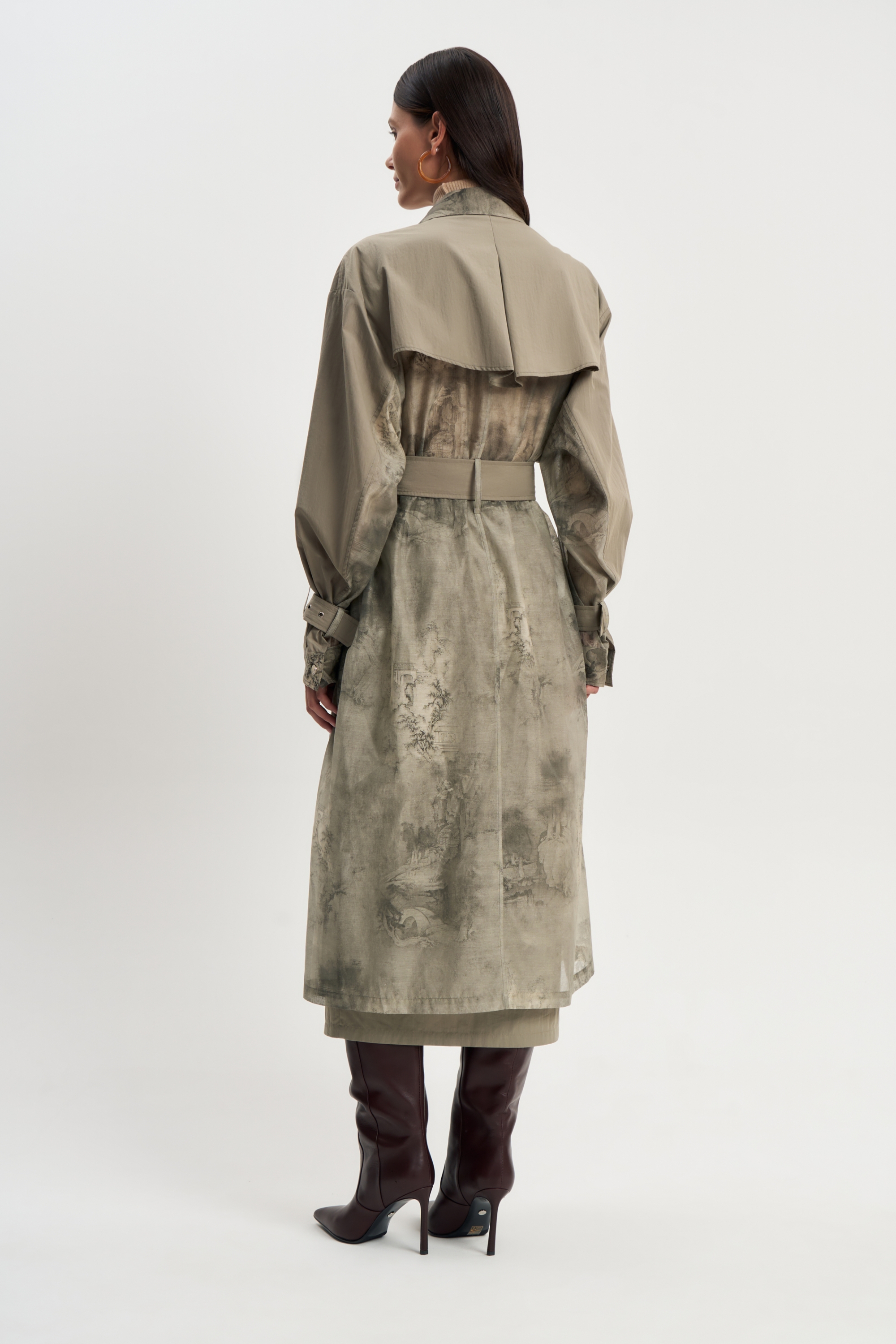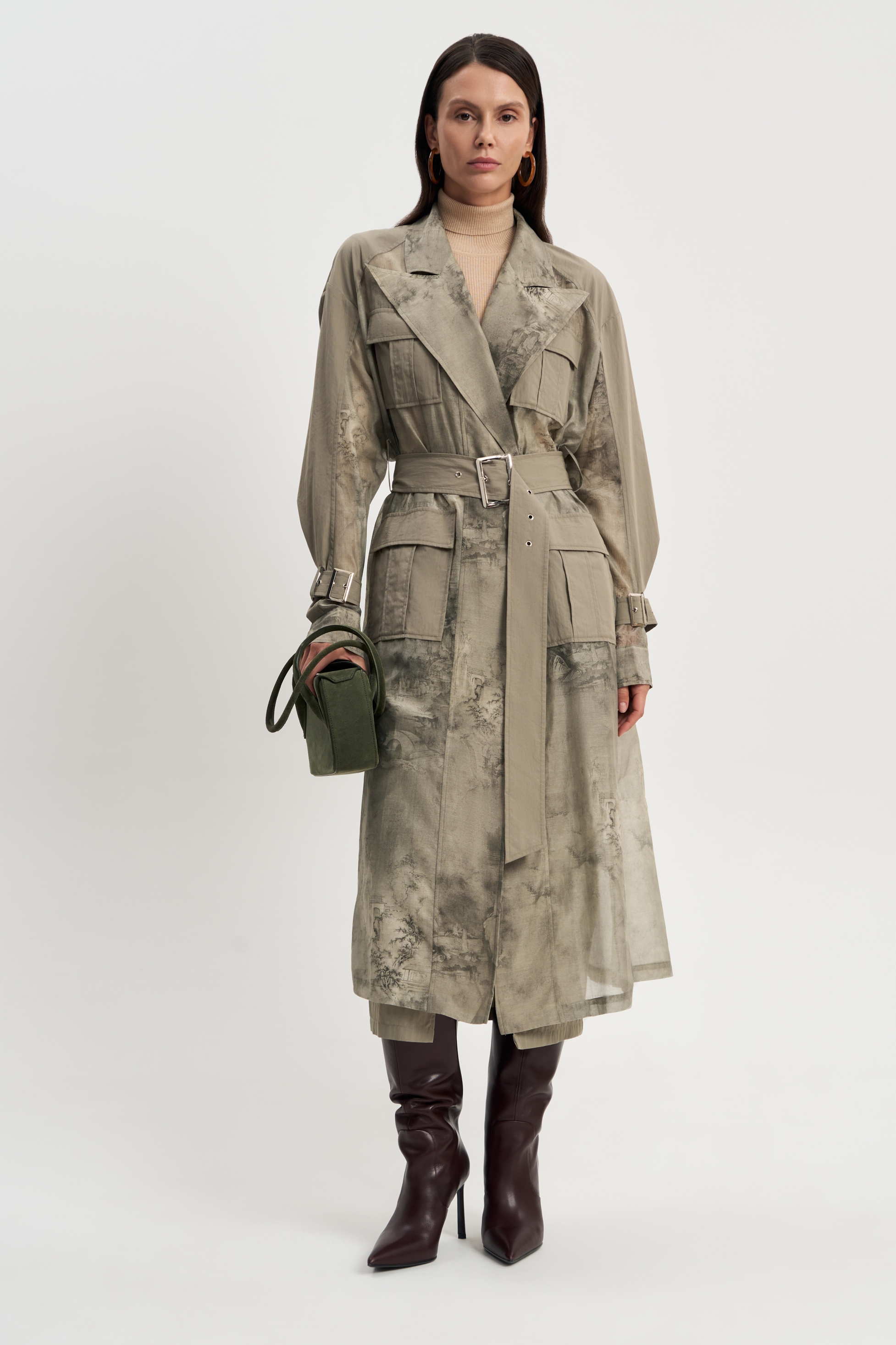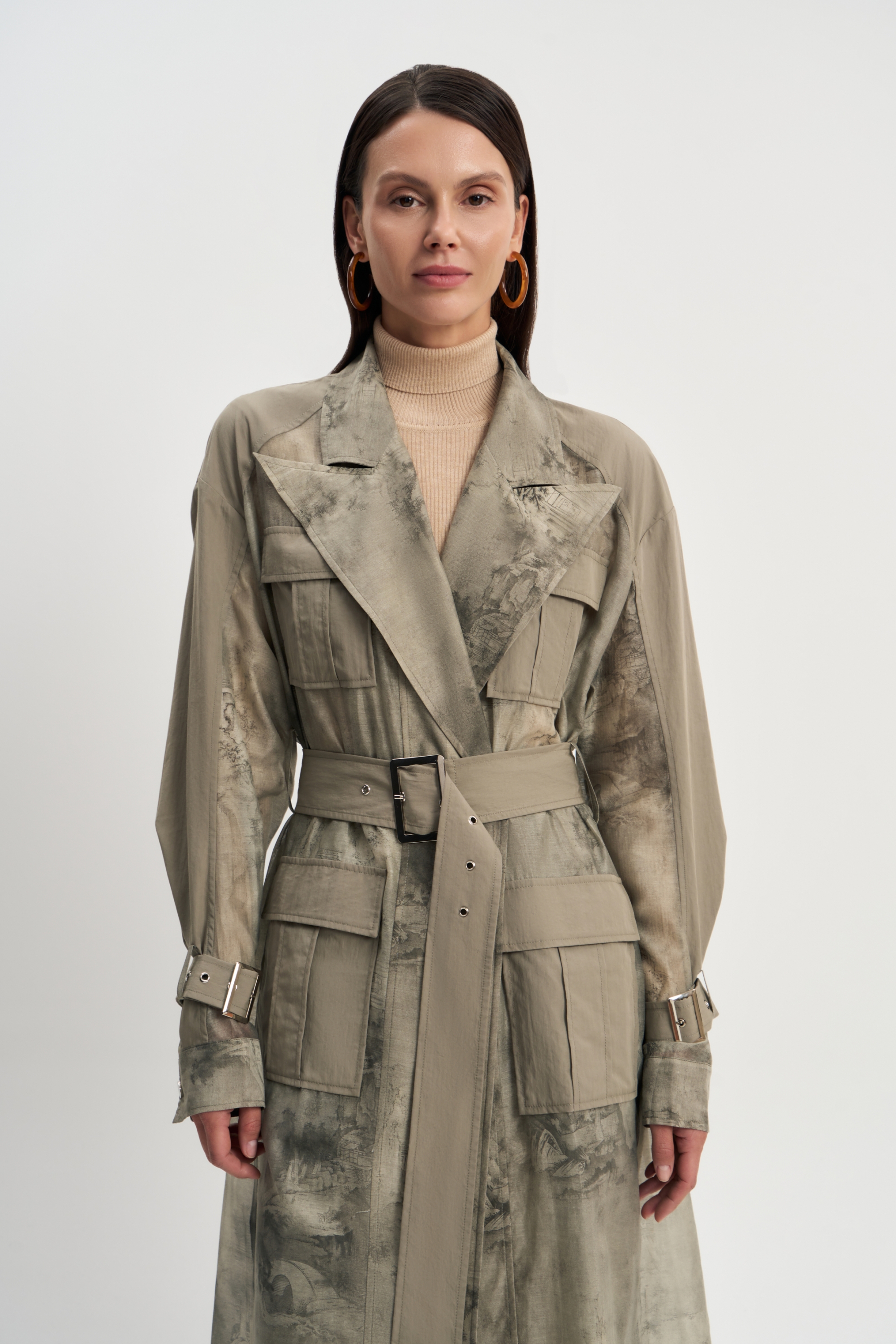 Лёгкий плащ длиной ниже колена, выполнен из хлопка и вискозы. Контраст плотных геометрических вставок и полупрозрачной ткани создаёт загадочный образ. Нежный рисунок напоминает разводы туши. Пояс на талии, ремешки и на рукавах, карманы на груди и бёдрах - придают упорядоченности в романтичный образ.