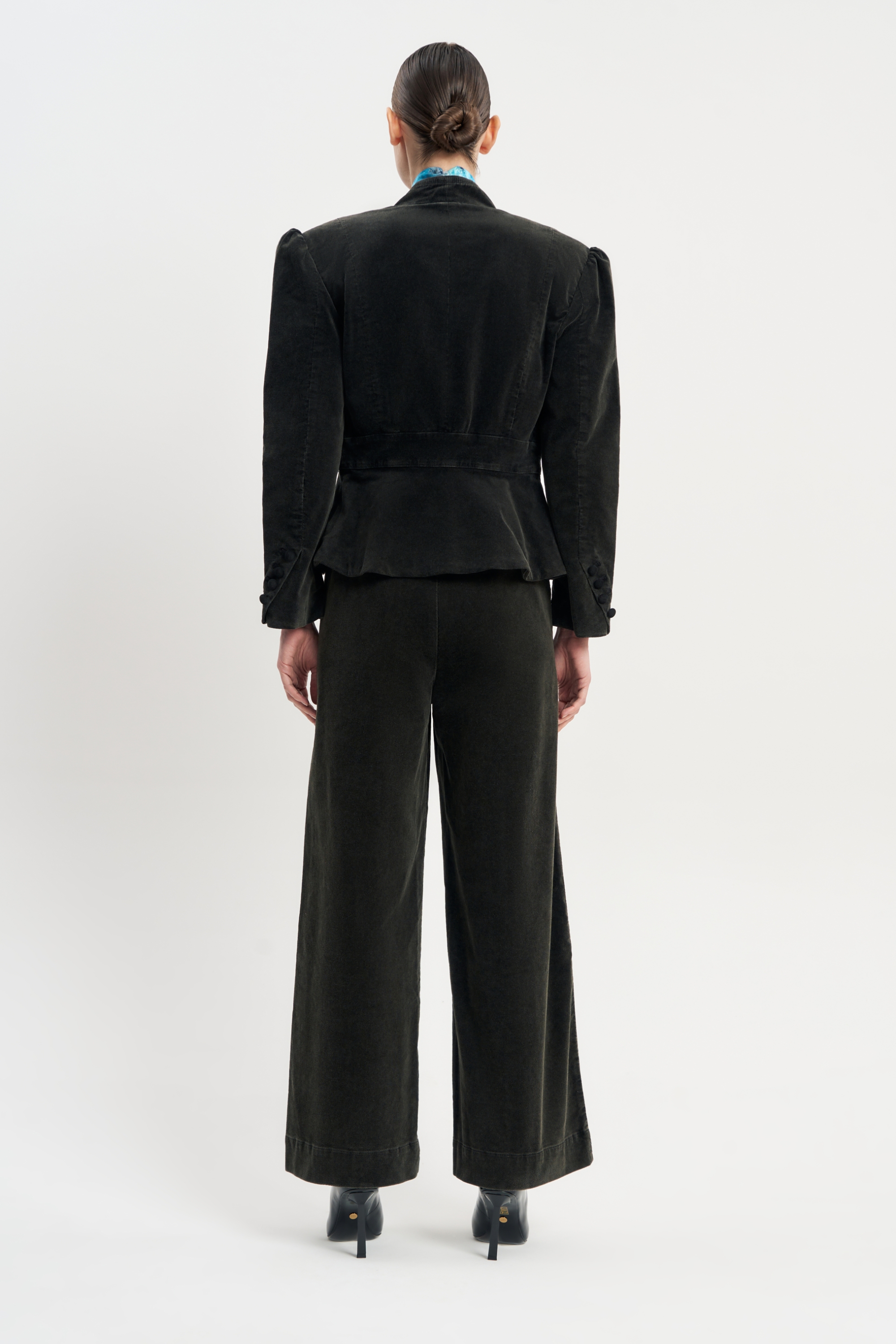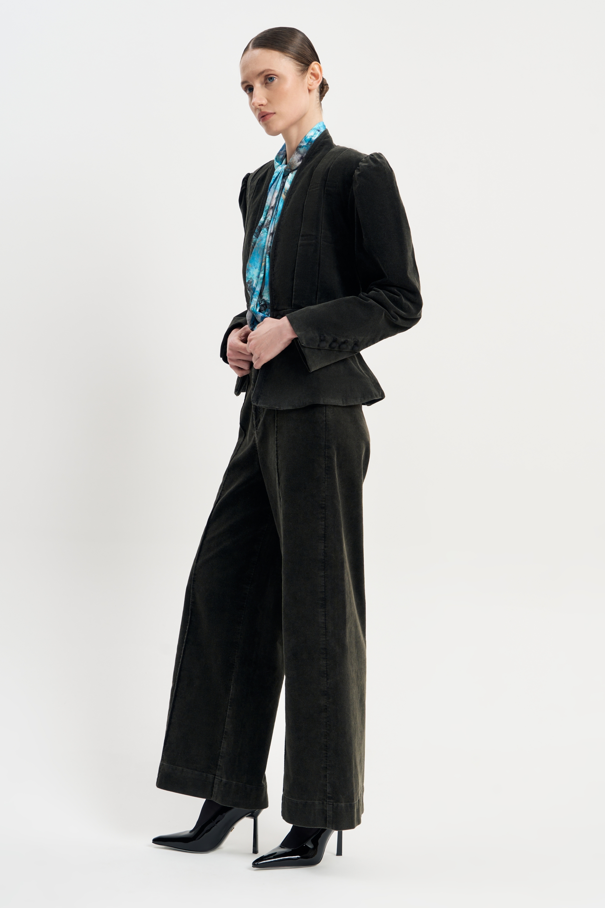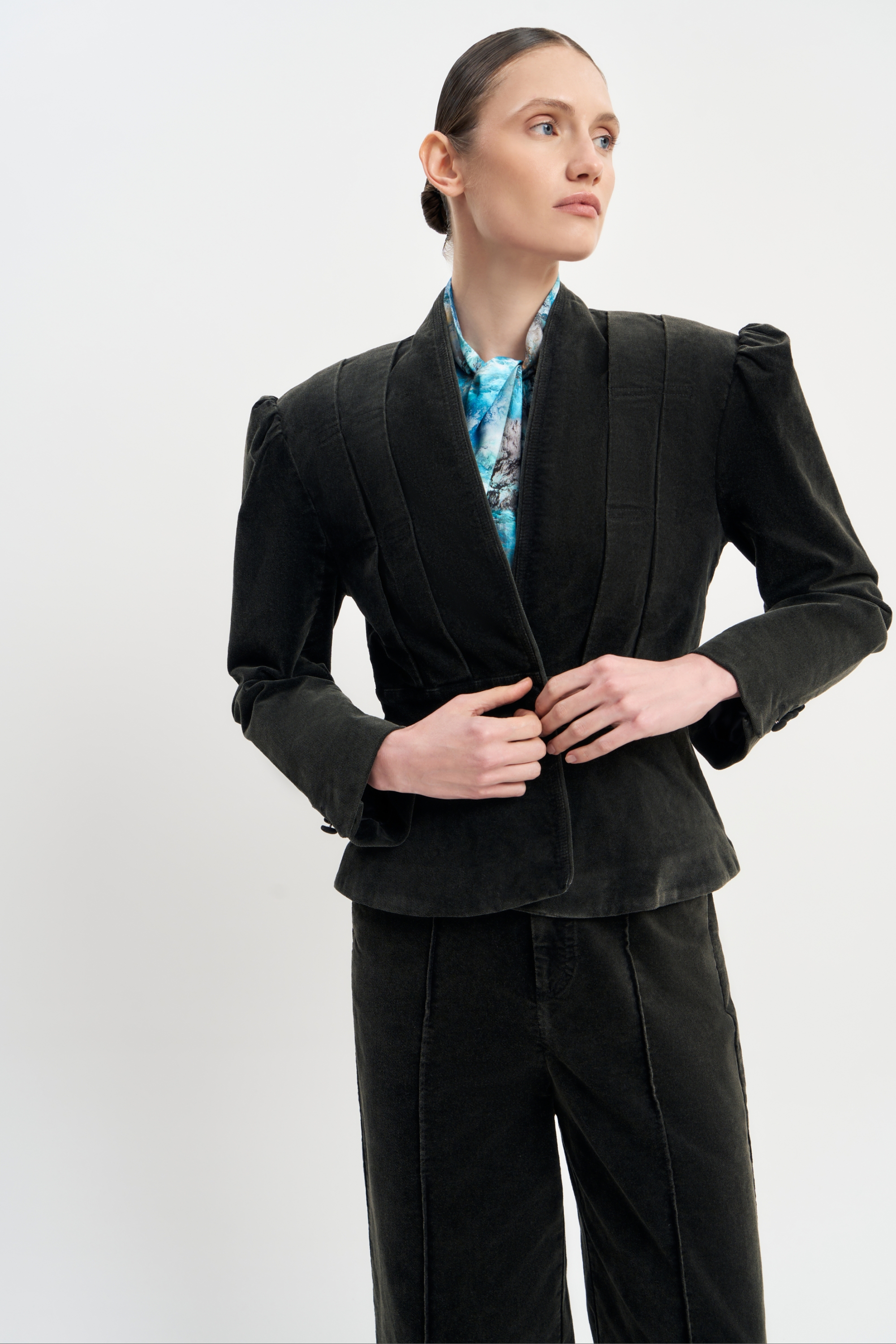 Необычная текстура ткани, бархат на джинсовой хлопковой основе, не только делает жакет шикарным и запоминающимся, но также комфортным и дышащим. Защипы на плечах и на талии выстраивают идеальные пропорции «песочные часы».