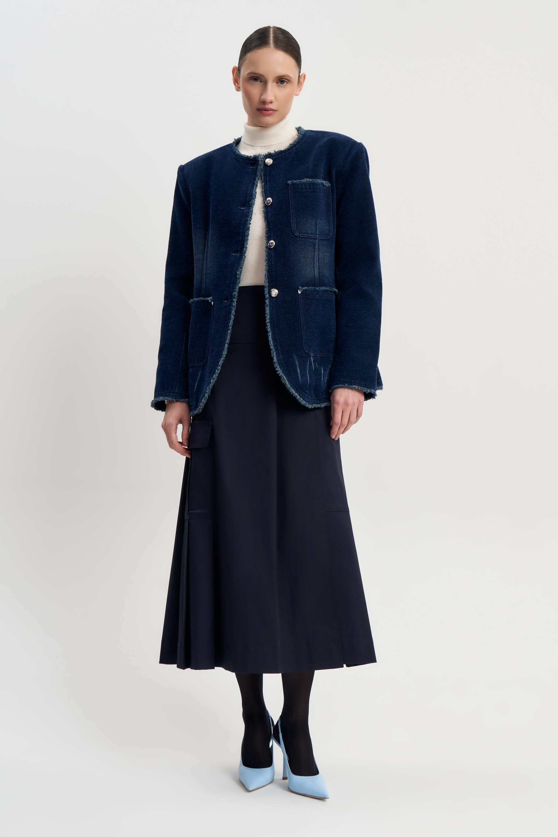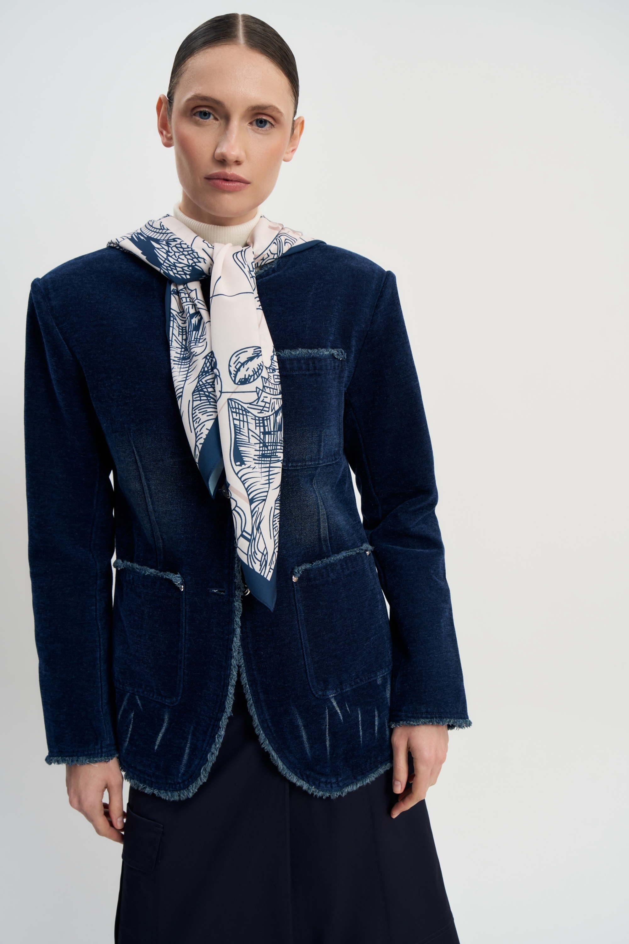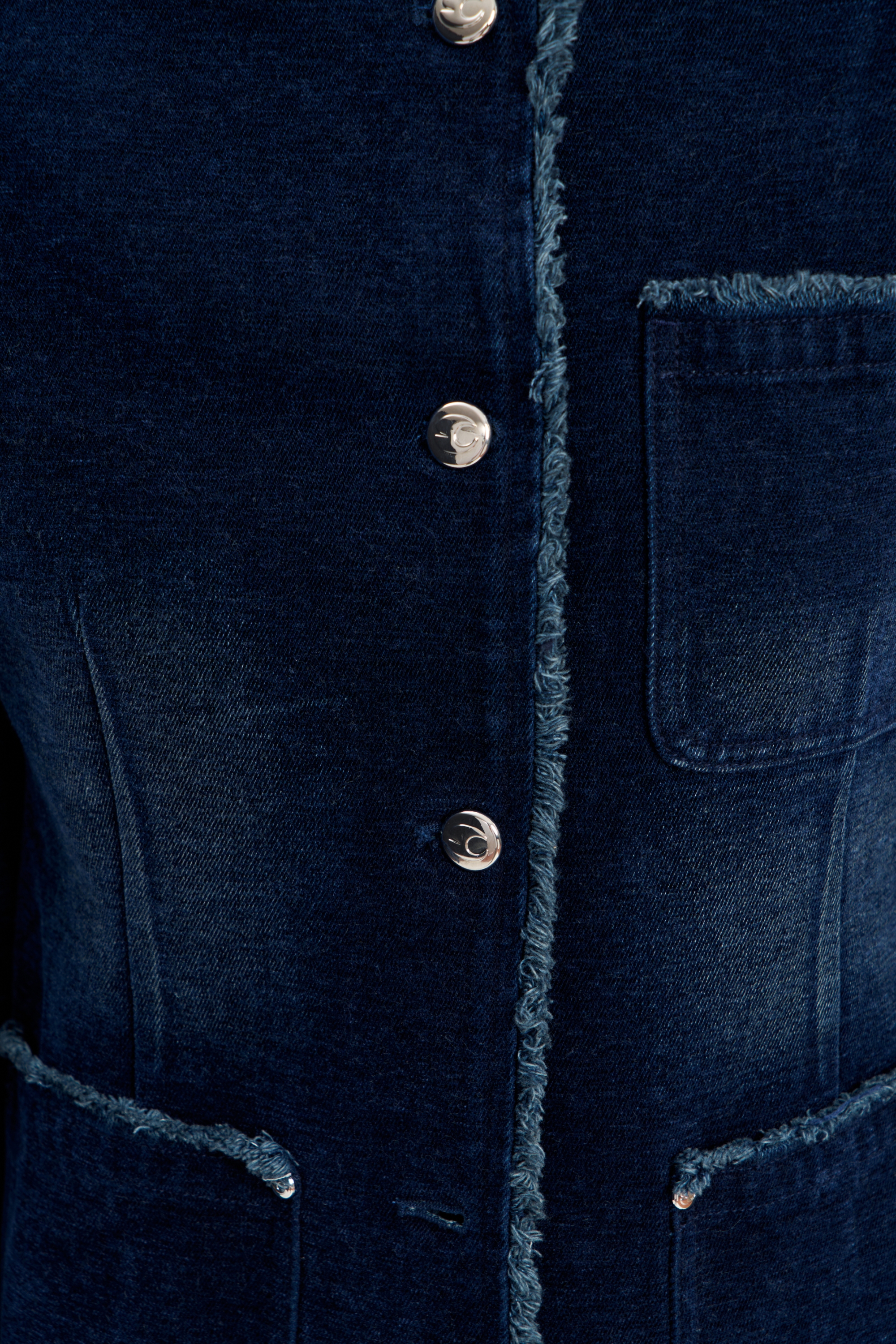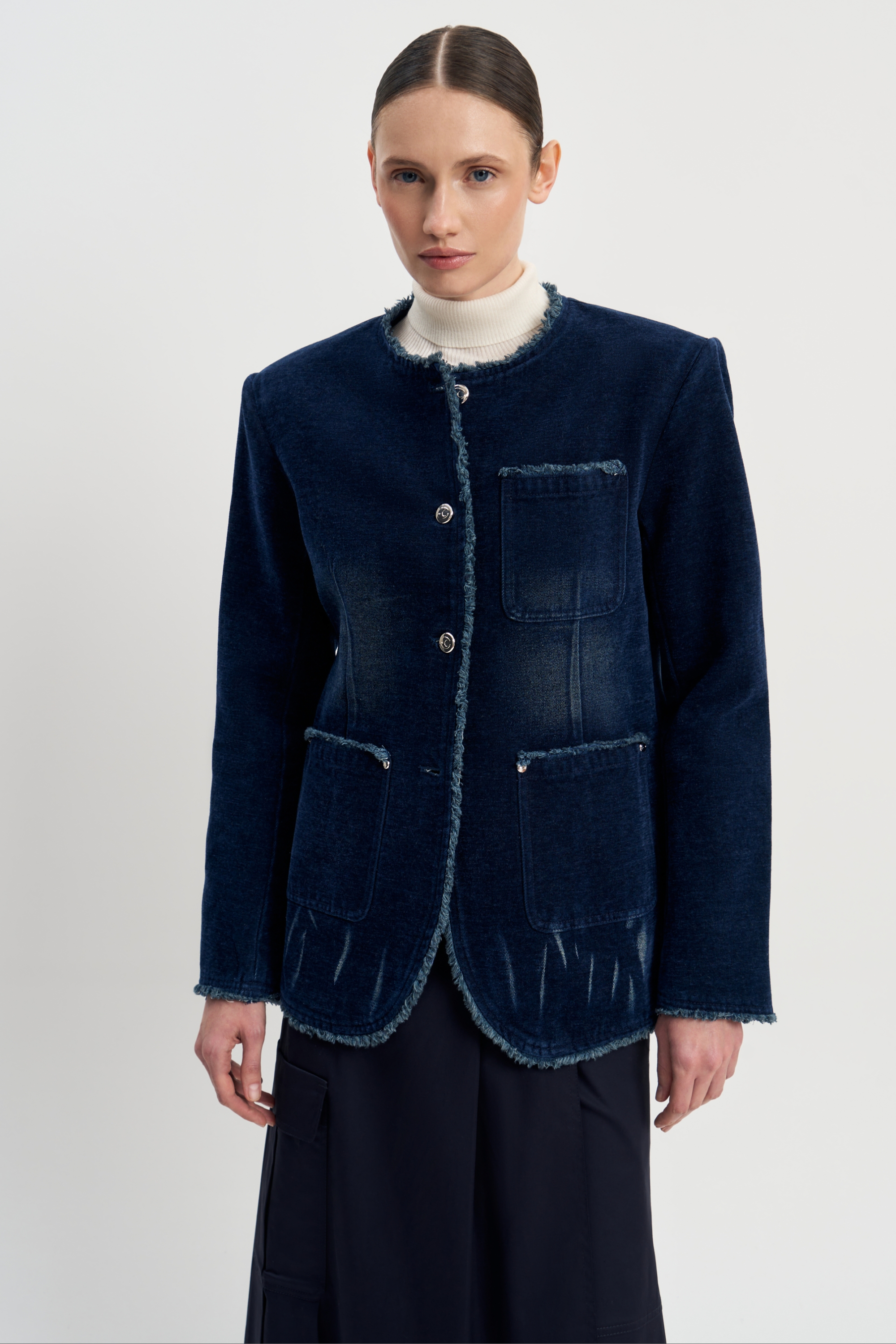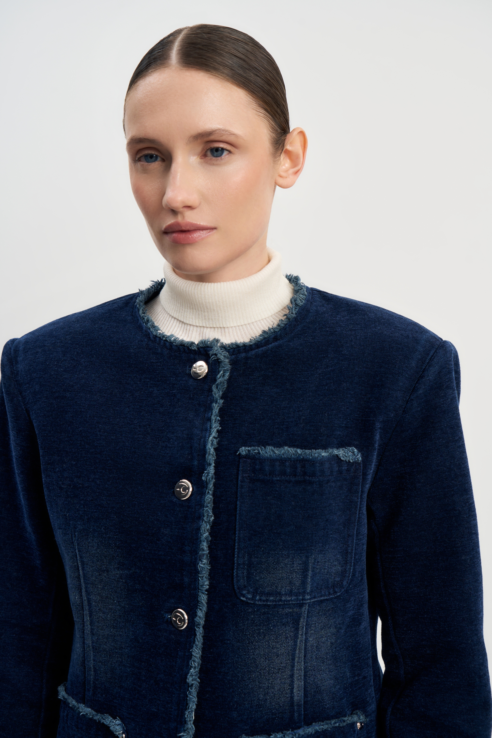 Мягкий и комфортный жакет Круиз из бархатной джинсы прекрасное решение для дневного выхода или поездки . Полы, горловина и карманы деликатно обработаны бахромой, что придает неформальный вид. Жакет очень хорошо садится по фигуре, но выбрав размер побольше, можно носить его как Оверсайз.