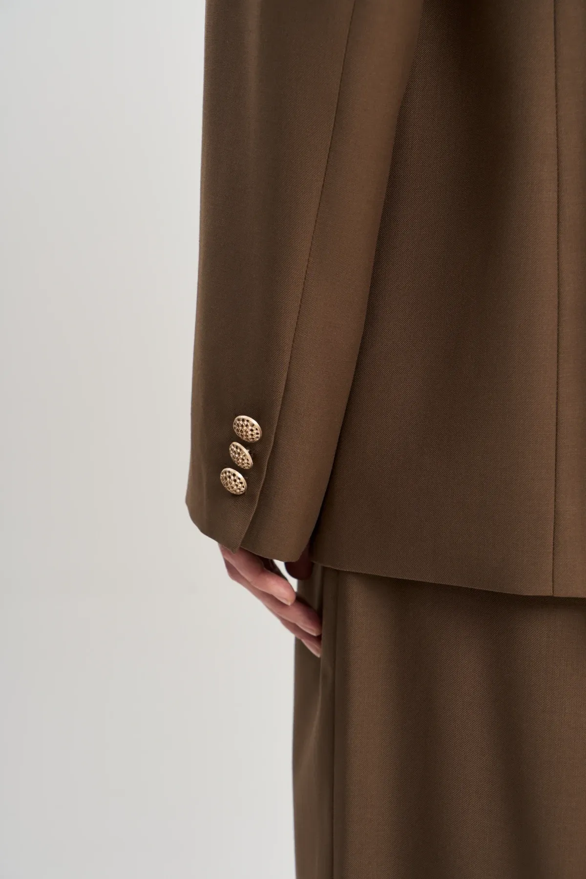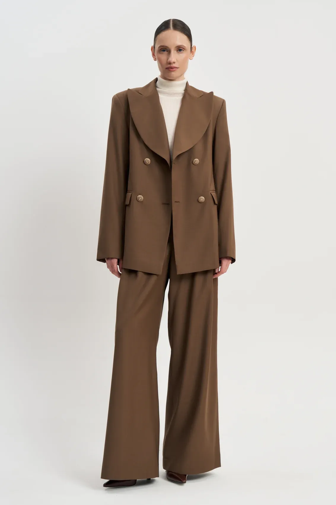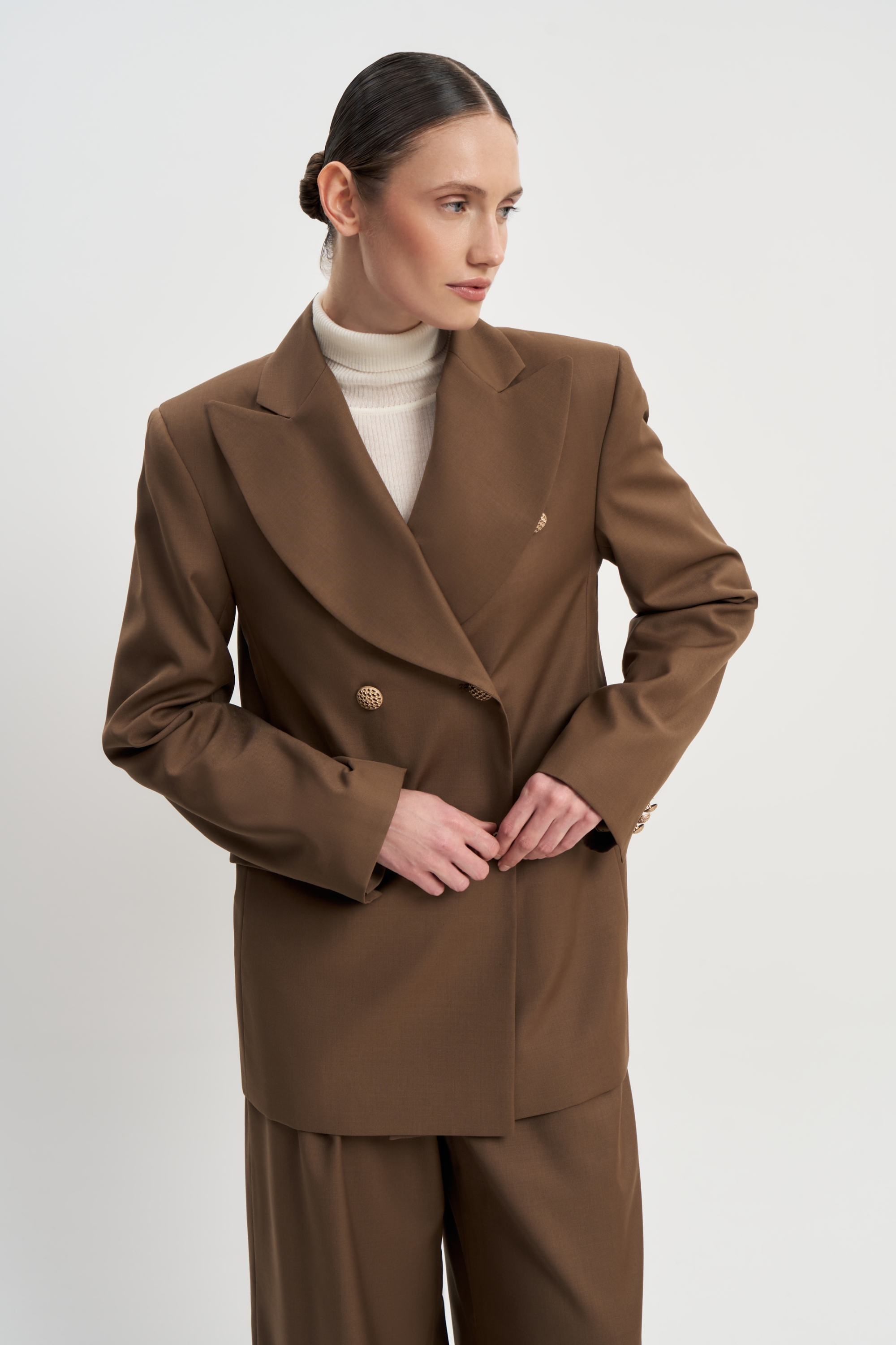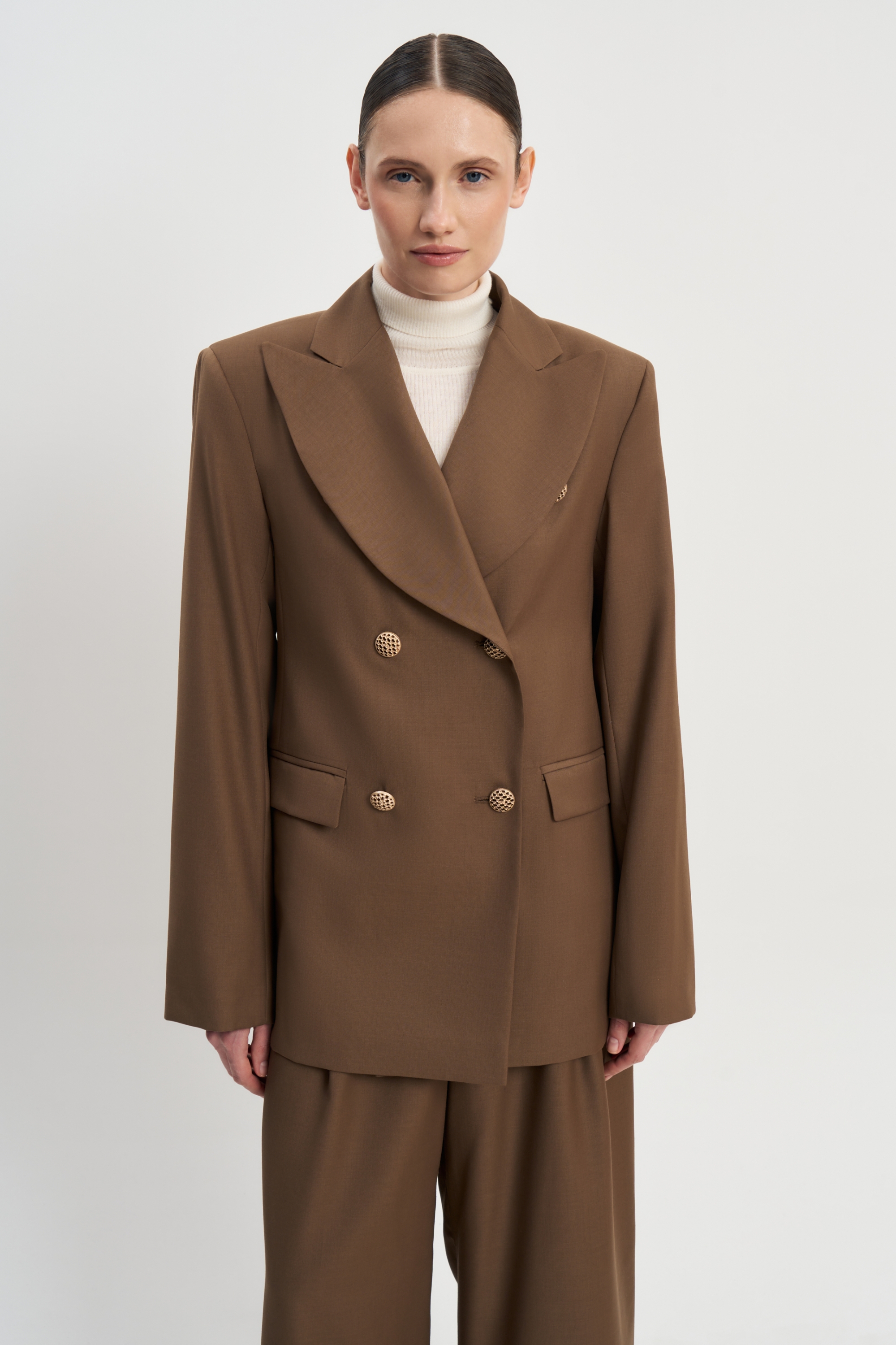 Роскошный оверсайз жакет Макси/Макси сразу привлекает внимание необычной формой лацканов и потрясающе красивыми золотыми пуговицами. В комплекте с широкими брюками Макси/Макси создается гламурный городской образ.