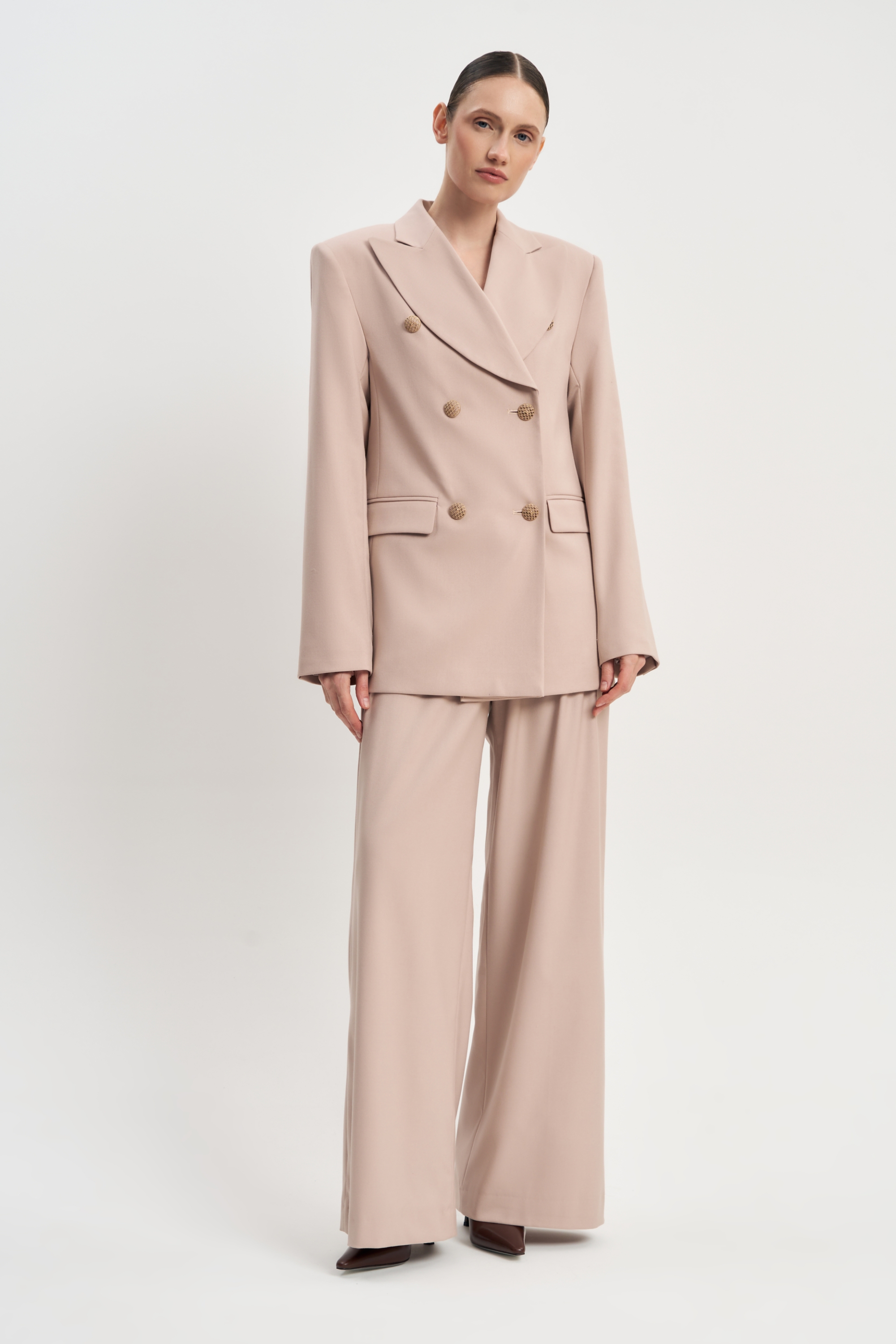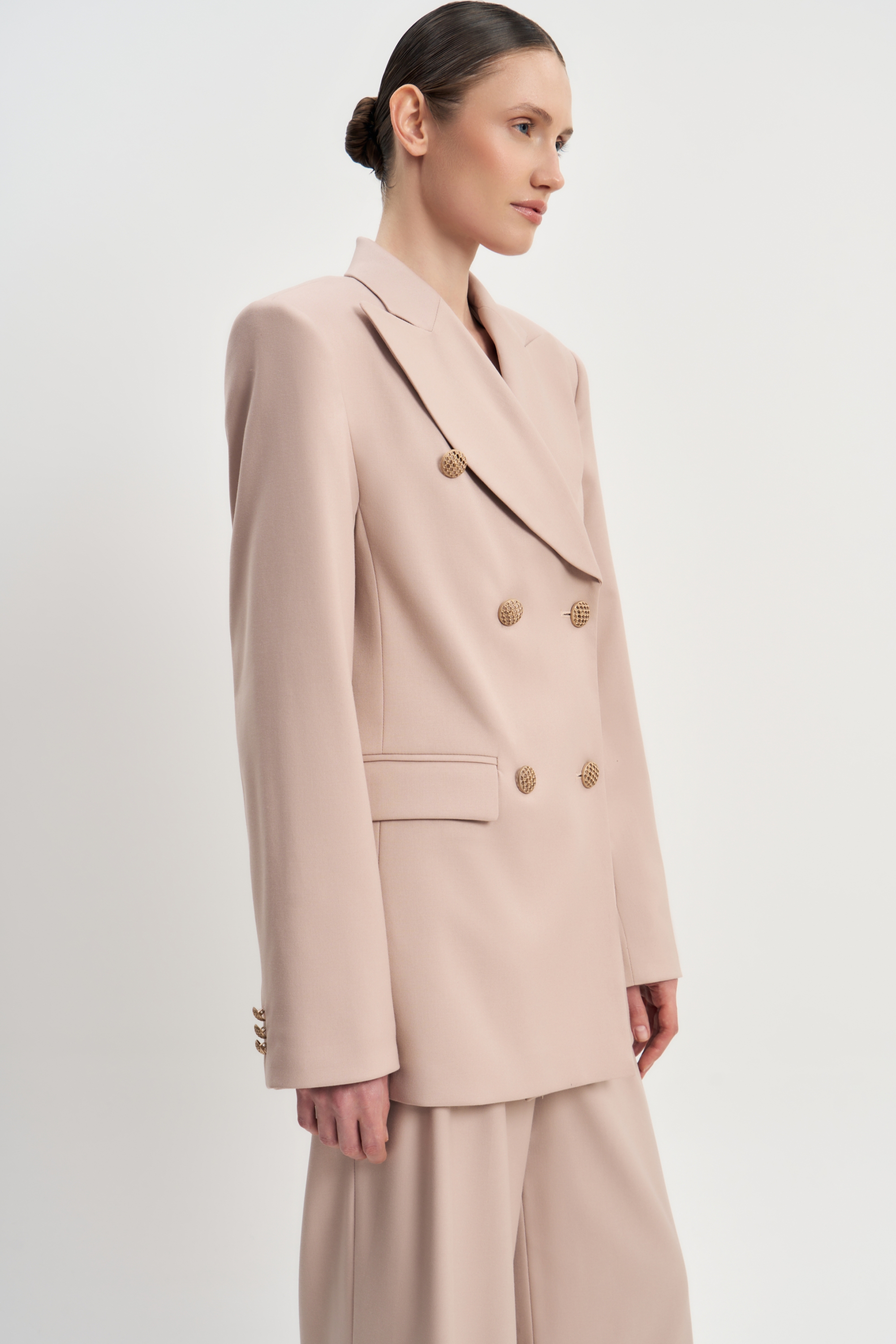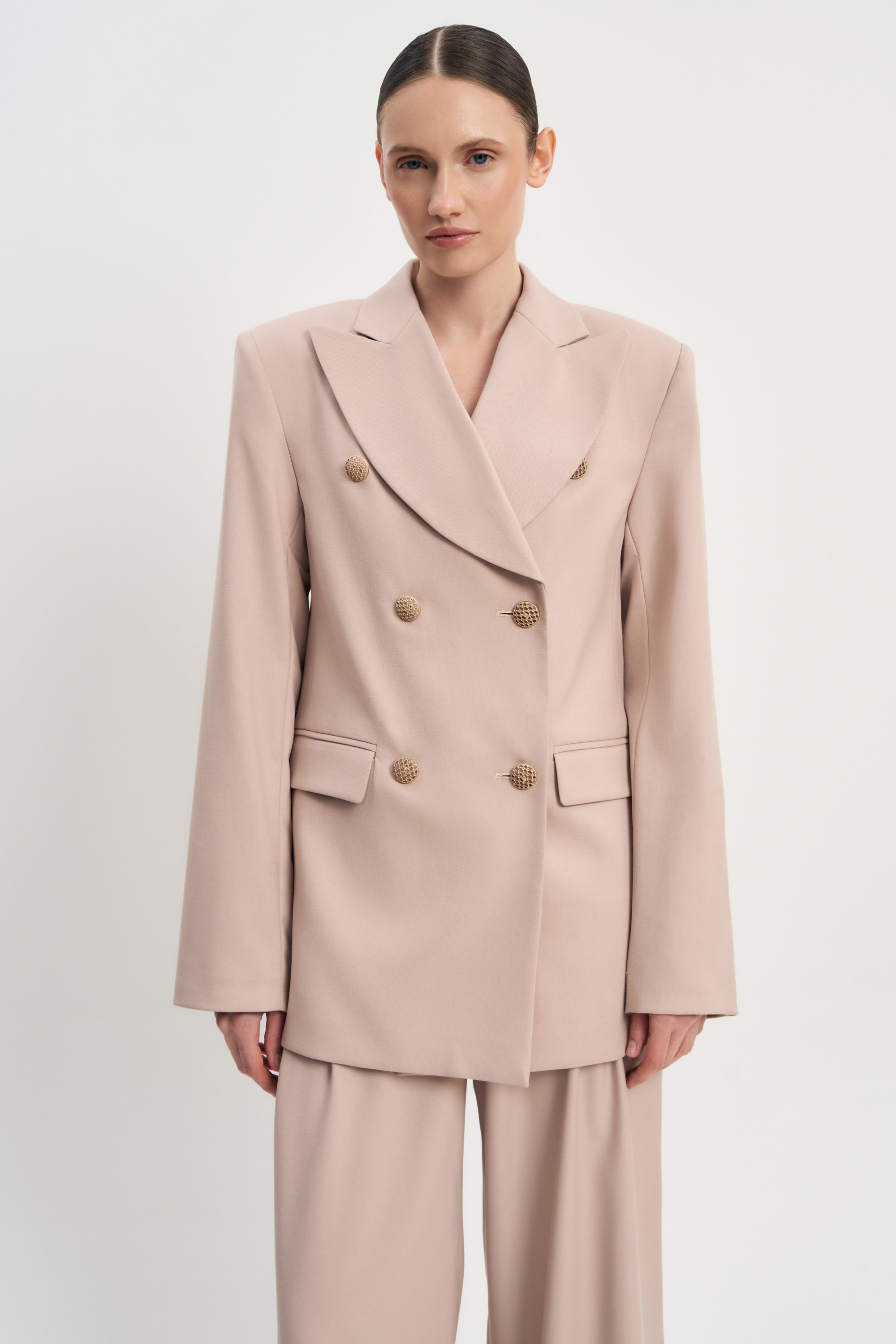 Роскошный оверсайз жакет Макси/Макси сразу привлекает внимание необычной формой лацканов и потрясающе красивыми золотыми пуговицами. В комплекте с широкими брюками Макси/Макси создается гламурный городской образ.