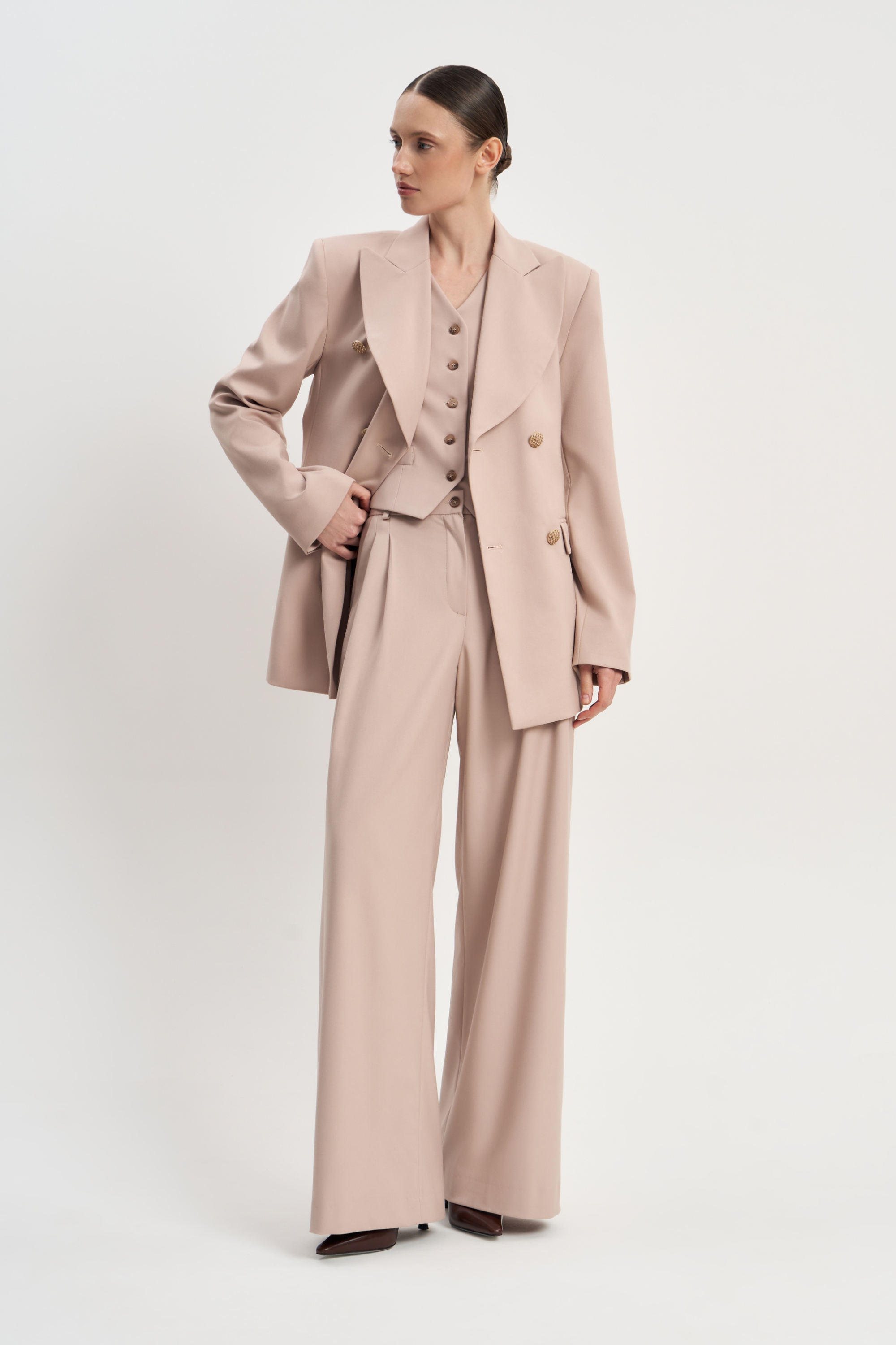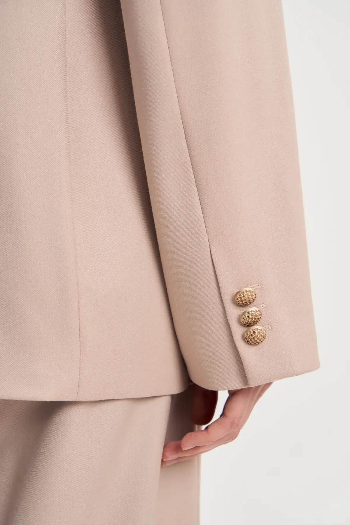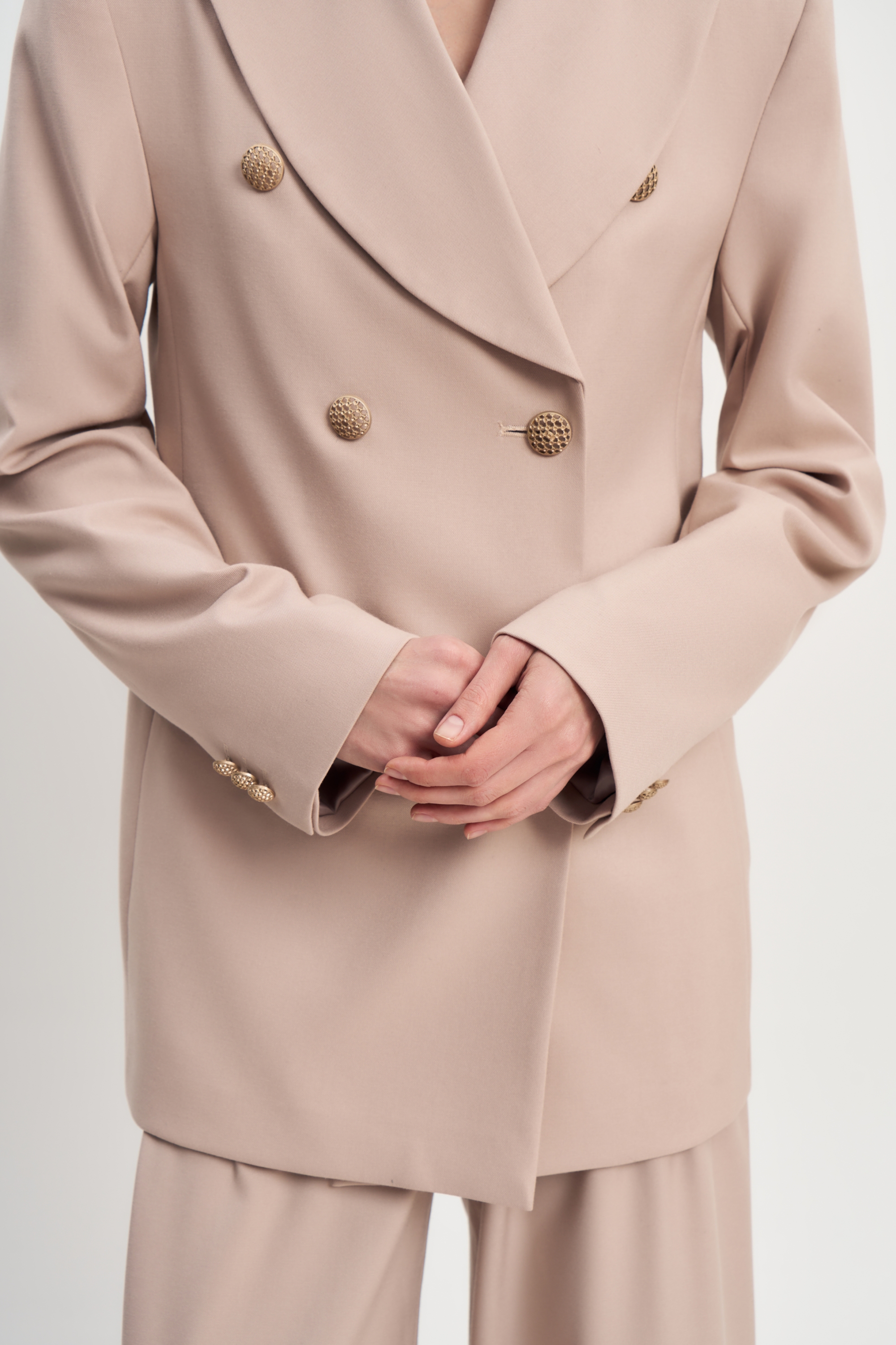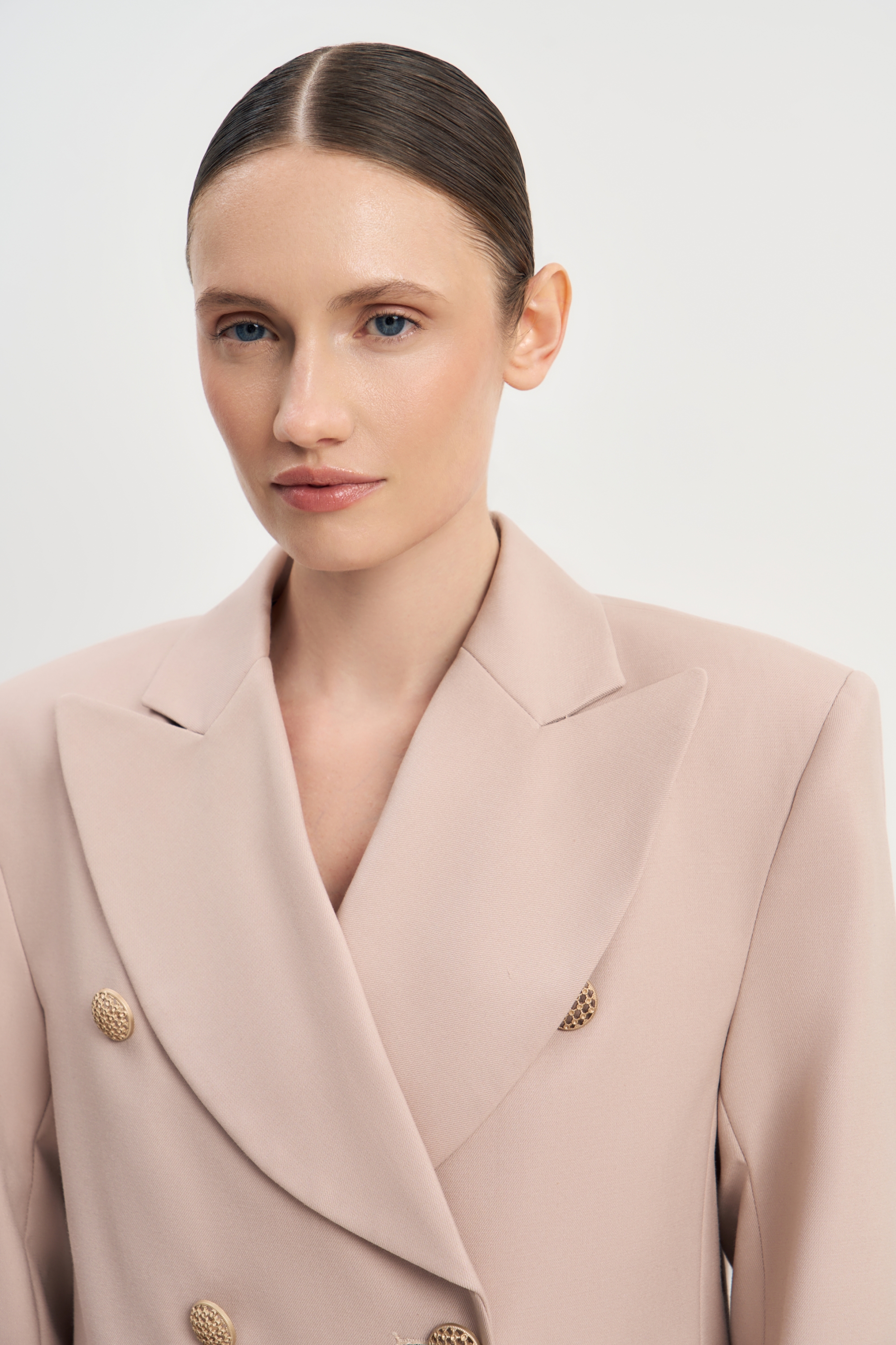 Роскошный оверсайз жакет Макси/Макси сразу привлекает внимание необычной формой лацканов и потрясающе красивыми золотыми пуговицами. В комплекте с широкими брюками Макси/Макси создается гламурный городской образ.