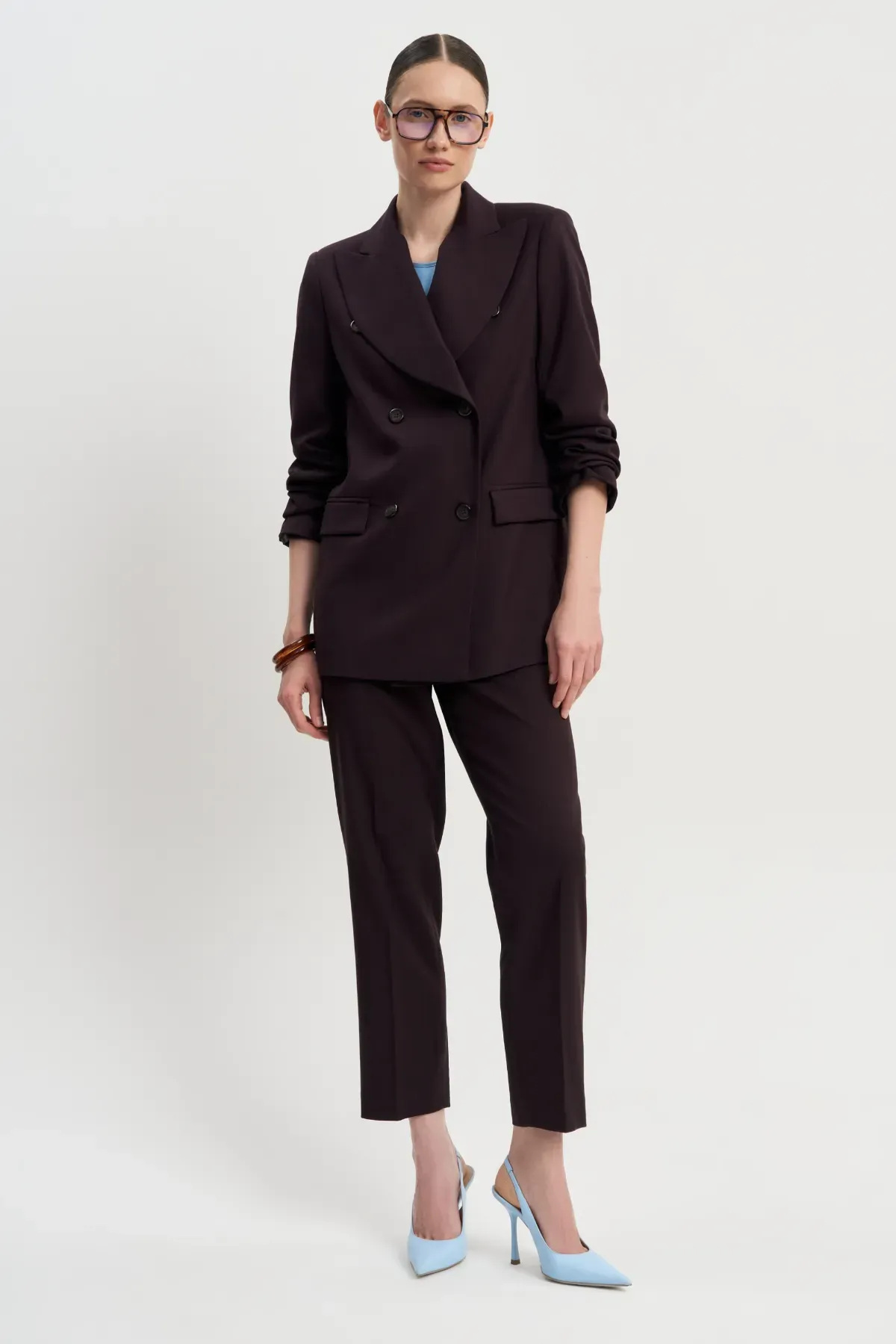 Двубортный жакет Шоколад глубокого шоколадного цвета с необычно вырезанными лацканами точно не останется незамеченным. Вместе с брюками Шоколад создает роскошный образ для дня и вечера