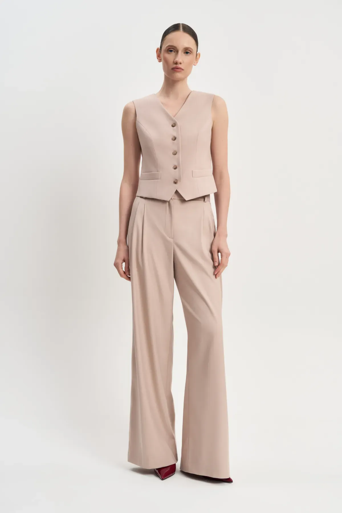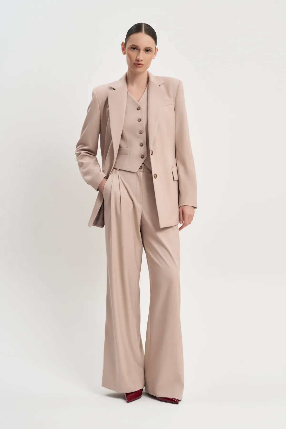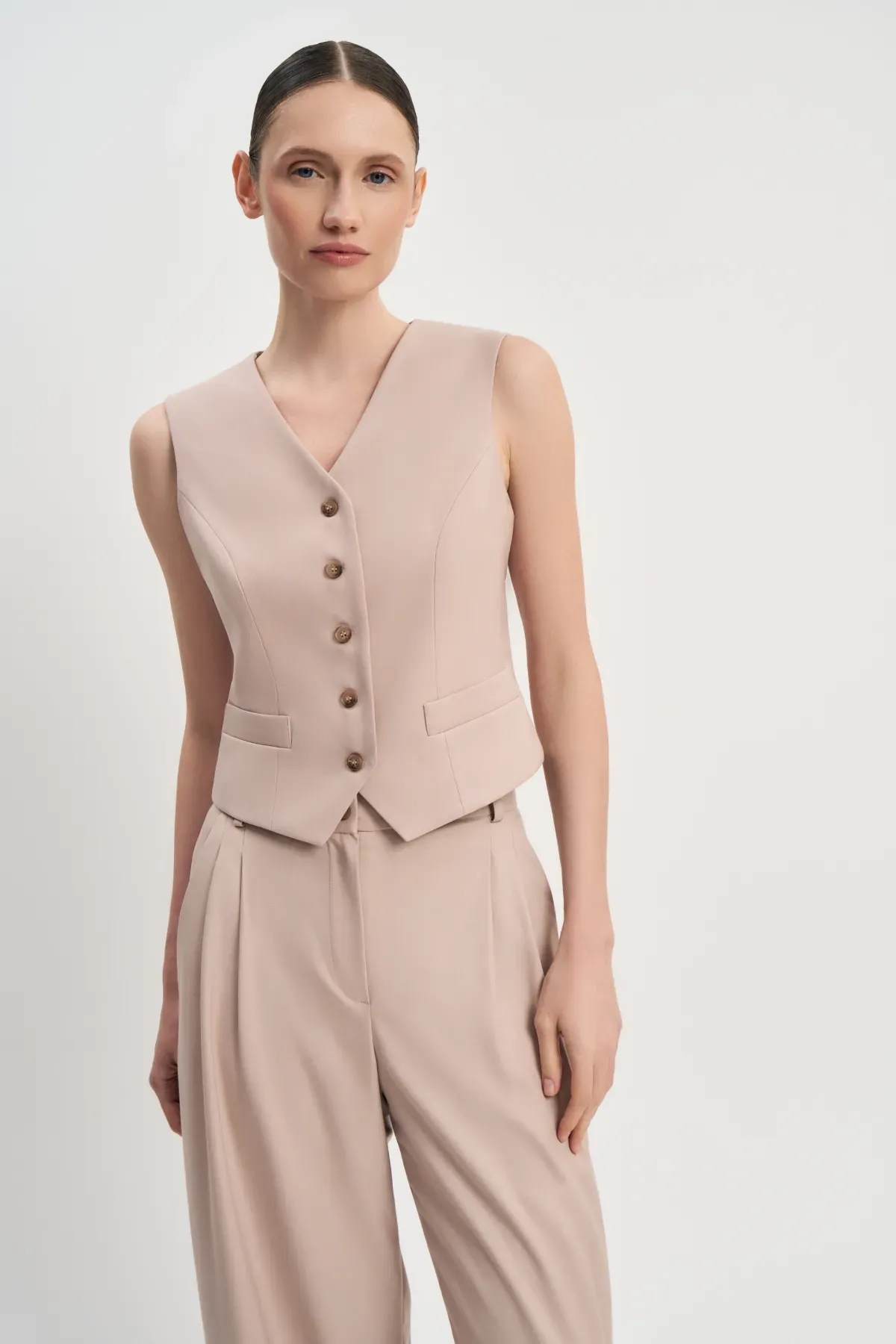 Жилет Денди с врезными кармашками на талии и хлястиком сзади прекрасно сидит на фигуре, подчеркивая достоинства ее обладательницы. Вместе с брюками Денди и пиджаком Денди создает элегантный городской образ.