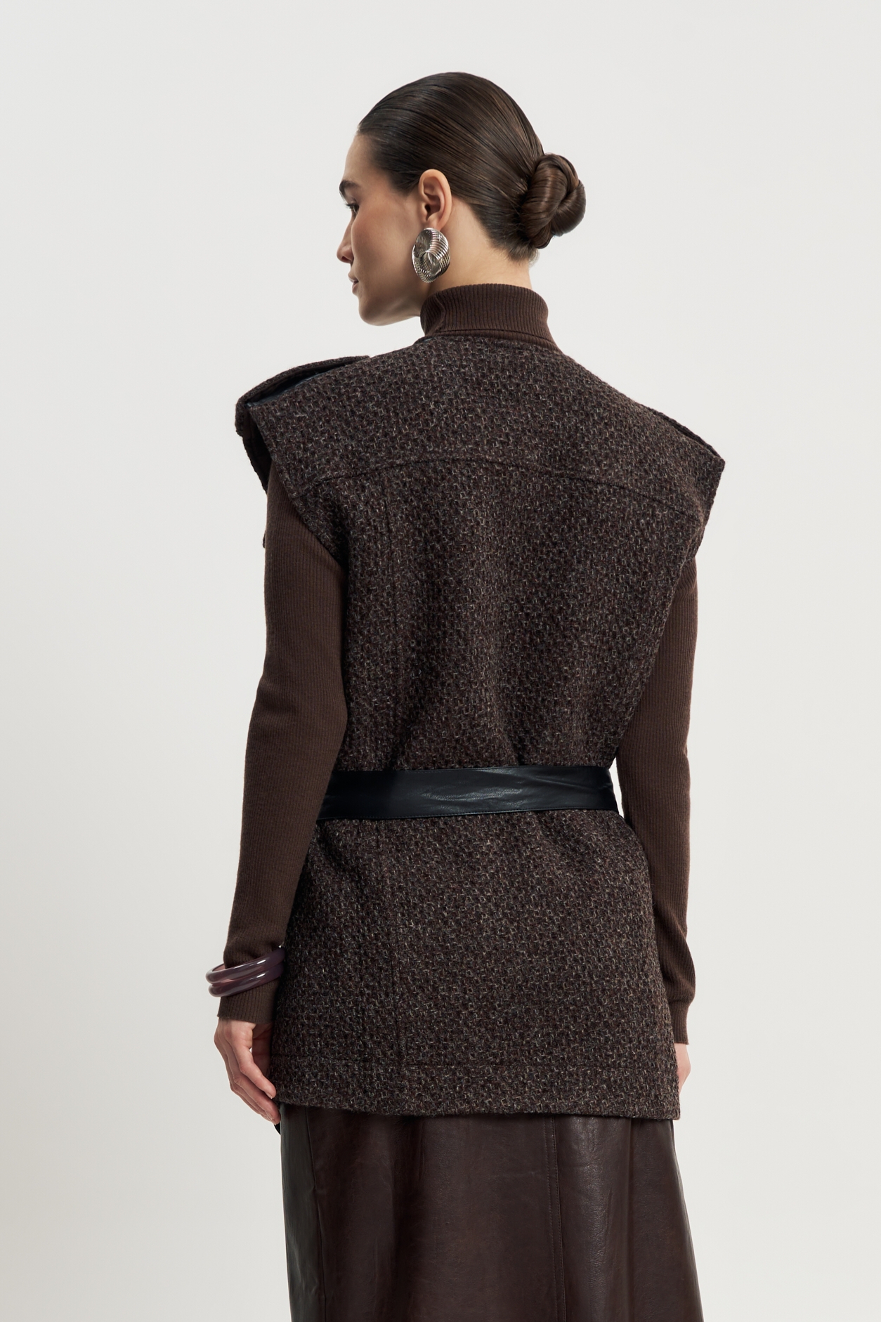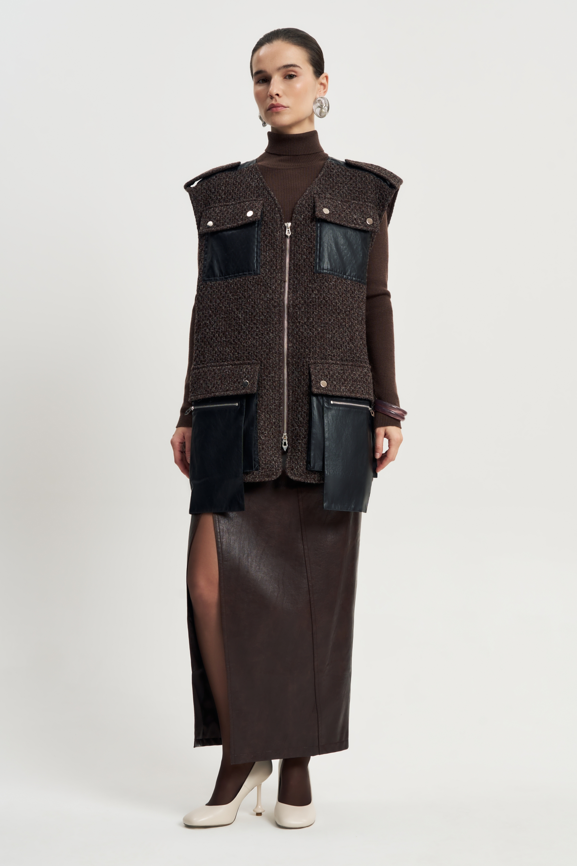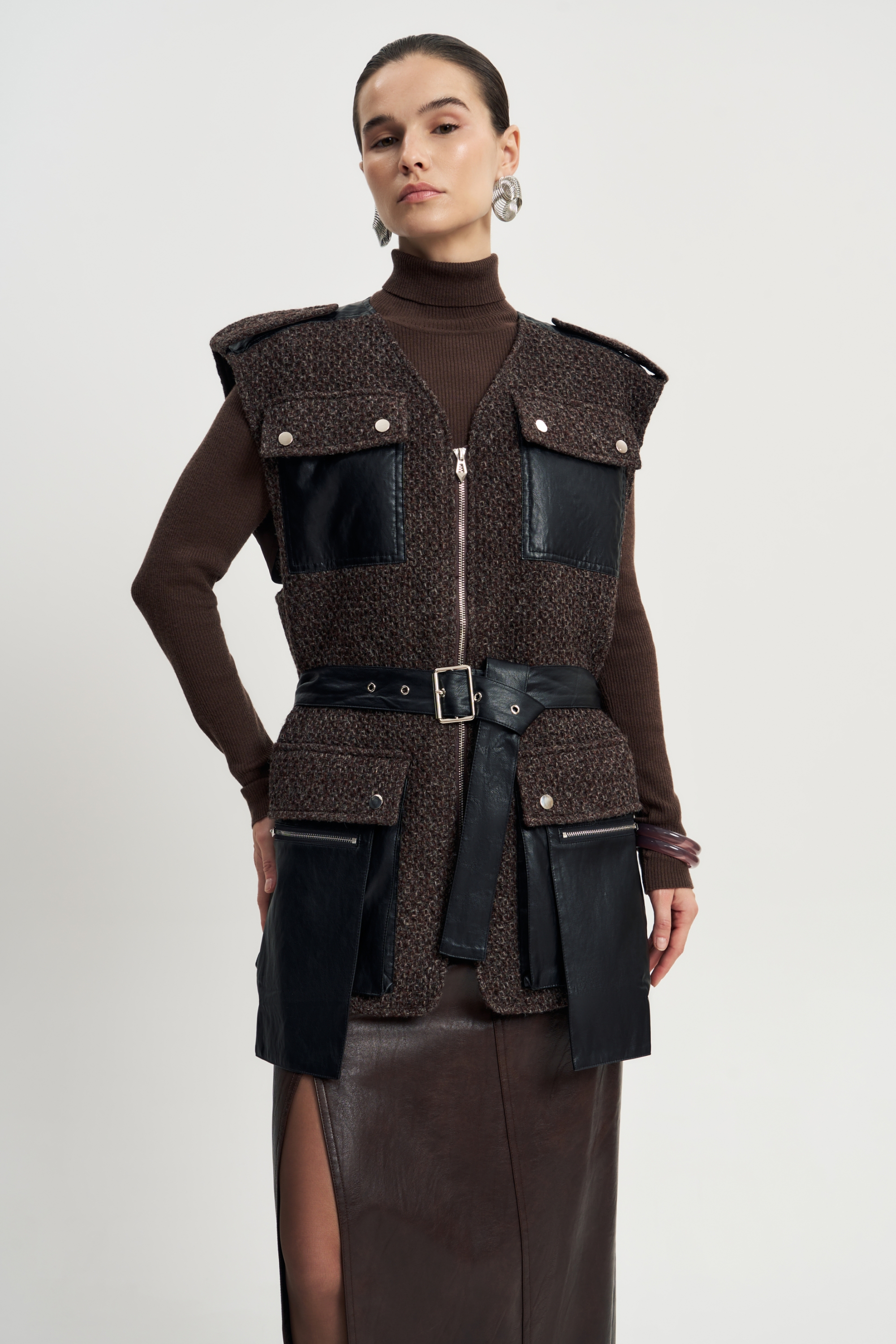Жесткая фактура коричневой шерсти, чёткий прямой крой, длина до середины бедра. Контрастные кожаные карманы — на груди и по нижнему краю — создают фокус и подчеркивают архитектурность вещи.